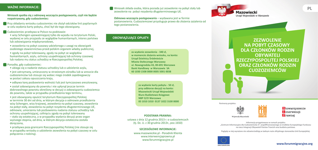 WAŻNE INFORMACJE: Wniosek spotka się z odmową wszczęcia postępowania, czyli nie będzie rozpatrywany, gdy cudzoziemiec: Przy składaniu wniosku cudzoziemiec nie złożył odcisków linii papilarnych w celu wydania karty pobytu, choć był do tego obowiązany. Cudzoziemiec przebywa w Polsce na podstawie: • wizy Schengen upoważniającej tylko do wjazdu na terytorium Polski, wydanej w celu przyjazdu ze względów humanitarnych, interes państwa lub zobowiązania międzynarodowe, • zezwolenia na pobyt czasowy udzielonego z uwagi na obowiązek osobistego stawiennictwa przed polskim organem władzy publicznej, • zgody na pobyt tolerowany, zgody na pobyt ze względów humanitarnych, azylu, ochrony uzupełniającej lub ochrony czasowej lub nadano mu status uchodźcy w Rzeczypospolitej Polskiej. Ponadto, gdy cudzoziemiec: • ubiega się o nadanie statusu uchodźcy lub o udzielenie azylu, • jest zatrzymany, umieszczony w strzeżonym ośrodku lub w areszcie dla cudzoziemców lub stosuje się wobec niego środek zapobiegawczy w postaci zakazu opuszczania kraju, • odbywa karę pozbawienia wolności lub jest tymczasowo aresztowany, • został zobowiązany do powrotu i nie upłynął jeszcze termin dobrowolnego powrotu określony w decyzji o zobowiązaniu cudzoziemca do powrotu, także w przypadku przedłużenia tego terminu, • jest obowiązany opuścić terytorium Rzeczypospolitej Polskiej w terminie 30 dni od dnia, w którym decyzja o odmowie przedłużenia wizy Schengen, wizy krajowej, zezwolenia na pobyt czasowy, zezwolenia na pobyt stały, zezwolenia na pobyt rezydenta długoterminowego UE, odmowie, umorzeniu lub pozbawieniu nadania statusu uchodźcy lub ochrony uzupełniającej, cofnięciu zgody na pobyt tolerowany – stała się ostateczna, a w przypadku wydania decyzji przez organ wyższego stopnia, od dnia, w którym decyzja ostateczna została doręczona, • przebywa poza granicami Rzeczypospolitej Polskiej (nie stosuje się w przypadku wniosku o udzielenie zezwolenia na pobyt czasowy w celu połączenia z rodziną). PL Wniosek składa osoba, która posiada już zezwolenie na pobyt stały lub zezwolenie na pobyt rezydenta długoterminowego UE. Odmowa wszczęcia postępowania – wydawana jest w formie postanowienia. Cudzoziemcowi przysługuje prawo do złożenia zażalenia od tego postanowienia. OBOWIĄZUJĄCE OPŁATY: ZEZWOLENIE NA POBYT CZASOWY DLA CZŁONKÓW RODZIN OBYWATELI RZECZYPOSPOLITEJ POLSKIEJ ORAZ CZŁONKÓW RODZIN CUDZOZIEMCÓW za wydanie zezwolenia - 340 zł, w momencie złożenia wniosku, na konto: Urząd Dzielnicy Śródmieście Miasta Stołecznego Warszawy ul. Nowogrodzka 43, 00-691 Warszawa Bank Handlowy w Warszawie SA 60 1030 1508 0000 0005 5001 0038 za wydanie karty pobytu - 50 zł, przy odbiorze decyzji na konto: Mazowiecki Urząd Wojewódzki Biuro Budżetowo-Księgowe NBP O/O Warszawa 83 1010 1010 0137 1022 3100 0000 PODSTAWA PRAWNA: ustawa z dnia 12 grudnia 2013 r. o cudzoziemcach (tj. Dz. U. z 30 grudnia 2013r., poz.1650) SZCZEGÓŁOWE INFORMACJE: www.mazowieckie.pl - Poradnik Klienta www.interwencjaprawna.pl www.forummigracyjne.pl Partnerzy projektu: Informacja przygotowana w ramach projektu „Centrum Informacyjne dla Cudzoziemców 2”, współfinansowanego ze środków Europejskiego Funduszu na rzecz Integracji Obywateli Państw Trzecich oraz budżetu państwa. Poglądy w niej wyrażone nie odzwierciedlają w żadnym razie oficjalnego stanowiska Unii Europejskiej. www.forummigracyjne.org ZEZWOLENIE NA POBYT CZASOWY DLA CZŁONKÓW RODZIN OBYWATELI RZECZYPOSPOLITEJ POLSKIEJ ORAZ CZŁONKÓW RODZIN CUDZOZIEMCÓW Wniosek o udzielenie zezwolenia składa się osobiście, nie później niż w ostatnim dniu legalnego pobytu na terytorium Polski. Od cudzoziemca ubiegającego się o udzielenie zezwolenia pobiera się odciski linii papilarnych. Jest to konieczny warunek, aby wniosek był rozpatrzony. Dokumenty należy złożyć w języku polskim, w oryginałach lub w kserokopii wraz z oryginałami do wglądu. Do dokumentów w języku obcym należy dołączyć tłumaczenia na język polski, dokonane przez tłumacza przysięgłego. Gdy wniosek dotyczy osoby małoletniej (poniżej 18 roku życia) – wniosek o udzielenie jej zezwolenia na pobyt rezydenta długoterminowego UE składają rodzice lub ustanowieni przez sąd opiekunowie albo jedno z rodziców lub jeden z ustanowionych przez sąd opiekunów. Fizyczna obecność dziecka w momencie składania wniosku jest konieczna, gdy dziecko ma skończone 6 lat. Kartę pobytu wydaną w związku z uzyskaniem zezwolenia cudzoziemiec jest zobowiązany odebrać osobiście. WYMAGANE DOKUMENTY: I II 4 egzemplarze wypełnionego zgodnie z pouczeniem wniosku o udzielenie zezwolenia na pobyt czasowy (czytelnie, w języku polskim, drukowanymi literami), 4 aktualne kolorowe fotografie o wymiarach 35x45 mm, wykonane na jednolitym jasnym tle, mające dobrą ostrość oraz pokazujące wyraźnie oczy i twarz od wierzchołka głowy do górnej części barków, tak aby twarz zajmowała 70-80% fotografii; fotografie maja przedstawiać osobę bez nakrycia głowy i okularów z ciemnymi szkłami, patrzącą na wprost z otwartymi oczami, nieprzesłoniętymi włosami, z naturalnym wyrazem twarzy i zamkniętymi ustami. Cudzoziemiec z wrodzonymi lub nabytymi wadami narządu wzroku może dołączyć fotografię przedstawiającą go w okularach z ciemnymi szkłami. W takim przypadku należy dołączyć dokumenty potwierdzające niepełnosprawność, a w przypadku ich braku oświadczenie cudzoziemca o niepełnosprawności. Cudzoziemiec noszący nakrycie głowy zgodnie z zasadami swojego wyznania może dołączyć fotografię w nakryciu głowy, o ile wizerunek twarzy jest w pełni widoczny. W takim przypadku należy dołączyć oświadczenie cudzoziemca o przynależności do wspólnoty wyznaniowej, III ważny dokument podróży (3 kserokopie), IV potwierdzenie zameldowania czasowego. BRAKI FORMALNE: Powyższe dokumenty są konieczne do rozpocz