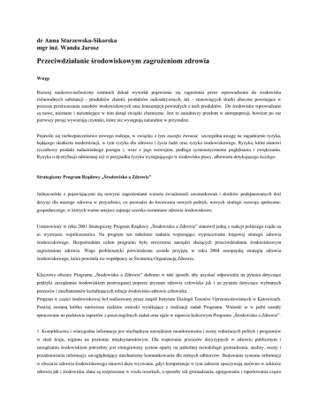dr Anna Starzewska-Sikorska mgr inż. Wanda Jarosz Przeciwdziałanie środowiskowym zagrożeniom zdrowia Wstęp Rozwój naukowo-techniczny ostatnich dekad wywołał pojawienie się zagrożenia przez wprowadzenie do środowiska różnorodnych substancji - produktów chemii, produktów radioaktywnych, itd. - stanowiących skutki uboczne powstające w procesie przetwarzania zasobów środowiskowych oraz konsumpcji powstałych z nich produktów. Do środowiska wprowadzane są nowe, nieznane i nieistniejące w nim dotąd związki chemiczne. Jest to zasadniczy przełom w antropopresji, bowiem po raz pierwszy presję wywierają czynniki, które nie występują naturalnie w przyrodzie. Pojawiło się niebezpieczeństwo nowego rodzaju, w związku z tym zaczęto zwracać szczególną uwagę na zagadnienie ryzyka, będącego skutkiem modernizacji, w tym ryzyka dla zdrowia i życia ludzi oraz ryzyka środowiskowego. Ryzyka, które stanowi ryczałtowy produkt industrialnego postępu i, wraz z jego rozwojem, podlega systematycznemu pogłębianiu i zwiększaniu. Ryzyka o dystrybucji odmiennej niż w przypadku ryzyka występującego w środowisku pracy, albowiem dotykającego każdego. Strategiczny Program Rządowy „Środowisko a Zdrowie” Jednocześnie z pojawiającymi się nowymi zagrożeniami wzrasta świadomość uwarunkowań i skutków podejmowanych dziś decyzji dla naszego zdrowia w przyszłości, co prowadzi do kreowania nowych polityk, nowych strategii rozwoju społecznogospodarczego, w których ważne miejsce zajmuje szeroko rozumiane zdrowie środowiskowe. Ustanowiony w roku 2001 Strategiczny Program Rządowy „Środowisko a Zdrowie” stanowił jedną z reakcji polskiego rządu na to wyzwanie współczesności. Na program ten nałożono zadania wspierające wypracowanie krajowej strategii zdrowia środowiskowego. Bezpośrednim celem programu było stworzenie narzędzi służących przeciwdziałaniu środowiskowym zagrożeniom zdrowia. Waga problematyki potwierdzona została przyjętą w roku 2004 europejską strategią zdrowia środowiskowego, która powstała we współpracy ze Światową Organizacją Zdrowia. Kluczowe obszary Programu „Środowisko a Zdrowie” dobrano w taki sposób, aby uzyskać odpowiedzi na pytania dotyczące praktyki zarządzania środowiskiem postrzeganej poprzez pryzmat zdrowia człowieka jak i na pytania dotyczące wybranych procesów i mechanizmów kształtujących relacje środowisko-zdrowie człowieka. Program w części środowiskowej był realizowany przez zespół Instytutu Ekologii Terenów Uprzemysłowionych w Katowicach. Poniżej zostaną krótko omówione niektóre wnioski wynikające z realizacji zadań Programu. Wnioski te w pełni zostały opracowane na podstawie raportów z poszczególnych zadań oraz ujęte w raporcie końcowym Programu „Środowisko a Zdrowie”. 1. Kompleksowa i wiarygodna informacja jest niezbędnym narzędziem monitorowania i oceny wdrażanych polityk i programów w skali kraju, regionu na poziomie międzynarodowym. Dla wspierania procesów decyzyjnych w zdrowiu publicznym i zarządzaniu środowiskiem potrzebny jest zintegrowany system oparty na jednolitej metodologii gromadzenia, analizy, oceny i przedstawiania informacji, uwzględniający mechanizmy komunikowania dla różnych odbiorców. Budowanie systemu informacji w obszarze zdrowia środowiskowego stanowi duże wyzwanie, gdyż kompetencje w tym zakresie spoczywają zarówno w sektorze zdrowia jak i środowiska, dane są rozproszone w wielu resortach, a sposoby ich gromadzenia, agregowania i raportowania często są nie zharmonizowane. Europejskie programy współpracy w dziedzinie ochrony środowiska, pilotowane przez organizacje i instytucje międzynarodowe, zalecają krajom europejskim wdrażanie koncepcji zdrowia środowiskowego. Podstawą działań na rzecz środowiska i zdrowia powinien być kompleksowy system informacyjny o środowiskowych uwarunkowaniach zdrowia. Wdrożenie skutecznych działań na rzecz środowiska i zdrowia, wymaga stworzenia w Polsce kompleksowego systemu informacji o narażeniu ludności na czynniki środowiska oraz zdrowotnych skutkach tego narażenia. Działania podjęte w Programie „Środowisko a Zdrowie” w tym zakresie mają charakter wyprzedzający w stosunku do realizowanej obecnie polityki zdrowia środowiskowego w Unii Europejskiej. Proponowane w pracy rozwiązania mogą być wdrożone w momencie przyjęcia wskaźników zdrowia środowiskowego do stosowania przez Komisję Europejską. Ogólnie zasób informacji niezbędnej do wdrożenia w Polsce jest dobry. Wymaganych jest jednakże szereg modyfikacji danych źródłowych, sposobów przetwarzania danych, rozwinięcie lub ulepszenie dostępnych zasobów informacyjnych, oraz sposobu przekazywania i udostępniania danych między kompetentnymi instytucjami. Dane o zdrowiu środowiskowym powinny w szczególności służyć komunikowaniu zagadnień zdrowia środowiskowego społeczeństwu. Wskaźniki są w tym przypadku bardzo dobrym narzędziem, które powinno być dalej rozwijane. Konieczne jest w tym względzie poszerzanie możliwości wykorzystania tego narzędzia zwłaszcza w kontekście rozwoju społeczeństwa informacyjnego przez rozwój dostępności elektronicznej. Konieczna jest integracja działań w zakresie merytorycznego nadzoru i współpracy w ramach strategii zdrowia środowiskowego Unii Europejskiej oraz aspektów technicznych systemu. 2. Aspekty zdrowotne powinny przenikać sfery zarządzania na szczeblu krajowym szczególnie w odniesieniu do dokumentów strategicznych zrównoważonego rozwoju. Proces kształtowania rozwoju jest wielowymiarowy i dynamiczny oraz zachodzi zawsze w obiektywnie występujących uwarunkowaniach zewnętrznych i wewnętrznych. Trwały i zrównoważony rozwój kraju jest przede wszystkim procesem zmierzania w kierunku ładu zintegrowanego wiążącego współzależnie ład instytucjonalnopolityczny, społeczny, gospodarczy, ekologiczny i prze