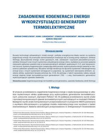 ZAGADNIENIE KOGENERACJI ENERGII WYKORZYSTUJĄCEJ GENERATORY TERMOELEKTRYCZNE ADRIAN CHMIELEWSKI1, KAMIL LUBIKOWSKI2, STANISŁAW RADKOWSKI3, MICHAŁ WIKARY4, JĘDRZEJ MĄCZAK5 Politechnika Warszawska Streszczenie Rozwój technologii odnawialnych źródeł energii i polityka energetyczna kładą nacisk na systemy kogeneracji energii. W przemyśle samochodowym inwestuje się w rozwój pomp cieplnych, silników Stirlinga, akumulatorów energii, turbin gazowych, mat, zawieszeń i wyciszeń piezoelektrycznych, silników liniowych oraz innych systemów odzyskiwania energii, która, wydalana w procesie spalania mieszanki paliwowo-powietrznej w konwencjonalnych silnikach spalinowych [1,2], jest bezpowrotnie tracona. Systemy kogeneracyjne zwiększają efektywność wykorzystania energii zawartej w mieszance paliwowo-powietrznej. Aktualnie istnieje tendencja do łączenia systemów mikrokogeneracji energii wraz z innymi systemami istniejącymi w pojeździe, np. systemami sterowania silnikiem, zasilania silnika, systemami bezpieczeństwa itp. [3-8]. Do jednego z takich sposobów należy odzysk energii cieplnej dzięki termoelektrycznym generatorom (TEG – z ang. thermoelectric generators) wykorzystującym zjawisko Seebecka. Słowa kluczowe: kogeneracja energii, termoelektryczne generatory, zjawisko Seebecka, silnik Stirlinga 1. Wstęp W artykule przedstawiono zagadnienie kogeneracji energii z ciepła dyssypowanego w układzie wydechowym silnika spalinowego przy wykorzystaniu generatorów termoelektrycznych, potocznie zwanych „Ogniwami Peltiera” [9]. W publikacji przedstawiono wyniki analiz i symulacji komputerowych zjawisk termoelektrycznych zachodzących w modułach Peltiera. Następnie wyniki analiz komputerowych przeprowadzonych w programie ANSYS porównano z wynikami obliczeniowymi z przyjętego modelu matematycznego oraz wynikami z badań stanowiskowych. Badania laboratoryjne przeprowadzono w Zintegrowanym Środowiskowo 1 Politechnika Warszawska, Wydział Samochodów i Maszyn Roboczych, Instytut Pojazdów, ul. Narbutta 84, 02-524 Warszawa, email: [email protected], tel. 22 234 81 18 2 Politechnika Warszawska, Wydział Samochodów i Maszyn Roboczych, Instytut Pojazdów, ul. Narbutta 84, 02-524 Warszawa, email: [email protected], tel. 22 234 81 18 3 Politechnika Warszawska, Wydział Samochodów i Maszyn Roboczych, Instytut Pojazdów, ul. Narbutta 84, 02-524 Warszawa, email: [email protected], tel. 22 234 81 18 4 Politechnika Warszawska, Wydział Samochodów i Maszyn Roboczych, Instytut Pojazdów, ul. Narbutta 84, 02-524 Warszawa, email: [email protected], tel. 22 234 81 18 5 Politechnika Warszawska, Wydział Samochodów i Maszyn Roboczych, Instytut Pojazdów, ul. Narbutta 84, 02-524 Warszawa, email: [email protected], tel. 22 234 81 18 134 Adrian Chmielewski, Kamil Lubikowski, Stanisław Radkowski, Michał Wikary, Jędrzej Mączak Laboratorium Systemów Mechatronicznych Pojazdów i Maszyn Roboczych na Wydziale Samochodów i Maszyn Roboczych Politechniki Warszawskiej, mieszczącym się przy ulicy Narbutta 84 w Warszawie. Należy wspomnieć, że w laboratorium w badaniach zagadnień dotyczących procesu kogeneracji energii wykorzystywane są: piezoelektryki, silnik Stirlinga a ostatnio silnik termo-akustyczny. Polityka energetyczna Komisji Europejskiej ma na celu zmniejszenie uzależnienia krajów UE od importowanej ropy naftowej i wytworzenia własnych lokalnych nośników energii, którymi mogą być biopaliwa [1]. W kwestiach technologii odnawialnych i polityki energetycznej kładziony jest nacisk na systemy kogeneracji energii. W dyrektywie 2009/28/WE z kwietnia 2009 roku wyraźnie określono wymagania stawiane państwom członkowskim Unii Europejskiej w sprawie promowania stosowania energii ze źródeł odnawialnych. Inwestuje się w rozwój pomp cieplnych, silników Stirlinga[2], akumulatorów energii, turbin gazowych w przemyśle samochodowym oraz systemów odzysku energii wydalanej w procesie spalania mieszanki paliwowo-powietrznej w konwencjonalnych silnikach spalinowych [9]. Jednym z takich sposobów jest odzyskiwanie energii cieplnej dzięki termoelektrycznym generatorom (TEG) [10-12] wykorzystującym zjawisko Seebecka. Przeprowadzając prace naukowo-badawcze na termoelektrycznych generatorach, jako przetwornikach energii, opracowano parametry pracy termoelektrycznych generatorów w sytuacji odzyskiwania energii elektrycznej z energii cieplnej dyssypowanej w silniku spalinowym w układzie wydechowym. Do zamodelowania i przeprowadzenia symulacji komputerowych wykorzystano środowisko elementów skończonych (MES) [13-14]. W opisie matematycznym ośrodka ciągłego obiekt jest traktowany jako model w przestrzeni euklidesowskiej, którego punkty identyfikuje się z materialnymi cząstkami ciała. Ciągłość [15] zostaje zamodelowana w sposób matematyczny, przy czym zakłada się ciągłość występujących w teorii funkcji z dopuszczalnym wyjątkiem na ograniczonej liczbie wewnętrznych powierzchni nieciągłości, oddzielających obszary ciągłe. W stosunku do modeli ciągłych, modele dyskretne umożliwiają modelowanie nieciągłości i rozdrobnienia materiału poprzez podejście do modelu jako złożenia skończonej liczby obiektów dyskretnych. Obecnie modele dyskretne można budować na różnych poziomach obserwacji (makro/mikro/nano) z punktu widzenia struktury materiału. 2. Analiza termogeneratora elektrycznego (stan ustalony) Głównym zadaniem doświadczenia jest przeanalizowanie komercyjnego modułu Peltiera, wykorzystując metodę elementów skończonych, następnie porównanie z modelem matematycznym, wynikami empirycznymi oraz komercyjnymi parametrami modułu. Typowym zadaniem termogeneratorów (z komercyjnego punktu widzenia), z którym można się obecnie spotkać, jest wygenerowanie i utrzymanie wymaganej temperatury Zagadnienie kogeneracji energii wykorzystującej generatory termoelektryczne 135 na odpowiednim poziomie (ujemnej lub dodatniej), za pomocą dostar