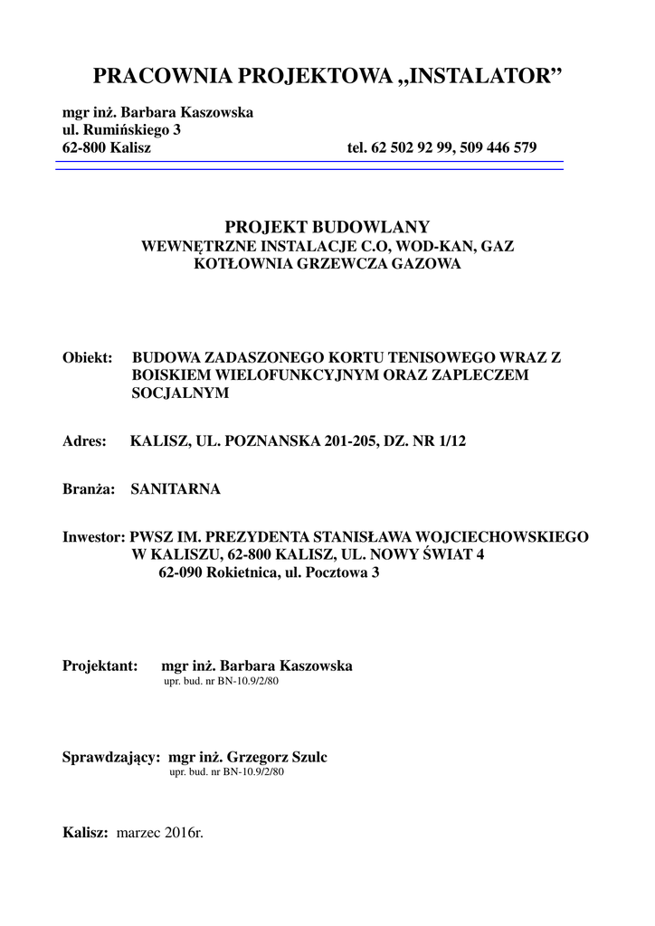 PRACOWNIA PROJEKTOWA „INSTALATOR” mgr inż. Barbara Kaszowska ul. Rumińskiego 3 62-800 Kalisz tel. 62 502 92 99, 509 446 579 PROJEKT BUDOWLANY WEWNĘTRZNE INSTALACJE C.O, WOD-KAN, GAZ KOTŁOWNIA GRZEWCZA GAZOWA Obiekt: BUDOWA ZADASZONEGO KORTU TENISOWEGO WRAZ Z BOISKIEM WIELOFUNKCYJNYM ORAZ ZAPLECZEM SOCJALNYM Adres: KALISZ, UL. POZNANSKA 201-205, DZ. NR 1/12 Branża: SANITARNA Inwestor: PWSZ IM. PREZYDENTA STANISŁAWA WOJCIECHOWSKIEGO W KALISZU, 62-800 KALISZ, UL. NOWY ŚWIAT 4 62-090 Rokietnica, ul. Pocztowa 3 Projektant: mgr inż. Barbara Kaszowska upr. bud. nr BN-10.9/2/80 Sprawdzający: mgr inż. Grzegorz Szulc upr. bud. nr BN-10.9/2/80 Kalisz: marzec 2016r. OŚWIADCZENIE Oświadczam, że projekt budowlany kotłowni grzewczej gazowej oraz wewnętrznych instalacji c.o., wod-kan, gaz dla zadania budowy zadaszonego kortu tenisowego wraz z boiskiem wielofunkcyjnym oraz zapleczem socjalnym na terenie PWSZ przy ul. Poznańskiej 201-205 w Kaliszu, działka nr 1/12, wykonany został zgodnie z zasadami wiedzy technicznej i obowiązującymi przepisami budowlanymi i normami. 2. Zawartość teczki: 1. Opis techniczny i obliczenia 2. Rysunki techniczne - rzut parteru – instalacja c.o., kotłownia - rzut parteru – instalacja wod-kan - rzut parteru – instalacja gazowa - schemat technologii kotłowni 3. – rys. nr S-1 – rys. nr S-2 – rys. nr S-3 – rys. nr S-4 OPIS TECHNICZNY do projektu budowlanego wewnętrznych instalacji c.o., wod-kan, gaz oraz kotłowni grzewczej gazowej dla projektowanej budowy zadaszonego kortu tenisowego wraz z boiskiem wielofunkcyjnym oraz zapleczem socjalnym przy ul. Poznańskiej 201-205 w Kaliszu, dz. nr1/12 1. Podstawa opracowania - zlecenie i umowa z inwestorem - projekt budowlany branży architektoniczno-budowlanej - uzgodnienia międzybranżowe - normy i katalogi - rozporządzenie Ministra Infrastruktury z dnia 12.04.2002 r. w sprawie warunków technicznych, jakim powinny odpowiadać budynki i ich usytuowanie (Dz.U. nr 75 z dnia 15.06.2002r.). 2. Przedmiot i zakres opracowania - projekt budowlany wewnętrznej instalacji c.o. - projekt budowlany wewnętrznej instalacji wod-kan - projekt budowlany wewnętrznej instalacji gazowej - projekt budowlany technologii kotłowni gazowej, 3. Stan istniejący Budynek zaplecza socjalnego dla planowanej budowy zadaszonego kortu tenisowego wraz z boiskiem wielofunkcyjnym zlokalizowany będzie przy ul. Poznańskiej 201-205 w Kaliszu na działce nr 1/12. budynek będzie murowany, niepodpiwniczony, parterowy. Na terenie lokalizacji obiektu ułożony jest wodociąg średnicy Dn100, oraz przyłącze gazu dn32 do sąsiedniego budynku, które planowane są do przełożenia poza obręb budynku. Wodę zimną dla potrzeb projektowanego budynku przewiduje się podłączyć z istniejącego wodociągu średnicy Dn100, przekładanego poza budynek. Ścieki sanitarne z budynku można odprowadzić do istniejącej studni rewizyjnej, zlokalizowanej na kanalizacji sanitarnej Dn160 na terenie planowanego budynku. Zaopatrzenie w ciepło budynku projektuje się z własnej kotłowni gazowej na gaz ziemny. Kotłownia zlokalizowana zostanie na poziomie parteru z wejściem z wewnątrz. Instalacja gazowa dla potrzeb kotłowni doprowadzona zostanie do skrzynki gazowej, zamontowanej na zewnętrznej ścianie budynku. W skrzynce gazowej zamontowany zostanie kurek odcinający. Kurek główny z głowicą samozamykającą MAG-1 oraz gazomierz miechowy G-10, zamontowany zostanie na ścianie zewnętrznej zadaszonej części kortu tenisowego. Projekt przyłącza gazu do zaworu głównego, łącznie z wykonawstwem opracowane zostanie przez Zakład Gazowniczy w ramach umowy przyłączeniowej. 4. WEWNĘTRZNA INSTALACJA C.O. 1. Opis ogólny Podłączenie instalacji centralnego ogrzewania projektuje się z własnej kotłowni, zlokalizowanej na parterze budynku. Projekt technologii kotłowni zawarty jest w dalszej części opracowania. Instalację centralnego ogrzewania projektuje się na parametry 80/60 0 C. Rozprowadzenie przewodów instalacji c.o. projektuje się pod posadzką parteru, zgodnie z załączonym rzutem instalacji c.o.. Grzejniki projektuje się pod parapetami okien i przy ścianach w miejscach oznaczonych na załączonym rzucie parteru instalacji c.o.. Od dołu i od góry grzejnika przestrzeń winna wynosić min 10 cm. Podłączenia grzejników oddolne, wyposażone w zawory termostatyczne na zasilaniu i zawory odcinające na powrocie. Odwodnienie całego układu instalacji projektuje się w kotłowni, odpowietrzenie przez automatyczne zawory odpowietrzające na pionach i przy grzejnikach. 1.2. Rurociągi Przewody instalacji c.o. wykonać z rur miedzianych, łączonych przez spawanie elektryczne lub gazowe i za pomocą kształtek. Średnice przewodów opisano na rysunku rzutu parteru instalacji c.o. Izolację przewodów układanych pod posadzką, wykonać z pianki poliuretanowej grubości 13 mm. Instalacje wyposaża się w następującą armaturę: 1. zawory odcinające i osprzęt przy pompie obiegowej instalacji c.o. 2. zawory grzejnikowe termostatyczne, np. firmy Danfoss 3. zawory odcinające na gałązkach powrotnych 1.3. Grzejniki Jako elementy grzejne zastosowano grzejniki stalowe np. CosmoNova typu KV, z podłączeniem oddolnym i wbudowanym zaworem odpowietrzającym. 1.4. Próby instalacji i uruchomienie Instalację grzewczą należy napełnić powoli przy otwartych zaworach odpowietrzających. Zmontowaną instalację należy poddać próbie ciśnieniowej na zimno, wysokość ciśnienia próbnego 0,6 MPa w najwyższym punkcie instalacji. Po uzyskaniu dodatniego wyniku próby ciśnieniowej na zimno, należy instalację poddać próbie działania na gorąco. Próby należy przeprowadzić zgodnie wymaganiami technicznymi COBRTI INSTAL zeszyt nr 6 „Warunki techniczne wykonania i odbioru instalacji ogrzewczych”. 2. Obliczenia instalacji c.o. 2.1. Założenia do obliczeń 1. rodzaj ogrzewania – wodne, pompowe 2. obliczeniowa temp. wody dla