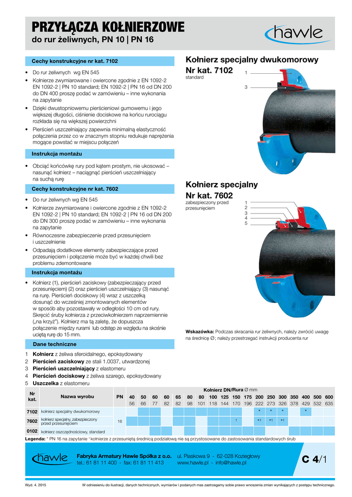 PRZYŁĄCZA KOŁNIERZOWE do rur żeliwnych, PN 10 | PN 16 Kołnierz specjalny dwukomorowy Nr kat. 7102 1 Cechy konstrukcyjne nr kat. 7102 • Do rur żeliwnych wg EN 545 • standard Kołnierze zwymiarowane i owiercone zgodnie z EN 1092-2 EN 1092-2 | PN 10 standard; EN 1092-2 | PN 16 od DN 200 do DN 400 proszę podać w zamówieniu – inne wykonania na zapytanie 3 • Dzięki dwustopniowemu pierścieniowi gumowemu i jego większej długości, ciśnienie dociskowe na końcu rurociągu rozkłada się na większej powierzchni • Pierścień uszczelniający zapewnia minimalną elastyczność połączenia przez co w znacznym stopniu redukuje naprężenia mogące powstać w miejscu połączeń Instrukcja montażu • Obciąć końcówkę rury pod kątem prostym, nie ukosować – nasunąć kołnierz – naciągnąć pierścień uszczelniający na suchą rurę Kołnierz specjalny Nr kat. 7602 Cechy konstrukcyjne nr kat. 7602 • Do rur żeliwnych wg EN 545 • zabezpieczony przed przesunięciem Kołnierze zwymiarowane i owiercone zgodnie z EN 1092-2 EN 1092-2 | PN 10 standard; EN 1092-2 | PN 16 od DN 200 do DN 300 proszę podać w zamówieniu – inne wykonania na zapytanie 1 2 3 4 5 • Równoczesne zabezpieczenie przed przesunięciem i uszczelnienie • Odpadają dodatkowe elementy zabezpieczające przed przesunięciem i połączenie może być w każdej chwili bez problemu zdemontowane Instrukcja montażu • Kołnierz (1), pierścień zaciskowy (zabezpieczający przed przesunięciem) (2) oraz pierścień uszczelniający (3) nasunąć na rurę. Pierścień dociskowy (4) wraz z uszczelką dosunąć do wcześniej zmontowanych elementów w sposób aby pozostawały w odległości 10 cm od rury. Skręcić śruby kołnierza z przeciwkołnierzem naprzemiennie („na krzyż”). Kołnierz ma tą zaletę, że dopuszcza połączenie między rurami lub odstęp ze względu na skośnie uciętą rurę do 15 mm. Wskazówka: Podczas skracania rur żeliwnych, należy zwrócić uwagę na średnicę Ø ; należy przestrzegać instrukcji producenta rur Dane techniczne 1 2 3 4 5 Kołnierz z żeliwa sferoidalnego, epoksydowany Pierścień zaciskowy ze stali 1.0037, utwardzonej Pierścień uszczelniający z elastomeru Pierścień dociskowy z żeliwa szarego, epoksydowany Uszczelka z elastomeru Nr kat. Kołnierz DN/Rura Ø mm Nazwa wyrobu PN 40 56 50 66 60 77 60 82 65 82 80 98 80 100 125 150 175 200 250 300 350 400 500 600 101 118 144 170 196 222 273 326 378 429 532 635 7102 kołnierz specjalny dwukomorowy specjalny, zabezpieczony 7602 kołnierz przed przesunięciem 16 1 * * * * * * 1 1 * 1 0102 kołnierz oszczędnościowy, standard Legenda: * PN 16 na zapytanie 1 kołnierze z przesuniętą średnicą podziałową nie są przystosowane do zastosowania standardowych śrub Fabryka Armatury Hawle Spółka z o.o. tel.: 61 81 11 400 - fax: 61 81 11 413 Wyd. 4. 2015 ul. Piaskowa 9 - 62-028 Koziegłowy www.hawle.pl - [email protected] C 4/1 W odniesieniu do ilustracji, danych technicznych, wymiarów i podanych mas zastrzegamy sobie prawo wnoszenia zmian wynikających z postępu technicznego. PRZYŁĄCZA KOŁNIERZOWE do rur żeliwnych, PN 10 | PN 16 Nr kat. 7102 / 0102 Nr kat. 0102 ØK ØD Nr kat. 7102 C L L ØD Kołnierz Rura ØK DN Ø mm 7102 0102 C L 7102 7102 0102 50 66 165 165 125 22 56 60 77 175 175 135 28 56 60 82 175 135 65 82 185 80 98 200 80 101 200 100 118 220 125 144 150 170 175 196 200 222 340 250 274 400 300 326 455 350 378 400 429 500 600 Śruby Masa kg 7102 0102 Ilość Gwint 4 M 16 1,8 35 4 M 16 3,1 35 4 M 16 4 M 16 3,4 8 M 16 2,6 8 M 16 2,4 2,4 2,4 145 29 58 160 22 64 160 22 64 220 180 23 62 38 8 M 16 2,8 3,8 250 250 210 24 66 42 8 M 16 4,2 5,3 285 285 240 25 66 45 8 M 20 4,7 7,0 315 270 46 8 M 20 6,8 340 295 30 71 45 8 M 20 7,6 10,5 350 32 78 12 M 20 10,9 455 400 33 82 12 M 20 13,8 510 460 61 16 M 20 23,0 580 515 61 16 M 24 22,0 22,5 532 690 620 74 20 M 24 35,0 636 776 730 74 20 M 27 38,0 570 200 37 103 38 3,1 ØK ØD Nr kat. 7602 C L Kołnierz DN Rura Ø mm ØD ØK C L 40* 56 150 110 26 50 66 165 125 60 77 175 65 82 80 Śruby Ilość Gwint Masa kg 58 4 M 16 1,6 60 71 4 M 16 2,9 135 60 73 4 M 16 3,2 185 145 63 79 4 M 16 3,7 98 200 160 59 76 8 M 16 3,9 100 118 220 180 60 78 8 M 16 4,6 125 144 250 210 62 85 8 M 16 6,0 150 170 285 240 87 98 8 M 20 9,3 200 222 340 295 90 105 8 M 20 14,0 250 274 400 355 90 105 12 M 20 17,5 300 326 455 405 90 105 12 M 20 21,7 * ZK - Kołnierz dwukomorowy z gwintowym kółkiem C 4/2 Fabryka Armatury Hawle Spółka z o.o. tel.: 61 81 11 400 - fax: 61 81 11 413 ul. Piaskowa 9 - 62-028 Koziegłowy www.hawle.pl - [email protected] W odniesieniu do ilustracji, danych technicznych, wymiarów i podanych mas zastrzegamy sobie prawo wnoszenia zmian wynikających z postępu technicznego. Wyd. 4. 2015