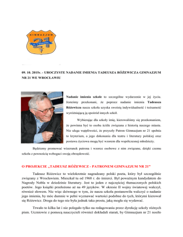 09. 10. 2015r. - UROCZYSTE NADANIE IMIENIA TADEUSZA RÓŻEWICZA GIMNAZJUM NR 21 WE WROCŁAWIU Nadanie imienia szkole to szczególne wydarzenie w jej życiu. Jesteśmy przekonani, że poprzez nadanie imienia Tadeusza Różewicza nasza szkoła uzyska swoistą indywidualność i tożsamość wyróżniającą ją spośród innych szkół. Wybierając dla szkoły imię, kierowaliśmy się przekonaniem, że powinna być to osoba ściśle związana z historią naszego miasta. Nie ulega wątpliwości, że przyszły Patron Gimnazjum nr 21 spełnia to kryterium, a jego dokonania dla teatru i literatury polskiej oraz postawa życiowa mogą być wzorem dla współczesnej młodzieży. Będziemy promować wizerunek patrona i wzorce osobowe z nim związane, dzięki czemu szkoła z pewnością wzbogaci swoją obrzędowość. O PROJEKCIE „TADEUSZ RÓŻEWICZ - PATRONEM GIMNAZJUM NR 21” Tadeusz Różewicz to wielokrotnie nagradzany polski poeta, który był szczególnie związany z Wrocławiem. Mieszkał tu od 1968 r. do śmierci. Był poważnym kandydatem do Nagrody Nobla w dziedzinie literatury. Jest to jeden z najczęściej tłumaczonych polskich poetów. Jego książki przełożono aż na 49 języków. W okresie II wojny światowej walczył, również słowem. Nic więc dziwnego w tym, że nasza szkoła postanowiła walczyć o nadanie jego imienia, by móc dumnie w pełni wyznawać wartości podobne do tych, którymi kierował się Różewicz. Droga do tego nie była jednak taka prosta, jaką mogła się wydawać. Trwało to kilka lat i nie polegało tylko na redagowaniu przez dyrekcję szkoły różnych pism. Uczniowie z pomocą nauczycieli również dokładali starań, by Gimnazjum nr 21 nosiło imię Tadeusza Różewicza. Zaczęło się od propagowania przez nauczycieli sylwetki poety. Język polski, historia, geografia, WOS, godzina wychowawcza – na tych zajęciach uczniowie poznawali jego twórczość. Następnie w szkole odbyło się wiele konkursów związanych z Różewiczem. Konkurs wiedzy o życiu i twórczości T. Różewicza, konkurs recytatorski, konkurs kaligraficzny, konkurs na folder, prezentację multimedialną, portret – to tylko nieliczne z działań, w które zostaliśmy zaangażowani. Zaraz potem do tego grona doszła współpraca z Teatrem Polskim, gdzie mieliśmy okazję przeprowadzić rozmowy na temat Różewicza z dyrektorem Krzysztofem Mieszkowskim, aktorami Tomaszem Lulkiem, Ewą Skibińską oraz Elżbietą Małecką z działu literackiego. Mieliśmy również przyjemność przeprowadzić rozmowę z członkiem rodziny poety - dr Małgorzatą Różewicz. W okolicy szkoły przeprowadziliśmy także sondę uliczną, by dowiedzieć się, jak bardzo jego twórczość jest znana okolicznym mieszkańcom. Później nagrany został wiersz w wykonaniu nauczycieli oraz innych pracowników szkoły. Zakończenie roku 2014/2015 również zostało poświęcone autorowi. Cała część artystyczna była skupiona na nim. W chwili obecnej w holu naszej szkoły, korytarzach oraz klasach znajdują się gazetki dotyczące Tadeusza Różewicza. 28 września 2015 r. odbyła się wycieczka do Karpacza, podczas której odwiedziliśmy grób poety. Cała społeczność szkolna niezmiernie się cieszy, że wszystkie formalności zostały dopełnione i już 9 października, w dniu urodzin poety, Gimnazjum nr 21 we Wrocławiu przyjmie jego imię, które z dumą będzie nosić. Tadeusz Różewicz był smakoszem - wywiad z dr Małgorzatą Różewicz - Tadeusz Różewicz był człowiekiem ciepłym. Czy okazywał to w relacjach rodzinnych? W relacjach rodzinnych był bardzo odpowiedzialny. Czuł się zobowiązany być odpowiedzialny za swoich bliskich. Zawsze roztaczał taką pieczę nad swoją rodziną. Pamiętajmy, że artyści są często ludźmi wycofanymi ze świata, bardzo egocentrycznymi. A on umiał w trudnych sytuacjach rodzinnych ten swój egocentryzm przezwyciężyć. - A jak to jest jeść obiad z Tadeuszem Różewiczem? Nic nadzwyczajnego. Zawsze przy obiedzie rozmawialiśmy. Albo na błahe, albo na dosyć ważne tematy. Tadeusz Różewicz był smakoszem. Poza tym jego żona fantastycznie gotuje. Dla mnie te spotkania były zupełnie normalne, tak jakbym jadła obiad z własnym mężem czy córką. - A czy te obiady jedzone wspólnie z rodziną były dla pana Różewicza ważne? Tak, tak, to była ceremonia. Bardzo też celebrował święta. Uwielbiał Boże Narodzenie. Zawsze kupował choinkę, świeżą oczywiście, żywe drzewko, jak to on mówił. Nie było w ogóle w domu sztucznej choinki. To był jego obowiązek i wielka radość, że ubierał choinkę. Cieszył się jak dziecko. - To jak wyglądała taka choinka Tadeusza Różewicza? Ozdoby robiliśmy sami. Były tam słodycze na przykład, do jakiegoś momentu były nawet prawdziwe świece, później sztuczne lampki. To był bardzo ważny obiekt w domu. Święta zawsze były z choinką. - A wnuczka? Jak wyglądały relacje Tadeusza Różewicza z wnuczką? Bardzo dobrze. Znakomicie, bo Tadeusz Różewicz zawsze chciał mieć córkę, a miał dwóch synów. Zatem relacje z Julką były wyjątkowe. On zresztą wkładał duży wysiłek w to, żeby te relacje były jak najbardziej naturalne. Myślę, że to zaowocowało, zaprocentowało, bo Julia była bardzo silnie z nim związana. Cieszył się też ze swojego prawnuka. - Rodzina Tadeusza Różewicza jest bardzo artystyczna. Jego wnuczka chyba też „pociągnęła” taką część „duchową”, prawda? W domu bardzo ważne były książki i ich czytanie. Właściwie nie było dnia bez lektury. W moim domu i w domu moich teściów. Więc to raczej nie obowiązek, tylko zwykła rzecz. Jak oddychanie. - Czy pamięta Pani jakąś historię, kiedy Różewicz rozśmieszył Panią? Hmm… on potrafił z siebie kpić na przykład. Był niewysokiego wzrostu. Ja też jestem niewysokiego wzrostu. I sam siebie nazwał kucykiem. Miał niezbyt długie ręce, niezbyt długie nogi, zupełnie ja