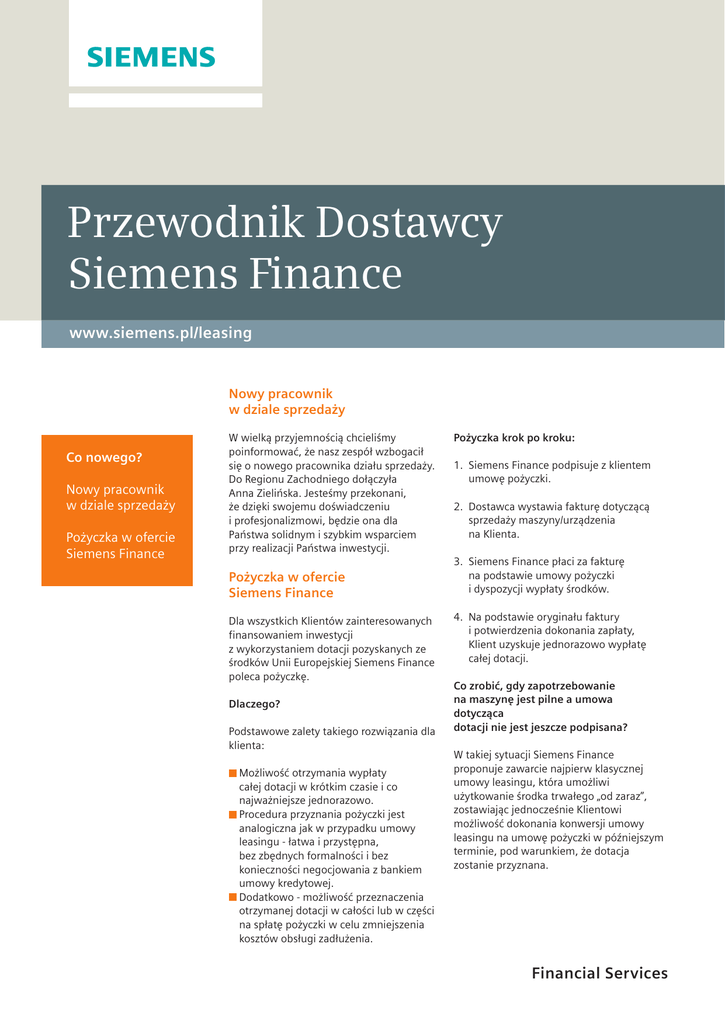 s Przewodnik Dostawcy Siemens Finance www.siemens.pl/leasing Nowy pracownik w dziale sprzedaży Co nowego? Nowy pracownik w dziale sprzedaży Pożyczka w ofercie Siemens Finance W wielką przyjemnością chcieliśmy poinformować, że nasz zespół wzbogacił się o nowego pracownika działu sprzedaży. Do Regionu Zachodniego dołączyła Anna Zielińska. Jesteśmy przekonani, że dzięki swojemu doświadczeniu i profesjonalizmowi, będzie ona dla Państwa solidnym i szybkim wsparciem przy realizacji Państwa inwestycji. Pożyczka w ofercie Siemens Finance Dla wszystkich Klientów zainteresowanych finansowaniem inwestycji z wykorzystaniem dotacji pozyskanych ze środków Unii Europejskiej Siemens Finance poleca pożyczkę. Dlaczego? Podstawowe zalety takiego rozwiązania dla klienta: ożliwość otrzymania wypłaty M całej dotacji w krótkim czasie i co najważniejsze jednorazowo. Procedura przyznania pożyczki jest analogiczna jak w przypadku umowy leasingu - łatwa i przystępna, bez zbędnych formalności i bez konieczności negocjowania z bankiem umowy kredytowej. Dodatkowo - możliwość przeznaczenia otrzymanej dotacji w całości lub w części na spłatę pożyczki w celu zmniejszenia kosztów obsługi zadłużenia. Pożyczka krok po kroku: 1. S iemens Finance podpisuje z klientem umowę pożyczki. 2. D ostawca wystawia fakturę dotyczącą sprzedaży maszyny/urządzenia na Klienta. 3. S iemens Finance płaci za fakturę na podstawie umowy pożyczki i dyspozycji wypłaty środków. 4. N a podstawie oryginału faktury i potwierdzenia dokonania zapłaty, Klient uzyskuje jednorazowo wypłatę całej dotacji. Co zrobić, gdy zapotrzebowanie na maszynę jest pilne a umowa dotycząca dotacji nie jest jeszcze podpisana? W takiej sytuacji Siemens Finance proponuje zawarcie najpierw klasycznej umowy leasingu, która umożliwi użytkowanie środka trwałego „od zaraz”, zostawiając jednocześnie Klientowi możliwość dokonania konwersji umowy leasingu na umowę pożyczki w późniejszym terminie, pod warunkiem, że dotacja zostanie przyznana. Financial Services Ekspert w leasingu maszyn f inansowanie do 10 lat decyzja kredytowa do równowartości 125.000 euro kwoty finansowania w ciągu 30 minut decyzja kredytowa do równowartości 1.000.000 euro kwoty finansowania w ciągu 48 godzin bez zaświadczeń z US i ZUS sugerowana minimalna wartość przedmiotu 100.000 złotych netto 0% opłaty wstępnej Współpraca z dostawcami wszystkich branż Współpraca z dostawcami wszystkich branż Sylwester Wildner tel. 0-660 445 511 fax (022) 870 86 89 [email protected] Kamil Sokołowski tel. 0-608 525 939 fax (022) 870 86 89 [email protected] Regionalny kierownik sprzedaży Bydgoszcz Gdańsk Hubert Rucki tel. 0-668 821 419 fax (022) 870 86 89 [email protected] Tomasz Socha tel. 0-608 010 253 fax (058) 322 78 80 [email protected] Regionalny kierownik sprzedaży Poznań Region Północny [email protected] Region Zachodni Region Centralny Region Południowy Anna Zielińska tel. 0-606 812 429 fax (022) 870 86 89 [email protected] Siemens Finance Sp. z o.o. ul. Żupnicza 11 03-821 Warszawa tel. (022) 870 86 81 fax (022) 870 86 89 www.siemens.pl/leasing [email protected] [email protected] Aneta Rudzińska tel. 0-608 645 983 fax (022) 870 86 89 [email protected] Paweł Działo tel. 0-608 645-870 fax (022) 870 86 89 Kraków Andrzej Bączek tel. 0-662 181 124 fax (012) 411 04 81 [email protected] Sebastian Trochimczuk tel. 0-668 821 414 fax (022) 870 86 89 Warszawa Błażej Gradkowski tel. 0-600 333 993 fax (022) 870 86 89 [email protected] [email protected] Wrocław [email protected] Warszawa Poznań Wrocław Warszawa Michał Wierzbowski tel. 0-604 969 900 fax (022) 870 86 89 Warszawa Jarosław Kubiszewski tel. 0-668 162 419 fax (061) 283 85 07 Kamil Dejnarowicz tel. 0-608 067 068 fax (095) 729 50 65 Regionalny kierownik sprzedaży [email protected] Regionalny kierownik sprzedaży Katowice Rafał Radoszewski tel. 0-600 371 918 fax (022) 870 86 89 [email protected] Rejestr Sąd Rejonowy dla m.st. Warszawy XIII Wydział Gospodarczy Krajowego Rejestru Sądowego Nr KRS 0000063579 Kapitał Zakładowy 58.500.000,00 PLN Kraków Beata Mierzwa tel. 0-608 010 256 fax (012) 452 21 48 [email protected] REGON 012002567 NIP 526-020-87-63 VAT UE PL5260208763 Rachunek bankowy 08 1030 1508 0000 0005 0186 6091 Infolinia handlowa: z telefonów stacjonarnych: 0801 502 402 z telefonów komórkowych: (089) 534 00 41