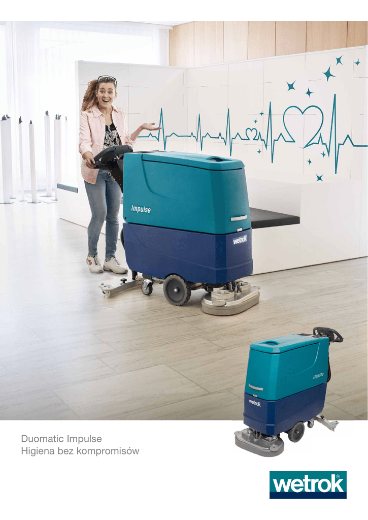 Duomatic Impulse Higiena bez kompromisów Duomatic Impulse: wysoki standard higieny Szorowarka Duomatic Impulse jest specjalnie zaprojektowana do użytku w szpitalach i domach spokojnej starości – ogólnie do miejsc wymagających zachowania wysokich standardów higieny. Zapewnia utrzymanie najwyższej higieny podłóg i jednocześnie sama jest łatwa w utrzymaniu: łatwo się ją czyści, przez co również zachowuje higieniczną czystość. Usuwa drobnoustroje za pomocą rygorystycznych metod obróbki: system dwuzbiornikowy zapewnia łatwe czyszczenie i eliminuje zarazem zanieczyszczenie wody. Filtr HEPA zapobiega rozprzestrzenianiu zanieczyszczeń w powietrzu wylotowym. Kolejna zaleta Duomatic Impulse: niewiarygodnie cicha praca – taka, na jaką w miejscach wymagających ciszy przystało. Prosta obsługa: komfortowy wyświetlacz dotykowy Duży, kolorowy, czytelny. Sześć przycisków zapewnia natychmiastową gotowość maszyny do pracy. Umożliwiają sterowanie ilością wody, dociskiem szczotek i dozowaniem, kontrolę stanu naładowania akumulatora oraz obsługę licznych funkcji, w tym trybu ECO. Wszystko pod kontrolą: ergonomiczny dyszel Regulowany dyszel zapewnia pracę zawsze w optymalnej pozycji, ponieważ można go przestawiać również w trakcie czyszczenia. Z mechanizmem równoległowodowym wyświetlacz pozostaje w polu widzenia zawsze pod optymalnym kątem. Po złożeniu do góry dyszel umożliwia bezproblemowe przechowywanie maszyny. Bez szans dla drobnoustrojów: zintegrowany filtr HEPA Łatwy w wymianie filtr HEPA (High Efficiency Particulate Arrestance) oczyszcza powietrze wylotowe, znacznie eliminując roznoszenie drobnoustrojów. Powietrze wylotowe uchodzi w obrębie zbiornika z wodą, co eliminuje wzbijanie cząstek przy podłodze. Zobacz Duomatic Impulse Wetrok w akcji. Obejrzyj film Bez mokrych śladów: listwa ssąca z technologią Power Whirl Czysta i natychmiast sucha podłoga: Z opatentowaną, innowacyjną technologią Power Whirl to standard. Ssawka wytwarza optymalny wir ssący , który błyskawicznie i bez śladu osusza powierzchnię, redukując przy tym zużycie energii. Ani za dużo, ani za mało: po prostu w sam raz Automatyczny system dozujący zapewnia optymalne stężenie detergentu w wodzie. Efekt: czysta podłoga bez smug. I co równie ważne: bez zbędnych obciążeń dla portfela i środowiska. Szybkie czyszczenie: system dwuzbiornikowy Oba zbiorniki Duomatic Impulse są wyjątkowo poręczne, dzięki czemu można je łatwo i dokładnie wypłukać i umyć. W maszynie nie pozostaje woda, co wyklucza namnażanie drobnoustrojów. Szybkie ładowanie: akumulatory litowo-żelazowo-fosforanowe Napęd w Duomatic Impulse stanowią akumulatory litowo-żelazowofosforanowe, które zapewniają stałą wysoką moc. Akumulatory litowe Wetrok są zaprojektowane na cały okres użytkowania maszyny. (Nie wchodzą w zakres dostawy.) Ergonomia i wygoda: obsługa szczotek jednym przyciskiem Z Duomatic Impulse można jednym przyciskiem mocować szczotki i zdejmować je po zakończonej pracy. Prościej już być nie może. Tym samym można zapomnieć o brudnych rękach od zużytych padów i szczotek. • • • • • • System dwuzbiornikowy: poręczny i łatwy w czyszczeniu Zintegrowany filtr HEPA: eliminuje roznoszenie drobnoustrojów w powietrzu wylotowym Listwa ssąca w technologii Wetrok Power Whirl: natychmiastowa suchość podłóg Duży kolorowy wyświetlacz: szybka gotowość do pracy i zawsze wszystko pod kontrolą Ruchomy dyszel: regulowany również podczas pracy bez ograniczania widoczności wyświetlacza Wysokiej jakości akumulatory litowe: wydajne i tak żywotne jak sama maszyna Model Duomatic Impulse 50/60 Standard SL Duomatic Impulse Dosing 50/60 Standard SL Wyposażenie podstawowe Ładowarka wewnętrzna Komplet dysz ssących Panel szczotek Filtr HEPA Impulse Filtr wstępny Impulse System dozujący (komplet) Wyposażenie dodatkowe Lampa bezpieczeństwa (SL) Dane techniczne Teoret. wydajność czyszczenia powierzchni Szerokość robocza Długość całkowita Szerokość całkowita Szerokość ssawki Wysokość całkowita Waga maks. (z akumulatorami) Zbiornik na świeżą wodę Liczba szczotek Nacisk szczotek Prędkość obrotowa szczotek Moc silnika szczotek Prędkość jazdy do przodu Prędkość jazdy do tyłu Maks. zdolność pokonywania wzniesień Min. koło skrętu Moc turbiny ssącej Rodzaj napędu Moc całkowita Poziom hałasu Dozowanie Akumulator Czas pracy 41,6 Ah (litowy) 1) Czas pracy 76 Ah (ołowiowy) Czas pracy 83,2 Ah (litowy) Czas pracy 105 Ah (ołowiowy) Czas pracy 124,8 Ah (litowy) Czas pracy 166,4 Ah (litowy) – 2500 / 3000 m2/h 50 / 60 cm 133/137 cm 56,5/67,5 cm 79 / 89 cm 118 cm 186 kg 30 l 2 sztuki 43 kg (do 0,63 N/cm2) 200 obr./min 2 × 300 W 5 km/h 2,5 km/h 8% 135 cm 460 W Silnik jazdy 900 W 63 dB(A) 0,5 – 5,0% Tryb normalny do 1 h do 1 h do 2 h do 1,5 h do 3 h do 4 h Tryb ECO do 1,5 h do 1,5 h do 3 h do 2 h do 4,5 h do 6 h 1) Redukuje nacisk szczotek na wykładzinach o wyraźnej strukturze oraz na wzniesieniach >2% www.wetrok.com Wetrok AG Steinackerstrasse 62, CH-8302 Kloten, tel. +41 43 255 51 51, faks +41 43 255 53 79 Wetrok Austria GmbH Deutschstrasse 19, A-1230 Wien, tel. 0800 20 48 68, faks 0800 20 48 78 Wetrok GmbH Maybachstrasse 35, D-51381 Leverkusen, tel. +49 2171 398 0, faks +49 2171 398 100 Wetrok Polska S.A. ul. Ła¸czyny 4, PL-02-820 Warszawa, tel. +48 22 331 20 50, faks +48 22 331 20 60 Wetrok AB Bergkällavägen 32, SE-192 79 Sollentuna, tel. +46 8 444 34 00, faks +46 8 444 34 01 © Copyright by Wetrok AG, 10/2016 Duomatic Impulse: najwyższe wymogi higieny w standardzie