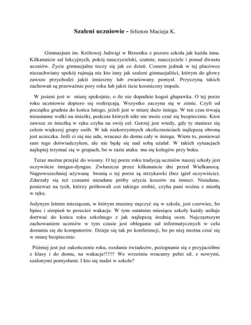 Szaleni uczniowie - felieton Macieja K. Gimnazjum im. Królowej Jadwigi w Brzostku z pozoru szkoła jak każda inna. Kilkanaście sal lekcyjnych, pokój nauczycielski, szatnie, nauczyciele i ponad dwustu uczniów. Życie gimnazjalne toczy się jak co dzień. Czasem jednak w tej placówce niezachwiany spokój rujnują nie kto inny jak szaleni gimnazjaliści, którym do głowy zawsze przychodzi jakiś śmieszny lub zwariowany pomysł. Przyczyną takich zachowań są przeważnie pory roku lub jakiś iście kosmiczny impuls. W jesieni jest w miarę spokojnie, o ile nie dopadnie kogoś głupawka. O tej porze roku uczniowie dopiero się rozkręcają. Wszystko zaczyna się w zimie. Czyli od początku grudnia do końca lutego, jeżeli jest w miarę dużo śniegu. W ten czas trwają nieustanne walki na śnieżki, podczas których nikt nie może czuć się bezpiecznie. Ktoś zawsze ze śnieżką w ręku czyha na swój cel. Gorzej jest wtedy, gdy ty staniesz się celem większej grupy osób. W tak niekorzystnych okolicznościach najlepszą obroną jest ucieczka. Jeśli ci się nie uda, wracasz do domu cały w śniegu. Wiem to, ponieważ sam tego doświadczyłem, ale nie będę się nad sobą użalał. W takich sytuacjach najlepiej trzymać się w grupach, bo w razie ataku ma się kolegów przy boku. Teraz można przejść do wiosny. O tej porze roku tradycją uczniów naszej szkoły jest oczywiście śmigus-dyngus. Zwłaszcza przez kilkanaście dni przed Wielkanocą. Najpowszechniej używaną bronią o tej porze są strzykawki (bez igieł oczywiście). Zdarzały się też czasami nieudane próby użycia koszów na śmieci. Nieudane, ponieważ na tych, którzy próbowali coś takiego zrobić, czyha pani woźna z miotłą w ręku. Jedynym letnim miesiącem, w którym musimy męczyć się w szkole, jest czerwiec, bo lipiec i sierpień to przecież wakacje. W tym ostatnim miesiącu szkoły każdy usiłuje dotrwać do końca roku szkolnego z jak najlepszą średnią ocen. Najczęstszym zachowaniem uczniów w tym czasie jest obleganie sal informatycznych w celu dostania się do komputerów. Dzieje się tak po konferencji, bo po niej można czuć się w miarę bezpiecznie. Później jest już zakończenie roku, rozdanie świadectw, pożegnanie się z przyjaciółmi z klasy i do domu, na wakacje!!!!!! We wrześniu wracamy pełni sił, z nowymi, szalonymi pomysłami. I kto się nudzi w szkole? Przełomowa dyskoteka Mój pierwszy felieton zacznę od podstawowej, bardzo ważnej sprawy. Chodzi o to, że jego tematem mają być szkolne, interesujące sytuacje, a problemem jest to, że w naszej szkole nie dzieje się nic nadzwyczajnego, a przynajmniej nic dość ciekawego, by mogło się stać tematem do choćby tak marnego felietonu jak mój. Owszem, czasami uczniom zdarzają się śmieszne wpadki, ale nie jest to zjawisko aż tak nagminne, by mógł z niego powstać dobry felieton. Jednak zadanie to zadanie! Żeby napisać cokolwiek, sięgnę wstecz i pozwolę sobie przytoczyć pewną sytuację, która w dużym stopniu zmieniła postawę starszych uczniów do pierwszaków. Zdarzenie to miało miejsce na dyskotece (2011 r.), a raczej przed, po i w jej trakcie. Otóż drugie i trzecie klasy miały ogromne ,,wąty” do pierwszaków, że są dziecinni, beznadziejnie się zachowują, ubierają i że w ogóle są jakimiś ,,pokemonami”. Było im również szkoda, że poprzednie trzecie klasy odeszły (w sumie to w tym się z nimi zgadzam, bo rocznik 95 był naprawdę fajny). Niestety, oni odeszli, a przyszliśmy my, rocznik 98. I wtedy się zaczęło. Już nawet na wakacjach wypisywano o nas na gimnazjalnej księdze gości, że przyjdzie -tak jak już wcześniej napisałam- ,,dzieciarnia”. Tematem niemiłych spostrzeżeń stały się szczególnie dwie osoby (nie będę wymieniać nazwisk), że są ,,tapeciarami” itp. Zresztą nie tylko one były ofiarami. W końcu nadeszły pierwsze dni szkoły i zaczęło się pierwsze: ,,Kici kici”. Starszakom długo się to nie nudziło, ale my przetrwaliśmy. Po pewnym czasie po szkole rozniosła się wieść o pierwszej dyskotece. Znów na księdze gości pojawiły się niemiłe wpisy na nasz temat. A to, że my, dzieci, nie wiemy, co to dyskoteka, że nie umiemy tańczyć itp. Ale w końcu nadszedł czas dyskoteki. Sytuacja zmieniła się diametralnie. Gdy tylko zagrano pierwszą piosenkę, my ,,kociaki” zawładnęliśmy parkietem. Świetnie się bawiliśmy. Można powiedzieć, że starsi byli trochę zdziwieni, że jednak wiemy, co to dyskoteka. Jeszcze większy wstyd zrobili sobie starsi tym, że połowa z nich tylko podpierała ściany, podczas gdy pierwszaki wywijały na parkiecie. Po dyskotece nastawienie drugich i trzecich klas było szokujące. Wszyscy nagle stali się kolegami. Na korytarzach było słychać: ,,Cześć”,,Cześć”- ,,Co tam u ciebie”, a wcześniej to ani „Siema” do nas nie burknęli. Na księdze gości też pojawiły się nowe wpisy, ale te już nie były obraźliwe, np. takie: ,,No te kociaki to jednak umieją się bawić” albo ,,Ostatnia impreza z pierwszakami była super, oby takich więcej”. Tak więc przez początkowe głupie zachowanie starsi wyszli na niekoleżeńskich i oceniających innych pochopnie, po pozorach. Dobrze jednak, że nas poznali i przekonali się do nas. I tak miło potoczyły się nasze dalsze losy w pierwszej klasie. A wszystko to za sprawą jednej dyskoteki. Najlepsze jest to, że te całe moje „wypociny” o szkole, nazywane przez niektórych felietonem, można podsumować jednym mądrym zdaniem: ,, Nie mów hop, póki nie przeskoczysz”. Monika S., felietonistka z IIa Albertyzm do boju Felietonowe spojrzenie wg Grzegorza Sz. Szkoła jest twórczym miejscem, muszę to przyznać. Ale bynajmniej nie dlatego, że wszyscy uczniowie wykonują polecenia nauczyciela i rozwijają się zgodnie z myślą pedagogów. Twierdzę, że jest odwrotnie i występują zachowania przeciwne wymienionym wyżej. Powtarza