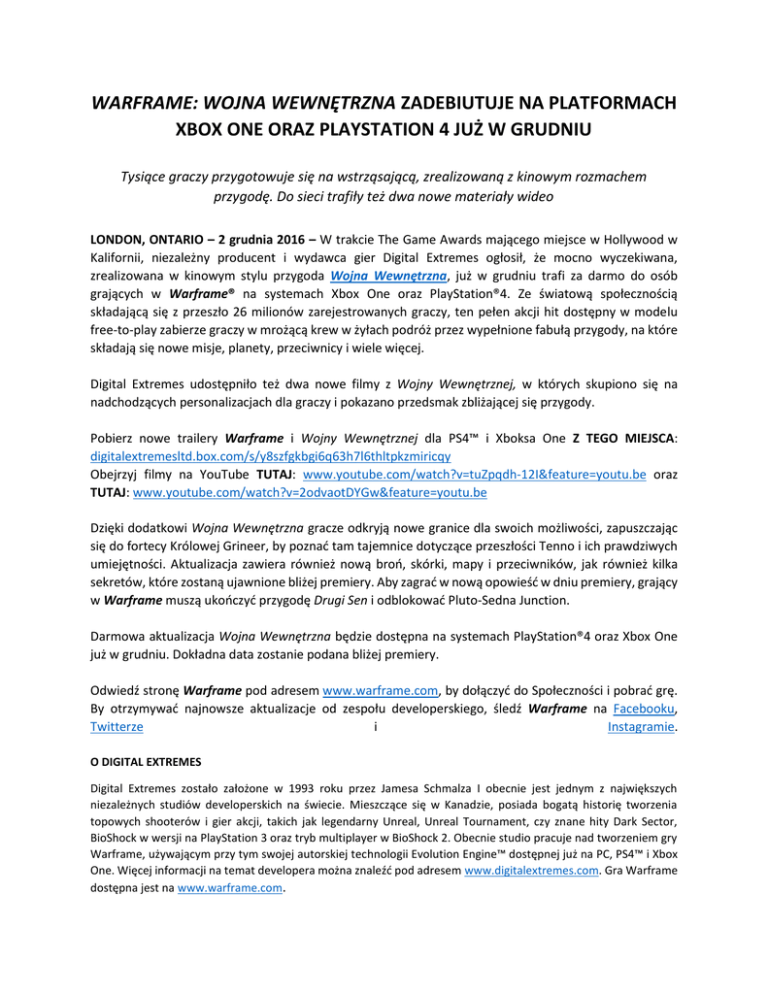 WARFRAME: WOJNA WEWNĘTRZNA ZADEBIUTUJE NA PLATFORMACH XBOX ONE ORAZ PLAYSTATION 4 JUŻ W GRUDNIU Tysiące graczy przygotowuje się na wstrząsającą, zrealizowaną z kinowym rozmachem przygodę. Do sieci trafiły też dwa nowe materiały wideo LONDON, ONTARIO – 2 grudnia 2016 – W trakcie The Game Awards mającego miejsce w Hollywood w Kalifornii, niezależny producent i wydawca gier Digital Extremes ogłosił, że mocno wyczekiwana, zrealizowana w kinowym stylu przygoda Wojna Wewnętrzna, już w grudniu trafi za darmo do osób grających w Warframe® na systemach Xbox One oraz PlayStation®4. Ze światową społecznością składającą się z przeszło 26 milionów zarejestrowanych graczy, ten pełen akcji hit dostępny w modelu free-to-play zabierze graczy w mrożącą krew w żyłach podróż przez wypełnione fabułą przygody, na które składają się nowe misje, planety, przeciwnicy i wiele więcej. Digital Extremes udostępniło też dwa nowe filmy z Wojny Wewnętrznej, w których skupiono się na nadchodzących personalizacjach dla graczy i pokazano przedsmak zbliżającej się przygody. Pobierz nowe trailery Warframe i Wojny Wewnętrznej dla PS4™ i Xboksa One Z TEGO MIEJSCA: digitalextremesltd.box.com/s/y8szfgkbgi6q63h7l6thltpkzmiricqy Obejrzyj filmy na YouTube TUTAJ: www.youtube.com/watch?v=tuZpqdh-12I&feature=youtu.be oraz TUTAJ: www.youtube.com/watch?v=2odvaotDYGw&feature=youtu.be Dzięki dodatkowi Wojna Wewnętrzna gracze odkryją nowe granice dla swoich możliwości, zapuszczając się do fortecy Królowej Grineer, by poznać tam tajemnice dotyczące przeszłości Tenno i ich prawdziwych umiejętności. Aktualizacja zawiera również nową broń, skórki, mapy i przeciwników, jak również kilka sekretów, które zostaną ujawnione bliżej premiery. Aby zagrać w nową opowieść w dniu premiery, grający w Warframe muszą ukończyć przygodę Drugi Sen i odblokować Pluto-Sedna Junction. Darmowa aktualizacja Wojna Wewnętrzna będzie dostępna na systemach PlayStation®4 oraz Xbox One już w grudniu. Dokładna data zostanie podana bliżej premiery. Odwiedź stronę Warframe pod adresem www.warframe.com, by dołączyć do Społeczności i pobrać grę. By otrzymywać najnowsze aktualizacje od zespołu developerskiego, śledź Warframe na Facebooku, Twitterze i Instagramie. O DIGITAL EXTREMES Digital Extremes zostało założone w 1993 roku przez Jamesa Schmalza I obecnie jest jednym z największych niezależnych studiów developerskich na świecie. Mieszczące się w Kanadzie, posiada bogatą historię tworzenia topowych shooterów i gier akcji, takich jak legendarny Unreal, Unreal Tournament, czy znane hity Dark Sector, BioShock w wersji na PlayStation 3 oraz tryb multiplayer w BioShock 2. Obecnie studio pracuje nad tworzeniem gry Warframe, używającym przy tym swojej autorskiej technologii Evolution Engine™ dostępnej już na PC, PS4™ i Xbox One. Więcej informacji na temat developera można znaleźć pod adresem www.digitalextremes.com. Gra Warframe dostępna jest na www.warframe.com. Kontakt w Polsce: Tomasz Stachurski | [email protected]