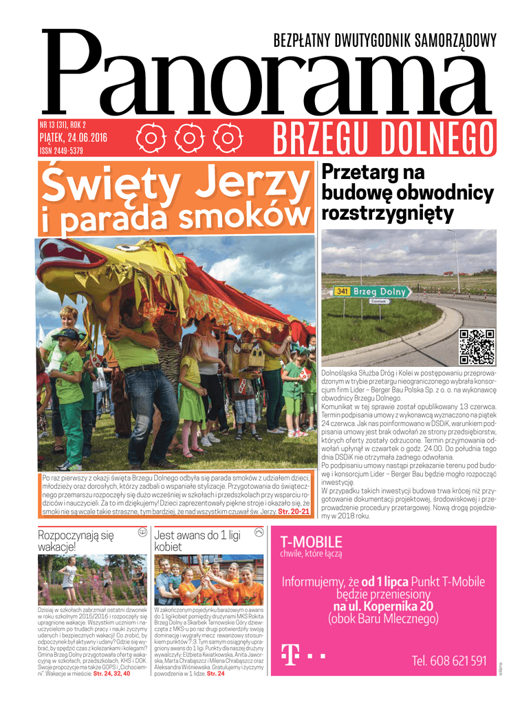 NR 13 (31), ROK 2 PIĄTEK, 24.06.2016 ISSN 2449-5379 Przetarg na budowę obwodnicy rozstrzygnięty Rozpoczynają się wakacje! Jest awans do 1 ligi kobiet Dzisiaj w szkołach zabrzmiał ostatni dzwonek w roku szkolnym 2015/2016 i rozpoczęły się upragnione wakacje. Wszystkim uczniom i nauczycielom po trudach pracy i nauki życzymy udanych i bezpiecznych wakacji! Co zrobić, by odpoczynek był aktywny i udany? Gdzie się wybrać, by spędzić czas z koleżankami i kolegami? Gmina Brzeg Dolny przygotowała ofertę wakacyjną w szkołach, przedszkolach, KHS i DOK. Swoje propozycje ma także GOPS i „Cichociemni”. Wakacje w mieście: Str. 24, 32, 40 W zakończonym pojedynku barażowym o awans do 1 ligi kobiet pomiędzy drużynami MKS Rokita Brzeg Dolny a Skarbek Tarnowskie Góry dziewczęta z MKS-u po raz drugi potwierdziły swoją dominację i wygrały mecz rewanżowy stosunkiem punktów 7:3. Tym samym osiągnęły upragniony awans do 1 ligi. Punkty dla naszej drużyny wywalczyły: Elżbieta Kwiatkowska, Anita Jaworska, Marta Chrabąszcz i Milena Chrabąszcz oraz Aleksandra Wiśniewska. Gratulujemy i życzymy powodzenia w 1 lidze. Str. 24 reklama Po raz pierwszy z okazji święta Brzegu Dolnego odbyła się parada smoków z udziałem dzieci, młodzieży oraz dorosłych, którzy zadbali o wspaniałe stylizacje. Przygotowania do świątecznego przemarszu rozpoczęły się dużo wcześniej w szkołach i przedszkolach przy wsparciu rodziców i nauczycieli. Za to im dziękujemy! Dzieci zaprezentowały piękne stroje i okazało się, że smoki nie są wcale takie straszne, tym bardziej, że nad wszystkim czuwał św. Jerzy. Str. 20-21 Dolnośląska Służba Dróg i Kolei w postępowaniu przeprowadzonym w trybie przetargu nieograniczonego wybrała konsorcjum firm Lider – Berger Bau Polska Sp. z o. o. na wykonawcę obwodnicy Brzegu Dolnego. Komunikat w tej sprawie został opublikowany 13 czerwca. Termin podpisania umowy z wykonawcą wyznaczono na piątek 24 czerwca. Jak nas poinformowano w DSDiK, warunkiem podpisania umowy jest brak odwołań ze strony przedsiębiorstw, których oferty zostały odrzucone. Termin przyjmowania odwołań upłynął w czwartek o godz. 24.00. Do południa tego dnia DSDiK nie otrzymała żadnego odwołania. Po podpisaniu umowy nastąpi przekazanie terenu pod budowę i konsorcjum Lider – Berger Bau będzie mogło rozpocząć inwestycję. W przypadku takich inwestycji budowa trwa krócej niż przygotowanie dokumentacji projektowej, środowiskowej i przeprowadzenie procedury przetargowej. Nową drogą pojedziemy w 2018 roku. 2 PIĄTEK, 24.06.2016 Badanie jakościowe powietrza w Brzegu Dolnym Wojewódzki Inspektorat Ochrony Środowiska we Wrocławiu prowadził w Brzegu Dolnym badania jakościowe powietrza. rządzenia pomiarowe zostały zainstalowane na budynku oficyny pałacowej. Miejsce zostało wybranie nieprzypadkowo, gdyż to mieszkańcy Starego Miasta najbardziej odczuwają nieprzyjemne zapachy. Pomiar był dokonywany w dniach 13-16 czerwca. Badanie dotyczyło imisji substancji połączonych z analizą U jakościową powietrza. Na razie wyniki nie są znane, trwają analizy laboratoryjne. Nie ma odpowiedzi Jak już informowaliśmy, podczas wyjazdowego posiedzenia Komisji Ochrony Środowiska, która zajmowała się nieprzyjemnymi zapachami w mieście, padła deklaracja ze strony radnych, że chcą spotkania z przedstawicielami PCC Rokita, którzy powinni powiedzieć mieszkańcom o tym, jakie działania zo- stały podjęte, by ograniczyć odór w mieście. W tej sprawie przewodnicząca Komisji Ochrony Środowiska Anna Piotrowska wystosowała pismo do Elżbiety Kutyły, dyrektor Biura Ochrony Środowiska w PCC, w którym prosi o wskazanie dogodnego terminu spotkania, tak, aby mogli w nim uczestniczyć radni i mieszkańcy. Do dnia wysłania gazety do druku odpowiedzi ze strony dyrektor Kutyły nie było. mb Uciążliwości zapachowe należy zgłaszać dyspozytorowi PCC Rokita S.A. w Brzegu Dolnym: 71 794 24 41 lub 667 650 252 Gmina Brzeg Dolny przystąpiła do opracowania dokumentu pt. „Lokalny Program Rewitalizacji gminy Brzeg Dolny na lata 2016-2023”. rzygotowanie programu rewitalizacji pozwoli gminie Brzeg Dolny na długofalowe działania zmierzające do poprawy warunków i jakości życia jej mieszkańców, zapobieganie dalszej degradacji obszarów, w których stwierdzono stany kryzysowe, jak również umożliwi gminie ubieganie się o środki finansowe z Unii Europejskiej w ramach RPO P WD 2014-2020 oraz uzyskanie dotacji. Celem niniejszego badania jest poznanie Państwa opinii na temat aktualnych potrzeb w zakresie rewitalizacji problemowych obszarów gminy oraz oczekiwanych działań mających na celu ich ożywienie społeczno-gospodarcze. Dzięki przeprowadzanej diagnozie stanu gminy Brzeg Dolny możliwe będzie wskazanie obszarów zdegradowanych, czyli takich, na których zidentyfikowano stan kryzysowy. Po tym nastąpi wyznaczenie obszaru rewitalizacji, obej- mującego całość lub część obszaru zdegradowanego. Na obszarze rewitalizacji prowadzone będą przedsięwzięcia rewitalizacyjne. Ankieta jest anonimowa. Podawane przez Państwa informacje służyć będą wyłącznie diagnozie sytuacji w gminie Brzeg Dolny, koniecznej do opracowania Lokalnego Programu Rewitalizacji gminy Brzeg Dolny na lata 2016-2023. Można ją wypełnić na stronie www.brzegdolny.pl: http://www.brzegdolny.pl/ogloszenie/ankieta-brzeg-dolny-rewitalizacja/ Dwutygodnik Samorządowy „Panorama Brzegu Dolnego”. Wydawca: Dolnobrzeski Ośrodek Kultury, Danuta Chłód – dyrektor. Nakład: 7 000 egzemplarzy. Adres wydawcy: ul. Kolejowa 29, 56-120 Brzeg Dolny, tel. 71 319 52 52. Kontakt z redakcją: tel. 71 319 51 17 (wew. 271), 882 447 666; e-mail: [email protected], [email protected]. Redaktor naczelna: Małgorzata Bołdyn, skład, grafika: Mateusz Mrozek, dziennikarz, korekta i reklama: Marta Wabiszczewicz-Krawczuk, sport: Jarosław Iskra. Zespół redakcyjny: Małgorzata Bo