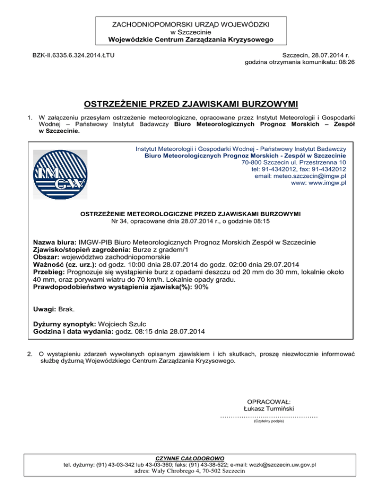 ZACHODNIOPOMORSKI URZĄD WOJEWÓDZKI w Szczecinie Wojewódzkie Centrum Zarządzania Kryzysowego BZK-II.6335.6.324.2014.ŁTU Szczecin, 28.07.2014 r. godzina otrzymania komunikatu: 08:26 OSTRZEŻENIE PRZED ZJAWISKAMI BURZOWYMI 1. W załączeniu przesyłam ostrzeżenie meteorologiczne, opracowane przez Instytut Meteorologii i Gospodarki Wodnej – Państwowy Instytut Badawczy Biuro Meteorologicznych Prognoz Morskich – Zespół w Szczecinie. Instytut Meteorologii i Gospodarki Wodnej - Państwowy Instytut Badawczy Biuro Meteorologicznych Prognoz Morskich - Zespół w Szczecinie 70-800 Szczecin ul. Przestrzenna 10 tel: 91-4342012, fax: 91-4342012 email: [email protected] www: www.imgw.pl OSTRZEŻENIE METEOROLOGICZNE PRZED ZJAWISKAMI BURZOWYMI Nr 34, opracowane dnia 28.07.2014 r., o godzinie 08:15 Nazwa biura: IMGW-PIB Biuro Meteorologicznych Prognoz Morskich Zespół w Szczecinie Zjawisko/stopień zagrożenia: Burze z gradem/1 Obszar: województwo zachodniopomorskie Ważność (cz. urz.): od godz. 10:00 dnia 28.07.2014 do godz. 02:00 dnia 29.07.2014 Przebieg: Prognozuje się wystąpienie burz z opadami deszczu od 20 mm do 30 mm, lokalnie około 40 mm, oraz porywami wiatru do 70 km/h. Lokalnie opady gradu. Prawdopodobieństwo wystąpienia zjawiska(%): 90% Uwagi: Brak. Dyżurny synoptyk: Wojciech Szulc Godzina i data wydania: godz. 08:15 dnia 28.07.2014 2. O wystąpieniu zdarzeń wywołanych opisanym zjawiskiem i ich skutkach, proszę niezwłocznie informować służbę dyżurną Wojewódzkiego Centrum Zarządzania Kryzysowego. OPRACOWAŁ: Łukasz Turmiński ………………….…………………… (Czytelny podpis) CZYNNE CAŁODOBOWO tel. dyżurny: (91) 43-03-342 lub 43-03-360; faks: (91) 43-38-522; e-mail: [email protected] adres: Wały Chrobrego 4, 70-502 Szczecin