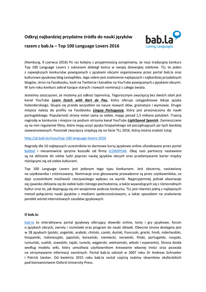 Odkryj najbardziej przydatne źródła do nauki języków razem z bab.la – Top 100 Language Lovers 2016 (Hamburg, 9 czerwca 2016) Po raz kolejny z przyjemnością oznajmiamy, że nasz tradycyjny konkurs Top 100 Language Lovers z sukcesem dobiegł końca w swojej dziewiątej odsłonie. TLL to jeden z największych konkursów powiązanych z językami obcymi organizowany przez portal bab.la oraz kulturowo-językowy blog Lexiophiles. Jego celem jest znalezienie najlepszych i najbardziej przydatnych blogów, stron na Facebooku, kont na Twitterze i kanałów na YouTube powiązanych z językami obcymi. W tym roku konkurs zebrał tysiące starych i nowych nominacji z całego świata. Jesteśmy zaszczyceni, że możemy już odkryć tajemnicę. Tegorocznym zwycięzcą bez dwóch zdań jest kanał YouTube Learn Dutch with Bart de Pau, który oferuje cotygodniowe lekcje języka holenderskiego. Skupia się przede wszystkim na nauce nowych słów, gramatyce i wymowie. Drugie miejsce należy do profilu na Facebooku Língua Portuguesa, który jest przeznaczony do nauki portugalskiego. Popularność strony mówi sama za siebie, mając ponad 1,5 miliona polubień. Trzecią nagrodę w konkursie i miejsce na podium otrzyma kanał YouTube LightSpeed Spanish. Zamieszczane są na nim regularnie filmy, które mają uczyć języka hiszpańskiego od początkujących po tych bardziej zaawansowanych. Pozostali zwycięzcy znajdują się na liście TLL 2016, którą można znaleźć tutaj: http://pl.bab.la/niusy/top-100-language-lovers-2016 Nagrody dla 10 najlepszych uczestników to darmowe kursy językowe online ufundowane przez portal Babbel i niesamowicie sprytne koszulki od firmy ICONSPEAK. Obaj nasi partnerzy nastawieni są na zbliżanie do siebie ludzi poprzez naukę języków obcych oraz przełamywanie barier między różniącymi się od siebie kulturami. Top 100 Language Lovers jest jedynym tego typu konkursem. Jest obszerny, nastawiony na użytkownika i zróżnicowany. Nominacje oraz głosowanie prowadzone są przez użytkowników, co daje uczestnikom możliwość rzeczywistego wpływu na wyniki. Najprzyjemniej jednak obserwuje się zjawisko zbliżania się do siebie ludzi różnego pochodzenia, a także wywodzących się z różnorodnych kultur oraz to, jak dopingują się oni wzajemnie podczas konkursu. TLL jest również jedną z najlepszych metod połączenia nauki języków z mediami społecznościowymi, a także sposobem na znalezienie perełek wśród internetowych zasobów językowych. O bab.la: bab.la to interaktywny portal językowy oferujący słowniki online, testy i gry językowe, forum o językach obcych, zwroty i rozmówki oraz program do nauki słówek. Obecnie strona dostępna jest w 28 językach (polski, angielski, arabski, chiński, czeski, duński, francuski, grecki, hindi, niderlandzki, hiszpański, indonezyjski, japoński, koreański, niemiecki, norweski, fiński, portugalski, rosyjski, rumuński, suahili, szwedzki, tajski, turecki, węgierski, wietnamski, włoski i esperanto). Strona działa według modelu wiki, który umożliwia użytkownikom kreowanie własnej treści oraz pozwala na otrzymywanie informacji zwrotnych. Portal bab.la założyli w 2007 roku Dr Andreas Schroeter i Patrick Uecker. Od kwietnia 2015 roku bab.la został częścią rodziny słowników oksfordzkich pod kierownictwem Oxford University Press. O Lexiophiles: Blog językowy Lexiophiles (http://www.lexiophiles.com) współpracuje z bab.la. Służy jako źródło informacji na każdy temat związany z językiem, zarówno angielskim jak i innymi językami obcymi. Wielojęzyczni autorzy publikują tam mnóstwo artykułów dotyczących języków obcych oraz kultury. Kontakt: Weronika Jaszcz Email: weronika[at]bab[dot]la Tel: +49 (0)40 707080950 bab.la GmbH | Alter Fischmarkt 5 | 20457 Hamburg | Germany Twitter: @babla |Facebook: http://www.facebook.com/babla.languages |Google+: bab.la