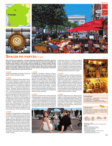 FRANCJA Paryż Francja SPACER PO PARYŻU (7 dni) Krok po kroku, bez pośpiechu, w tempie dogodnym dla każdego Uczestnika, spacer po Paryżu to wspólne odkrywanie miasta marzeń. W programie zawarte są wszystkie najbardziej znane zabytki, a także miejsca, które przewijają się w setkach książek i filmów: miejsce spotkań artystów Au Lapin Agile, kabarety Moulin Rouge i Lido oraz salony mody haute couture, gdzie sklepowe wystawy to prawdziwe galerie sztuki. Wiele atrakcji, każda godzina precyzyjnie zaplanowana, łącznie z czasem wolnym do dyspozycji uczestników. Od lat w ścisłej czołówce wycieczek do Francji! 1. DZIEŃ Zbiórka uczestników na lotnisku. Przelot do Paryża. Transfer do hotelu, nocleg. 2. DZIEŃ Śniadanie. Zwiedzanie katedry Notre-Dame, serca Paryża. Następnie w programie wyspa św. Ludwika: Biblioteka Polska, kościół św. Ludwika, Hôtel Lambert. Będąc na wyspie nie można zapomnieć o skosztowaniu słodkich przysmaków w najznakomitszej lodziarni miasta – Bertillon. Spacer po Dzielnicy Łacińskiej: romański kościół St-Germain des Prés – najstarsza świątynia miasta; przerwa na kawę w słynnej kawiarni Les Deux Magots lub położonej tuż obok Café de Flore. Wjazd na 56. piętro Tour Montparnasse, na odkryty taras widokowy, skąd rozciąga się przepiękna panorama „stolicy świata”. Spacer po Ogrodach Luksemburskich. Zwiedzanie Panteonu – miejsca spoczynku m.in. Victora Hugo, Marii Skłodowskiej-Curie i Woltera. Spacer bulwarem St-Michel. Czas wolny na kolację w okolicach rue de la Huchette i rue de la Harpe, przy których znajdują się liczne restauracje i bary. Powrót do hotelu i nocleg. 3. DZIEŃ Śniadanie. Przejazd metrem na Montmartre. Zwiedzanie: bazylika Sacré-Coeur wzniesiona na szczycie wzgórza Montmartre, Place du Tertre – jeden z najbardziej malowniczych zakątków Paryża. Dalej spacer rue des Saules, gdzie znajduje się legendarne miejsce spotkań paryskiej bohemy – Au Lapin Agile, przez Place Pigalle do Place Blanche ze słynnym kabaretem Moulin Rouge. Wizyta na cmentarzu Montmartre, gdzie spoczywają: Sacha Guitry, Jakub Offenbach, Hektor Berlioz, Aleksander Dumas syn, Edgar Degas, Wacław Niżyński i Stendhal. Czas wolny. Kolacja. Powrót do hotelu i nocleg. PARSPAC z różowego marmuru i ośmioma posągami kobiet, symbolizującymi największe miasta Francji. Po południu czas wolny. Powrót do hotelu. Dla chętnych wieczór w kabarecie Lido na Polach Elizejskich (za dodatkową opłatą na miejscu). Spektakle w Lido to połączenie tradycji paryskich kabaretów z rozmachem i kolorem broadwayowskich przedstawień. Nocleg. 4. DZIEŃ Śniadanie. Zwiedzanie Muzeum D’Orsay, prezentującego sztukę drugiej połowy XIX w. i początków XX w. Ilość zgromadzonych tu sławnych dzieł jest imponująca. Obrazy Moneta, Maneta, van Gogha, Renoira i Pissarro przyciągają turystów z całego świata. Rejs statkiem po Sekwanie. Następnie wjazd na wieżę Eiffla, uważaną za symbol Paryża. Spacer przez Pola Marsowe do Hotelu des Invalides – muzeum armii i Dôme des Invalides z grobowcem Napoleona. Powrót do hotelu. Dla chętnych wieczór w kabarecie Moulin Rouge (za dodatkową opłatą na miejscu). Nocleg. 6. DZIEŃ Śniadanie. Zwiedzanie neoklasycznego kościoła La Madeleine. Czas na zakupy w słynnych delikatesach Fauchon. Spacer boulevard des Capucines na plac Opery. Opéra Garnier to jeden z najpiękniejszych i największych teatrów muzycznych świata. Zwiedzanie muzeum perfum Fragonard. Spacer rue de la Paix do Place Vendôme, przy którym stoi m. in. słynny hotel Ritz. Spacer przez ogrody Tuileries do Luwru. Zwiedzanie muzeum słynnego z jednej z największych na świecie kolekcji dzieł sztuki. Kolacja. Powrót do hotelu i nocleg. 5. DZIEŃ Śniadanie. Przejazd metrem na Place Charles de Gaulle. Następnie w programie: Łuk Triumfalny – symbol Francji, spacer po Polach Elizejskich, cieszących się sławą najpiękniejszej ulicy świata i dalej po avenue Montaigne i rue Faubourg St-Honoré, gdzie skupili swe sklepy najbardziej znani projektanci mody, twórcy haute couture, imponujący Place de la Concorde, z obeliskiem 7. DZIEŃ Śniadanie. Wykwaterowanie. Zdeponowanie bagażu w hotelowej przechowalni. Przejazd metrem do eleganckiej dzielnicy Marais, pełnej małych sklepów, designerskich butików i interesujących galerii. Spacer: efektowny Plac Wogezów i rue des Rossiers – serce dzielnicy żydowskiej. Powrót do hotelu. Transfer na lotnisko. Przelot do Polski. WYDARZENIA: 21 września 2011 – 9 stycznia 2012 – wystawa czasowa prac Edwarda Muncha w Centre Pompidou. 27 września 2011 – 16 stycznia 2012 – wystawa czasowa obrazów Fridy Kahlo i Diego Rivery w Musée de l’Orangerie. ŚWIADCZENIA: 6 noclegów w hotelu** w centrum Paryża • 2-os. pokoje (możliwość 1 dostawki) z łazienkami • wyżywienie (serwowane): 6 śniadań i 2 kolacje • przelot • transfery: lotnisko – hotel – lotnisko • opieka pilota • ubezpieczenie KL i NW TERMIN 09.11-15.11 10.03-16.03 CENA 2690 2690 TERMIN 24.03-30.03 CENA 2690 Wyloty z Warszawy – bez dopłaty. Bilety wstępu, rejs po Sekwanie i lokalni przewodnicy: ok. 70 EUR, bilety komunikacji miejskiej: ok. 30 EUR. UWAGI: 1. Obowiązkowa opłata lotniskowa/os.: 300 PLN. 2. Obowiązkowa dopłata transportowa/os.: 150 PLN. 3. Zniżka za 1. dziecko do 18 lat: 100 PLN. 4. Dopłata do pokoju 1-os.: 890 PLN. 5. Opłaty fakultatywne: wieczór w kabarecie Moulin Rouge: ok. 92 EUR, wieczór w kabarecie Lido: ok. 80 EUR. 6. Przejazdy po Paryżu środkami komunikacji miejskiej. 327