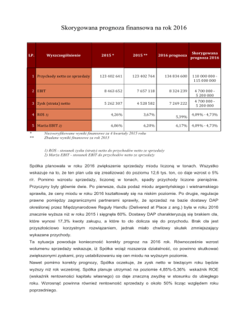 Skorygowana prognoza finansowa na rok 2016 LP. Wyszczególnienie 1 Przychody netto ze sprzedaży 2015 * 2015 ** 2016 prognoza 123 402 641 123 402 764 134 834 600 2 EBIT 8 463 652 7 657 118 8 324 239 3 Zysk (strata) netto 5 262 307 4 528 582 7 269 222 4 ROS 1) 4,26% 3,67% 5 Marża EBIT 2) 6,86% 6,20% * ** 5,39% 6,17% Skorygowana prognoza 2016 110 000 000 115 000 000 4 700 000 5 200 000 4 700 000 5 200 000 4,09% - 4,73% 4,09% - 4,73% Niezweryfikowane wyniki finansowe za 4 kwartały 2015 roku Zbadane wyniki finansowe za rok 2015 1) ROS - stosunek zysku (straty) netto do przychodów netto ze sprzedaży 2) Marża EBIT - stosunek EBIT do przychodów netto ze sprzedaży Spółka planowała w roku 2016 zwiększenie sprzedaży miodu liczoną w tonach. Wszystko wskazuje na to, że ten plan uda się zrealizować do poziomu 12,6 tys. ton, co daje wzrost o 5% r/r. Pomimo wzrostu sprzedaży, liczonej w tonach, spadły przychody liczone pieniężnie. Przyczyny były głównie dwie. Po pierwsze, duża podaż miodu argentyńskiego i wietnamskiego sprawiła, że ceny miodu w roku 2016 kształtowały się na niskim poziomie. Po drugie, regulacje prawne pomiędzy zagranicznymi partnerami sprawiły, że sprzedaż na bazie dostawy DAP określonej przez Międzynarodowe Reguły Handlu (Delivered at Place z ang.) była w roku 2016 znacznie wyższa niż w roku 2015 i sięgnęła 60%. Dostawy DAP charakteryzują się brakiem cła, które wynosi 17,3% kwoty zakupu, a które to cło dolicza się do przychodu. Brak cła jest przyszłościowo korzystnym rozwiązaniem, jednak miało chwilowy skutek zmniejszający wykazane przychody. Ta sytuacja powoduje konieczność korekty prognoz na 2016 rok. Równocześnie wzrost wolumenu sprzedaży wskazuje, iż Spółka wciąż rozszerza działalność, co powinno skutkować zwiększonymi zyskami, przy ustabilizowaniu się cen miodu na wyższym poziomie. Nawet pomimo korekty prognozy, Spółka oczekuje, że zysk netto w bieżącym roku będzie wyższy niż rok wcześniej. Spółka planuje utrzymać na poziomie 4,85%-5,36% wskaźnik ROE (wskaźnik rentowności kapitału własnego) co daje znaczną zwyżkę w stosunku do ubiegłego roku. Wzrosnąć powinna również rentowność sprzedaży o około 50% licząc względem roku poprzedniego.