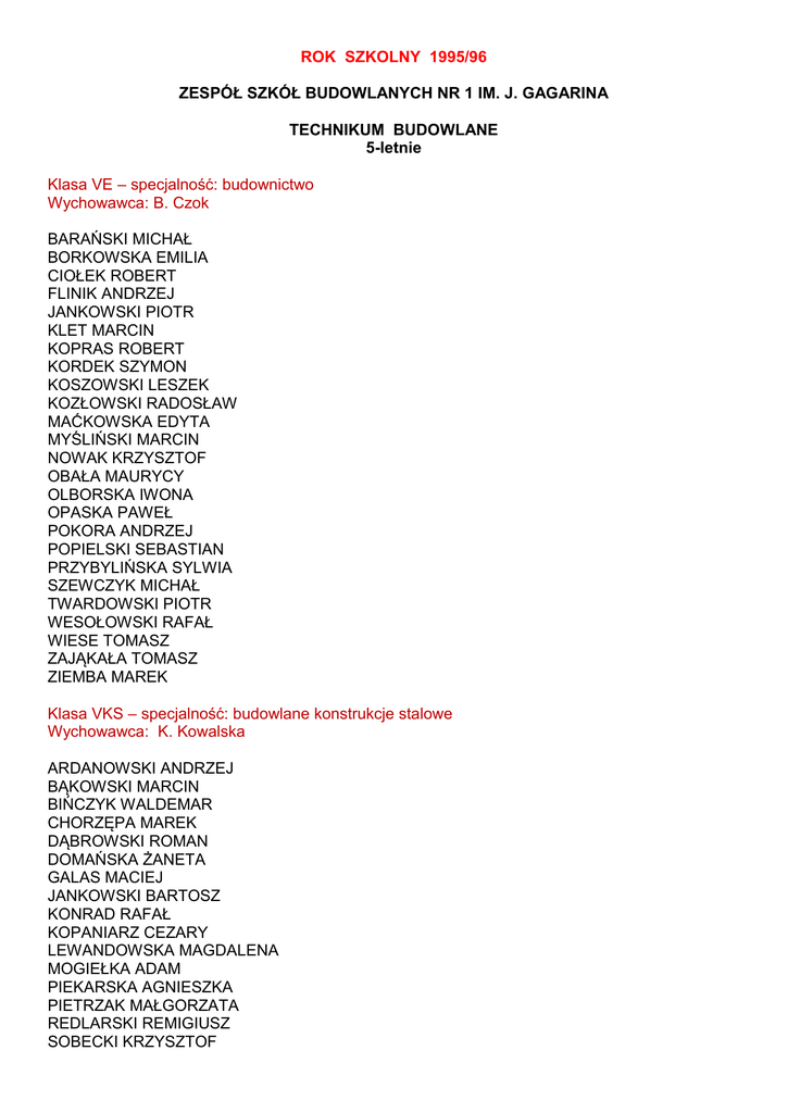 ROK SZKOLNY 1995/96 ZESPÓŁ SZKÓŁ BUDOWLANYCH NR 1 IM. J. GAGARINA TECHNIKUM BUDOWLANE 5-letnie Klasa VE – specjalność: budownictwo Wychowawca: B. Czok BARAŃSKI MICHAŁ BORKOWSKA EMILIA CIOŁEK ROBERT FLINIK ANDRZEJ JANKOWSKI PIOTR KLET MARCIN KOPRAS ROBERT KORDEK SZYMON KOSZOWSKI LESZEK KOZŁOWSKI RADOSŁAW MAĆKOWSKA EDYTA MYŚLIŃSKI MARCIN NOWAK KRZYSZTOF OBAŁA MAURYCY OLBORSKA IWONA OPASKA PAWEŁ POKORA ANDRZEJ POPIELSKI SEBASTIAN PRZYBYLIŃSKA SYLWIA SZEWCZYK MICHAŁ TWARDOWSKI PIOTR WESOŁOWSKI RAFAŁ WIESE TOMASZ ZAJĄKAŁA TOMASZ ZIEMBA MAREK Klasa VKS – specjalność: budowlane konstrukcje stalowe Wychowawca: K. Kowalska ARDANOWSKI ANDRZEJ BĄKOWSKI MARCIN BIŃCZYK WALDEMAR CHORZĘPA MAREK DĄBROWSKI ROMAN DOMAŃSKA ŻANETA GALAS MACIEJ JANKOWSKI BARTOSZ KONRAD RAFAŁ KOPANIARZ CEZARY LEWANDOWSKA MAGDALENA MOGIEŁKA ADAM PIEKARSKA AGNIESZKA PIETRZAK MAŁGORZATA REDLARSKI REMIGIUSZ SOBECKI KRZYSZTOF ŚMIGIELSKA EWA TOMASZEWSKI MACIEJ TOMKIEWICZ ADAM WOJCIECHOWSKI ANDRZEJ WÓJTOWICZ JANUSZ TECHNIKUM BUDOWLANE 3-letnie Klasa IIIA – specjalność: budownictwo ogólne Wychowawca: M. Hauke BLADZICH ADAM BOROWA DARIUSZ FRĄCKOWIAK MARIUSZ GOSKA MAREK JANASZEK ANDRZEJ JEŻAK JACEK KĄTNIK PIOTR KRÓLIKOWSKI MIKOŁAJ NOWAKOWSKI TOMASZ SOBIERALSKI ARTUR SZEWS BOGUMIŁA TIETZE ELŻBIETA WOŹNIAK JACEK WOJCIECHOWSKI RAFAŁ TECHNIKUM CERAMICZNE 5-letnie Klasa VC – specjalność: technologia ceramiki Wychowawca: B. Wiśniewska BEDNAREK MACIEJ CIUPAK ŻANETA GACKOWSKA ANETTA FIEREK IZABELA JASIAK JAROSŁAW KAMIŃSKA KAROLINA KROCZEK BEATA LAMPOWSKA IZABELLA MAĆKOWIAK IZABELA MALAK ANNA MAŁKIEWICZ LESŁAW PIETRUSZEWSKA JUSTYNA REDWAŃSKA IWONA SIERADZKA KATARZYNA SOBIERAJ BARBARA TRYNISZEWSKA DAGMARA TYŚ ROBERT WYRWAS MARZENA ZALEWSKI BARTOSZ ZIELIŃSKA AGNIESZKA ZIELIŃSKA JOANNA ZASADNICZA SZKOŁA BUDOWLANA NR 1 3-letnia Klasa 3a – specjalność: murarz Wychowawca: J. Janowski CHEŁKOWSKI ADAM DOMAGAŁA ARKADIUSZ GRYGORCZUK JAROSŁAW KALINOWSKI MACIEJ KASPRZAK MARCIN LUBAŃSKI ROGER MALINOWSKI TOMASZ PŁOTKA MARCIN SIDZIŃSKI RADOSŁAW STALIŃSKI ARTUR STALKOWSKI MARCIN STYPUŁKOWSKI DAMIAN SZWEDA DARIUSZ ZIEMBA MARCIN Klasa 3c – specjalność: malarz budowlany Wychowawca: H. Muszyńska BEDNAREK RAFAŁ GEISLER KRZYSZTOF JENDRZEJCZAK ŁUKASZ KLEINA MARIUSZ KOCIŃSKI KRZYSZTOF MATYNIAK JANUSZ NOWAKOWSKI RAFAŁ PANKOWSKI MARCIN PAWEŁKOWSKI KAROL PIASECKI TOMASZ RANISZEWSKI TOMASZ SEROCKI PRZEMYSŁAW SOPEL RAFAŁ STAWOWSKI RADOSŁAW SZALLA DANUTA SZAWŁOGA KRZYSZTOF TLOCK FILIP WILCZEWSKI MARCIN ZABOROWSKI JAROSŁAW Klasa 3f – specjalność: monter instalacji budowlanych Wychowawca: H. Muszyńska DOBROWOLSKI KAZIMIERZ GWADERA KRZYSZTOF KRANC TOMASZ KUJAWA MARIUSZ KWIATKOWSKI MAREK LACHOWSKI KRZYSZTOF LEMANOWICZ DAMIAN LEŚNIEWICZ JACEK LIPPKI MARCIN MATYLIS DOMINIK MAZURKIEWICZ MARCIN MIĘTKIEWICZ SŁAWOMIR NADOLIŃSKI MICHAŁ NOWICKI GRZEGORZ PAMIN MARCIN PIEKARZ KRZYSZTOF ROŻEK ADAM SERWIŃSKI MACIEJ SINKO KRZYSZTOF STACHOWIAK MICHAŁ STĘPNIK GRZEGORZ SZYMAŃSKI ROBERT WIŚNIEWSKI MICHAŁ WOSZCZYŃSKI MAREK ZASADNICZA SZKOŁA BUDOWLANA NR 3 3-letnia Klasa 3a’ – specjalność: malarz budowlany/monter instalacji budowlanych Wychowawca: T. Bartnicka BESZTAK JAROSŁAW CICHOCKI RAFAŁ DAMAZYN FABIAN GALIKOWSKI JACEK JASIŃSKI MIROSŁAW KUBIAK ADAM KWAŚNIEWSKI KRZYSZTOF KWIATKOWSKI ADAM LEWANDOWSKI MARCIN LIPIŃSKI JAKUB MELCER ANDRZEJ MICHALSKI MIROSŁAW MIZIUŁA JAROSŁAW PEREK PIOTR PIERZYNA ADAM SOWIŃSKI SŁAWOMIR SZACHNOWSKI WIESŁAW Klasa 3b’ – specjalność: murarz/ślusarz Wychowawca: T. Bartnicka BAGNIEWSKI MARCIN CIESIELCZYK SŁAWOMIR DĘBSKI WOJCIECH FUNTOWICZ RAFAŁ IRZA TOMASZ KRAWCZAK TOMASZ MEDERSKI MARCIN MIZDALSKI KRZYSZTOF MOŚCICKI ADAM NAJDOWSKI SŁAWOMIR PYRA TOMASZ SAWICKI MACIEJ SZOPIŃSKI PIOTR TADRZAK ROBERT WOJCIECHOWSKI KRZYSZTOF Klasa 3c’ – specjalność: murarz Wychowawca: J. Dłutkowska BLEJA KRZYSZTOF GAWRYSIAK PIOTR KOPIŃSKI KRZYSZTOF JARZEMBOWSKI KRZYSZTOF KUKIEŁCZYŃSKI MARCIN LEŚNIAK ROBERT LEWANDOWSKI KAROL MOŻEJKO MARCIN PACIOREK PIOTR PEŁKA PIOTR POLAKOWSKI LESZEK WIERZYCKI KRZYSZTOF WOJCIECHOWSKI WALDEMAR WOŁOS KRZYSZTOF