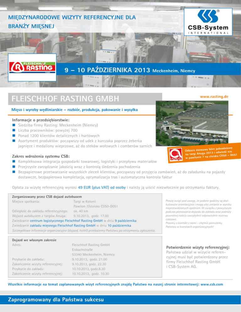 MIĘDZYNARODOWE WIZYTY REFERENCYJNE DLA BRANŻY MIĘSNEJ 9 – 10 PAŹDZIERNIKA 2013 Meckenheim, Niemcy FLEISCHHOF RASTING GMBH www.rasting.de Mięso i wyroby wędliniarskie – rozbiór, produkcja, pakowanie i wysyłka Informacje o przedsiębiorstwie: n Siedziba firmy Rasting: Meckenheim (Niemcy) n Liczba pracowników: powyżej 700 n Ponad 1200 klientów detalicznych i hurtowych n Asortyment produktów: począwszy od udek z kurczaka poprzez żeberka jagnięce i medaliony wieprzowe, aż do steków wołowych i comberów sarnich bilet jednodniowy Odbierz darmowy 13 i odwiedź nas 20 na targi Anuga 51 stoisku C050 – D0 w pawilonie 7 na Zakres wdrożenia systemu CSB: n K ompleksowa integracja gospodarki towarowej, logistyki i przepływu materiałów n P rzejrzyste zarządzanie jakością wraz z kontrolą śledzenia pochodzenia n B ezpapierowe przetwarzanie wszystkich zleceń klientów, począwszy od przyjęcia zamówień, aż do załadunku na pojazdy dostawcze, bezpapierowa kompletacja, optymalizacja tras i automatyczna kontrola faktur Opłata za wizytę referencyjną wynosi 49 EUR (plus VAT) od osoby i należy ją uiścić niezwłocznie po otrzymaniu faktury. Zorganizowany przez CSB dojazd autobusem Miejsce spotkania: Targi w Kolonii Pawilon 7/stoisko C050-D051 Odległość do zakładu referencyjnego: ok. 40 km Wyjazd autobusem z targów Anuga: 9.10.2013, godz. 17.00 Zwiedzanie centrum logistycznego Fleischhof Rasting GmbH w dniu 9 października Zwiedzanie zakładu mięsnego Fleischhof Rasting GmbH w dniu 10 października Proszę wziąć pod uwagę, że podane godziny są skalkulowane orientacyjnie i mogą ulec zmianie w wyniku nieprzewidzianych opóźnień. W związku z powyższym podczas planowania dojazdu do zakładu oraz podróży powrotnej należy uwzględnić odpowiednie rezerwy czasowe. Prosimy o kontakt z nami – chętnie pomożemy Państwu w kwestiach organizacyjnych! Szczegółowe informacje organizacyjne (dojazd, hotel) przekażemy Państwu po otrzymaniu zgłoszenia. Dojazd we własnym zakresie Adres: Przybycie do zakładu: Zakończenie wizyty referencyjnej: Przybycie do zakładu: Zakończenie wizyty referencyjnej: Fleischhof Rasting GmbH Eisbachstraße 53340 Meckenheim, Niemcy 9.10.2013, godz. 21.00 9.10.2013, godz. 22.30 10.10.2013, godz.8.30 10.10.2013, godz. 10.30 Potwierdzenie wizyty referencyjnej: Państwa udział w wizycie referencyjnej musi być potwierdzony przez firmy Fleischhof Rasting GmbH i CSB-System AG. Wszelkie informacje na temat zaplanowanych wizyt referencyjnych znajdą Państwo na naszej stronie internetowej: www.csb.com Zaprogramowany dla Państwa sukcesu Formularz zgłoszeniowy +48 - 71 - 3267199 Tak, wiążąco zgłaszam swój udział w wizycie referencyjnej: 9.10. – 10.10.2013 Fleischhof Rasting GmbH n Mięsoiwyrobywędliniarskie–rozbiór,produkcja,pakowanieiwysyłka n Meckenheim,Niemcy Opłata za wizytę referencyjną wynosi 49 EUR (plus VAT) od osoby. DANE OSOBOWE Pan Pani Nazwisko Imię Firma Branża Telefon Faks E-Mail Stanowiskowprzedsiębiorstwie Tak,wyrażamzgodęnaotrzymywaniedrogąelektronicznąinformacjiowydarzeniachinowościachCSB. Tak,jestemzainteresowanydojazdemzorganizowanymprzezCSB. Oświadczam,żezapoznałemsięzwarunkamidojazduiakceptujęichtreść. Podpis/Pieczęć send via mail Print W razie pytań jesteśmy do Państwa dyspozycji pod numerem telefonu +48 -71 - 3267180 Cieszymy się na Państwa przybycie! Organizator: CSB-System AG n An Fürthenrode 9-15 n 52511 Geilenkirchen, Deutschland Tel.: +49 (0) 2451 625-0 n Fax: +49 (0) 2451 625-291 n [email protected] www.csb.com n CSB-System działa w ponad 40 krajach na świecie. PL08/2013©CSB-SystemAG