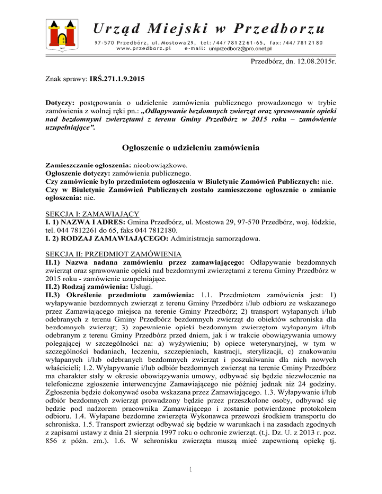 Przedbórz, dn. 12.08.2015r. Znak sprawy: IRŚ.271.1.9.2015 Dotyczy: postępowania o udzielenie zamówienia publicznego prowadzonego w trybie zamówienia z wolnej ręki pn.: „Odłapywanie bezdomnych zwierząt oraz sprawowanie opieki nad bezdomnymi zwierzętami z terenu Gminy Przedbórz w 2015 roku – zamówienie uzupełniające”. Ogłoszenie o udzieleniu zamówienia Zamieszczanie ogłoszenia: nieobowiązkowe. Ogłoszenie dotyczy: zamówienia publicznego. Czy zamówienie było przedmiotem ogłoszenia w Biuletynie Zamówień Publicznych: nie. Czy w Biuletynie Zamówień Publicznych zostało zamieszczone ogłoszenie o zmianie ogłoszenia: nie. SEKCJA I: ZAMAWIAJĄCY I. 1) NAZWA I ADRES: Gmina Przedbórz, ul. Mostowa 29, 97-570 Przedbórz, woj. łódzkie, tel. 044 7812261 do 65, faks 044 7812180. I. 2) RODZAJ ZAMAWIAJĄCEGO: Administracja samorządowa. SEKCJA II: PRZEDMIOT ZAMÓWIENIA II.1) Nazwa nadana zamówieniu przez zamawiającego: Odłapywanie bezdomnych zwierząt oraz sprawowanie opieki nad bezdomnymi zwierzętami z terenu Gminy Przedbórz w 2015 roku - zamówienie uzupełniające. II.2) Rodzaj zamówienia: Usługi. II.3) Określenie przedmiotu zamówienia: 1.1. Przedmiotem zamówienia jest: 1) wyłapywanie bezdomnych zwierząt z terenu Gminy Przedbórz i/lub odbioru ze wskazanego przez Zamawiającego miejsca na terenie Gminy Przedbórz; 2) transport wyłapanych i/lub odebranych z terenu Gminy Przedbórz bezdomnych zwierząt do obiektów schroniska dla bezdomnych zwierząt; 3) zapewnienie opieki bezdomnym zwierzętom wyłapanym i/lub odebranym z terenu Gminy Przedbórz przed dniem, jak i w trakcie obowiązywania umowy polegającej w szczególności na: a) wyżywieniu; b) opiece weterynaryjnej, w tym w szczególności badaniach, leczeniu, szczepieniach, kastracji, sterylizacji, c) znakowaniu wyłapanych i/lub odebranych bezdomnych zwierząt i poszukiwaniu dla nich nowych właścicieli; 1.2. Wyłapywanie i/lub odbiór bezdomnych zwierząt na terenie Gminy Przedbórz ma charakter stały w okresie obowiązywania umowy, odbywać się będzie niezwłocznie na telefoniczne zgłoszenie interwencyjne Zamawiającego nie później jednak niż 24 godziny. Zgłoszenia będzie dokonywać osoba wskazana przez Zamawiającego. 1.3. Wyłapywanie i/lub odbiór bezdomnych zwierząt prowadzony będzie przez przeszkolone osoby, odbywać się będzie pod nadzorem pracownika Zamawiającego i zostanie potwierdzone protokołem odbioru. 1.4. Wyłapane bezdomne zwierzęta Wykonawca przewozi środkiem transportu do schroniska. 1.5. Transport zwierząt odbywać się będzie w warunkach i na zasadach zgodnych z zapisami ustawy z dnia 21 sierpnia 1997 roku o ochronie zwierząt. (t.j. Dz. U. z 2013 r. poz. 856 z późn. zm.). 1.6. W schronisku zwierzęta muszą mieć zapewnioną opiekę tj. 1 odpowiednie miejsce przebywania, całodzienne wyżywienie oraz odpowiednią opiekę weterynaryjną. 1.7. W okresie obowiązywania umowy Wykonawca będzie dysponował stanowiskami dla bezdomnych zwierząt wyłapanych i/lub odebranych z terenu Gminy Przedbórz w ilości zapewniającej należytą realizację usługi objętej umowa. 1.8. Wykonawca będzie prowadził rejestr, który obejmować będzie w szczególności: 1) wykaz zwierząt wyłapanych i/lub odebranych z terenu Gminy Przedbórz wraz z terminem ich wyłapania i/lub odebrania w danym miesiącu; 2) wykaz zwierząt z terenu Gminy Przedbórz będących w danym miesiącu w schronisku wraz z liczbą dni ich pobytu; 3) wykaz zwierząt poddanych eutanazji z przyczyn humanitarnych, liczbę zwierząt padłych, liczbę zwierząt oddanych nowym właścicielom, zaszczepionych, leczonych oraz oznakowanych w danym miesiącu. 1.9. Zmawiający przewiduje, iż w schronisku Wykonawcy w okresie obowiązywania umowy przebywać będzie około 5 sztuk bezdomnych zwierząt z terenu Gminy Przedbórz, zaś Wykonawca zobowiązany będzie do dokonania około 4 wyłapań bezdomnych zwierząt z terenu Gminy Przedbórz i przyjęcia około 5 bezdomnych zwierząt do schroniska. Zamawiający wymaga aby ww. usługa była wykonywana zgodnie z przepisami: - ustawy z dnia 21 sierpnia 1997 r. - o ochronie zwierząt (tj.: Dz. U. z 2013 r. poz. 856 z późn. zm.); ustawy z dnia 11 marca 2004 r. - o ochronie zdrowia zwierząt oraz zwalczaniu chorób zakaźnych zwierząt (tj. Dz. U. z 2014 r., poz. 1539 z późn. zm.); - ustawie z dnia 13 września 1996 r. o utrzymaniu czystości i porządku w gminach (Dz.U. z 2013 r. poz. 1399 z późn. zm.); - rozporządzenia Ministra Spraw Wewnętrznych i Administracji z dnia 26 sierpnia 1998r. - w sprawie zasad i warunków wyłapywania bezdomnych zwierząt (Dz. U. Nr 116, poz. 753): - rozporządzeniem Ministra Rolnictwa i Rozwoju Wsi z dnia 23 czerwca 2004 r. w sprawie szczegłowych wymagań weterynaryjnych dla prowadzenia schronisk dla bezdomnych zwierząt (Dz. U. Nr 158, poz. 1657).. II.4) Wspólny Słownik Zamówień (CPV): 98.38.00.00-0, 85.20.00.00-1. SEKCJA III: PROCEDURA III.1) TRYB UDZIELENIA ZAMÓWIENIA: Zamówienie z wolnej ręki III.2) INFORMACJE ADMINISTRACYJNE Zamówienie dotyczy projektu/programu finansowanego ze środków Unii Europejskiej: nie SEKCJA IV: UDZIELENIE ZAMÓWIENIA IV.1) DATA UDZIELENIA ZAMÓWIENIA: 11.08.2015. IV.2) LICZBA OTRZYMANYCH OFERT: 1. IV.3) LICZBA ODRZUCONYCH OFERT: 0. IV.4) NAZWA I ADRES WYKONAWCY, KTÓREMU UDZIELONO ZAMÓWIENIA: Przytulisko i hotel dla zwierząt domowych Funy Pets Szturma Marta, Sieradz, 98-200 Cartki 49B, kraj/woj. łódzkie. IV.5) Szacunkowa wartość zamówienia (bez VAT): 5085,00 PLN. IV.6) INFORMACJA O CENIE WYBRANEJ OFERTY ORAZ O OFERTACH Z NAJNIŻSZĄ I NAJWYŻSZĄ CENĄ Cena wybranej oferty: 6254,55 Oferta z najniższą ceną: 6254,55 / Oferta z najwyższą ceną: 6254,55 Waluta: PLN. ZAŁĄCZNIK I Uzasadnienie udzielenia zamówienia w trybie negocjacji bez ogłoszenia, zamówienia z wolnej ręki albo zapytania o cenę 1. Podstawa prawna Postępowanie prowadzone jest w trybie zamówienie z wolnej ręki na