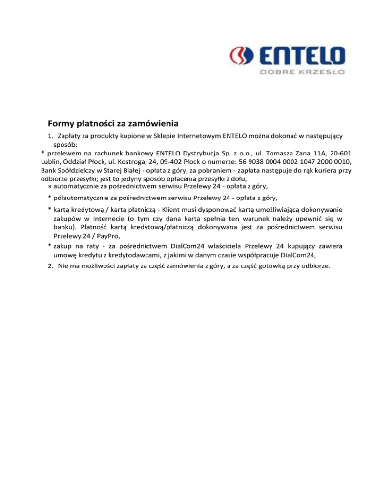 Formy płatności za zamówienia 1. Zapłaty za produkty kupione w Sklepie Internetowym ENTELO można dokonać w następujący sposób: * przelewem na rachunek bankowy ENTELO Dystrybucja Sp. z o.o., ul. Tomasza Zana 11A, 20-601 Lublin, Oddział Płock, ul. Kostrogaj 24, 09-402 Płock o numerze: 56 9038 0004 0002 1047 2000 0010, Bank Spółdzielczy w Starej Białej - opłata z góry, za pobraniem - zapłata następuje do rąk kuriera przy odbiorze przesyłki; jest to jedyny sposób opłacenia przesyłki z dołu, » automatycznie za pośrednictwem serwisu Przelewy 24 - opłata z góry, * półautomatycznie za pośrednictwem serwisu Przelewy 24 - opłata z góry, * kartą kredytową / kartą płatniczą - Klient musi dysponować kartą umożliwiającą dokonywanie zakupów w Internecie (o tym czy dana karta spełnia ten warunek należy upewnić się w banku). Płatność kartą kredytową/płatniczą dokonywana jest za pośrednictwem serwisu Przelewy 24 / PayPro, * zakup na raty - za pośrednictwem DialCom24 właściciela Przelewy 24 kupujący zawiera umowę kredytu z kredytodawcami, z jakimi w danym czasie współpracuje DialCom24, 2. Nie ma możliwości zapłaty za część zamówienia z góry, a za część gotówką przy odbiorze.