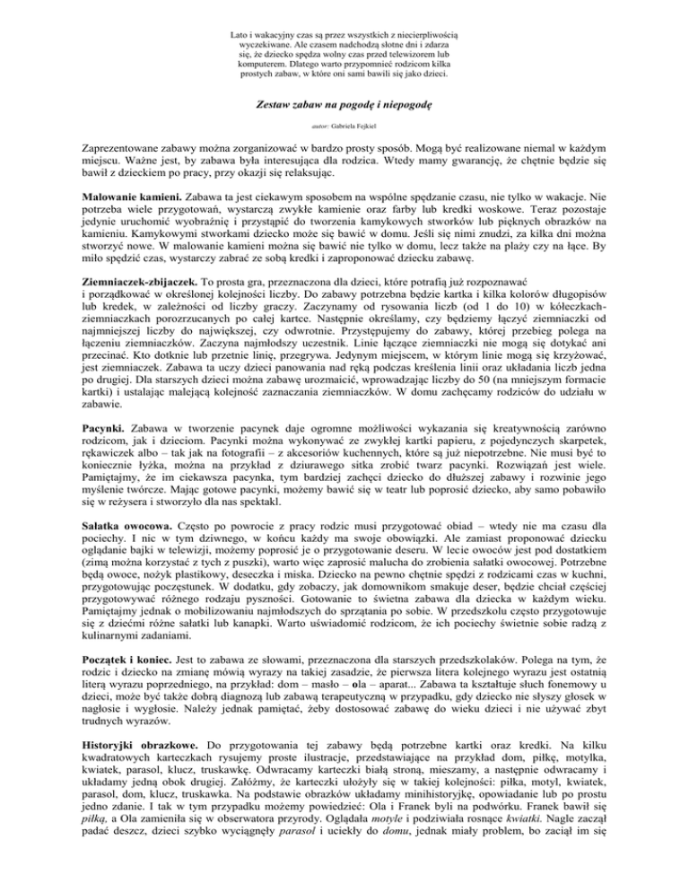 Lato i wakacyjny czas są przez wszystkich z niecierpliwością wyczekiwane. Ale czasem nadchodzą słotne dni i zdarza się, że dziecko spędza wolny czas przed telewizorem lub komputerem. Dlatego warto przypomnieć rodzicom kilka prostych zabaw, w które oni sami bawili się jako dzieci. Zestaw zabaw na pogodę i niepogodę autor: Gabriela Fejkiel Zaprezentowane zabawy można zorganizować w bardzo prosty sposób. Mogą być realizowane niemal w każdym miejscu. Ważne jest, by zabawa była interesująca dla rodzica. Wtedy mamy gwarancję, że chętnie będzie się bawił z dzieckiem po pracy, przy okazji się relaksując. Malowanie kamieni. Zabawa ta jest ciekawym sposobem na wspólne spędzanie czasu, nie tylko w wakacje. Nie potrzeba wiele przygotowań, wystarczą zwykłe kamienie oraz farby lub kredki woskowe. Teraz pozostaje jedynie uruchomić wyobraźnię i przystąpić do tworzenia kamykowych stworków lub pięknych obrazków na kamieniu. Kamykowymi stworkami dziecko może się bawić w domu. Jeśli się nimi znudzi, za kilka dni można stworzyć nowe. W malowanie kamieni można się bawić nie tylko w domu, lecz także na plaży czy na łące. By miło spędzić czas, wystarczy zabrać ze sobą kredki i zaproponować dziecku zabawę. Ziemniaczek-zbijaczek. To prosta gra, przeznaczona dla dzieci, które potrafią już rozpoznawać i porządkować w określonej kolejności liczby. Do zabawy potrzebna będzie kartka i kilka kolorów długopisów lub kredek, w zależności od liczby graczy. Zaczynamy od rysowania liczb (od 1 do 10) w kółeczkachziemniaczkach porozrzucanych po całej kartce. Następnie określamy, czy będziemy łączyć ziemniaczki od najmniejszej liczby do największej, czy odwrotnie. Przystępujemy do zabawy, której przebieg polega na łączeniu ziemniaczków. Zaczyna najmłodszy uczestnik. Linie łączące ziemniaczki nie mogą się dotykać ani przecinać. Kto dotknie lub przetnie linię, przegrywa. Jedynym miejscem, w którym linie mogą się krzyżować, jest ziemniaczek. Zabawa ta uczy dzieci panowania nad ręką podczas kreślenia linii oraz układania liczb jedna po drugiej. Dla starszych dzieci można zabawę urozmaicić, wprowadzając liczby do 50 (na mniejszym formacie kartki) i ustalając malejącą kolejność zaznaczania ziemniaczków. W domu zachęcamy rodziców do udziału w zabawie. Pacynki. Zabawa w tworzenie pacynek daje ogromne możliwości wykazania się kreatywnością zarówno rodzicom, jak i dzieciom. Pacynki można wykonywać ze zwykłej kartki papieru, z pojedynczych skarpetek, rękawiczek albo – tak jak na fotografii – z akcesoriów kuchennych, które są już niepotrzebne. Nie musi być to koniecznie łyżka, można na przykład z dziurawego sitka zrobić twarz pacynki. Rozwiązań jest wiele. Pamiętajmy, że im ciekawsza pacynka, tym bardziej zachęci dziecko do dłuższej zabawy i rozwinie jego myślenie twórcze. Mając gotowe pacynki, możemy bawić się w teatr lub poprosić dziecko, aby samo pobawiło się w reżysera i stworzyło dla nas spektakl. Sałatka owocowa. Często po powrocie z pracy rodzic musi przygotować obiad – wtedy nie ma czasu dla pociechy. I nic w tym dziwnego, w końcu każdy ma swoje obowiązki. Ale zamiast proponować dziecku oglądanie bajki w telewizji, możemy poprosić je o przygotowanie deseru. W lecie owoców jest pod dostatkiem (zimą można korzystać z tych z puszki), warto więc zaprosić malucha do zrobienia sałatki owocowej. Potrzebne będą owoce, nożyk plastikowy, deseczka i miska. Dziecko na pewno chętnie spędzi z rodzicami czas w kuchni, przygotowując poczęstunek. W dodatku, gdy zobaczy, jak domownikom smakuje deser, będzie chciał częściej przygotowywać różnego rodzaju pyszności. Gotowanie to świetna zabawa dla dziecka w każdym wieku. Pamiętajmy jednak o mobilizowaniu najmłodszych do sprzątania po sobie. W przedszkolu często przygotowuje się z dziećmi różne sałatki lub kanapki. Warto uświadomić rodzicom, że ich pociechy świetnie sobie radzą z kulinarnymi zadaniami. Początek i koniec. Jest to zabawa ze słowami, przeznaczona dla starszych przedszkolaków. Polega na tym, że rodzic i dziecko na zmianę mówią wyrazy na takiej zasadzie, że pierwsza litera kolejnego wyrazu jest ostatnią literą wyrazu poprzedniego, na przykład: dom – masło – ola – aparat... Zabawa ta kształtuje słuch fonemowy u dzieci, może być także dobrą diagnozą lub zabawą terapeutyczną w przypadku, gdy dziecko nie słyszy głosek w nagłosie i wygłosie. Należy jednak pamiętać, żeby dostosować zabawę do wieku dzieci i nie używać zbyt trudnych wyrazów. Historyjki obrazkowe. Do przygotowania tej zabawy będą potrzebne kartki oraz kredki. Na kilku kwadratowych karteczkach rysujemy proste ilustracje, przedstawiające na przykład dom, piłkę, motylka, kwiatek, parasol, klucz, truskawkę. Odwracamy karteczki białą stroną, mieszamy, a następnie odwracamy i układamy jedną obok drugiej. Załóżmy, że karteczki ułożyły się w takiej kolejności: piłka, motyl, kwiatek, parasol, dom, klucz, truskawka. Na podstawie obrazków układamy minihistoryjkę, opowiadanie lub po prostu jedno zdanie. I tak w tym przypadku możemy powiedzieć: Ola i Franek byli na podwórku. Franek bawił się piłką, a Ola zamieniła się w obserwatora przyrody. Oglądała motyle i podziwiała rosnące kwiatki. Nagle zaczął padać deszcz, dzieci szybko wyciągnęły parasol i uciekły do domu, jednak miały problem, bo zaciął im się kluczyk w drzwiach. Po chwili udało im się wejść do środka. Na deser przygotowały truskawki z cukrem. Podczas tej zabawy uruchamiamy wyobraźnię dzieci, a także kształtujemy ich sposób wypowiadania się. Ważne jest jednak, żeby nie poprawiać dzieci, chyba że popełniają błędy gramatyczne. Początki bywają trudne dla przedszkolaków, dlatego starajmy się im nie podpowiadać i pozwólmy opowiedzieć całą historyjkę. W warunkach 