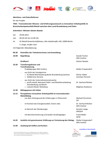 Abschluss- und Zukunftsforum für das Projekt TINA - Transnationaler Wissens- und Erfahrungsaustausch zu innovativer Arbeitspolitik im Branchenkompetenzfeld Metall zwischen dem Land Brandenburg und Polen Schirmherr: Minister Günter Baaske am 20.06.2012 von 09.30 Uhr bis 15.00 Uhr im IG Metall Gewerkschaftshaus, Alte Jakobstraße 149, 10969 Berlin 5. Etage, Großer Saal mit folgender Ablaufplanung 09.30 Eintreffen der TeilnehmerInnen und Anmeldung 10.00 Begrüßung Gunda Fischer IMU-Institut Grußwort Günter Baaske Transferergebnisse und Transferplanung Projektgruppe IMU-Institut Walter Krippendorf 10.30 - - aus Sicht der Sozialpartner o IG Metall Bezirksleitung Berlin Brandenburg Sachsen o Solidarnosc Gorzow aus Sicht der Unternehmensnetzwerke o profil.metall, Netzwerk Stahl- und Metallverarbeitung Brandenburg und Berlin o Lubuski Klaster Metalowy 12.30 Mittagspause mit Imbiss 13.15 Perspektiven innovativer Arbeitspolitik im transnationalen Metalldialog vor dem Hintergrund der Erfahrungen in Österreich Olivier Höbel Jaroslaw Porwich Dr. Gerhard Richter Zbigniew Rudowicz Michael Förschner ZSI - im Kontext des Energiewandels: Green Jobs Dr. Gerhard Richter IMU-Institut - im Bereich der Windenergie Karsten Lange WEQUA - mit Berufsorientierung und dualen Studiengängen Frank Röder QCW 14.45 Ausblick mit gemeinsamer Erklärung zur Fortsetzung des Dialogs 15.00 Ausklang bei Kaffee und Kuchen Walter Krippendorf IMU-Institut Investition in Ihre Zukunft Das Projekt TINA wird durch das Ministerium für Arbeit, Soziales, Frauen und Familie aus Mitteln des Europäischen Sozialfonds und des Landes Brandenburg gefördert. Tłumaczenie zaproszenia: Zakończenie i ustalenie formy kontynuacji projektu TINA - „Międzynarodowy transfer wiedzy i doświadczeń odnośnie innowacyjnej polityki zatrudnienia w branży metalowej pomiedzy landem Brandenburgia i Polską” pod auspicjami Ministerstwa Pracy, Spraw Socjalnych, Kobiet i Rodziny Kraju Związkowego Brandenburg, Pana Günter'a Baaske w dniu od w 20.06.2012 09.30 do 15.00 IG Metall Gewerkschaftshaus, Alte Jakobstrasse 149, 10969 Berlin V piętro, Grosser Sall z poniższym programem: 09.30 rejestracja uczestników 10.00 powitanie Gunda Fischer IMU-Institut powitanie Günter Baaske 10.30 Wyniki transfer i plany transferu grupa projektantów z punktu widzenia partnerów socjalnych o IG – kierownictwo regionu Berlin, Brandenburgia, Saksonia o Solidarność Gorzów z punktu widzenia zakładów przemysłowych członków klastrów o profil.metal sieć obróbka stali i metalu o LKM 12.30 Przerwa obiadowa, poczęstunek 13.15 perspektywy innowacyj nej polityki zatrudnienia w międzynarodowym dialogu w branży metalowej z uwzględnieniem doświadczeń austyjackich - w kontekscie przetwarzania energii: green jobs - w zakresie energii wiatrowej - z punktu widzenia orientacji zawodowej w kształceniu dualnym 14.45 Rozważenie deklaracji wspólnej kontynuacji dialogu 15.00 Podsumowanie przy kawie i słodyczch Walter Krippendorf Olivier Höbel Jarosław Porwich Dr. Gerhard Richter Zbigniew Rudowicz Michael Förschner ZSI Dr. Gerhard Richter IMU-Institut Karsten Lange WEQUA Frank Röder QCW Walter Krippendorf IMU-Institut Investition in Ihre Zukunft Das Projekt TINA wird durch das Ministerium für Arbeit, Soziales, Frauen und Familie aus Mitteln des Europäischen Sozialfonds und des Landes Brandenburg gefördert.