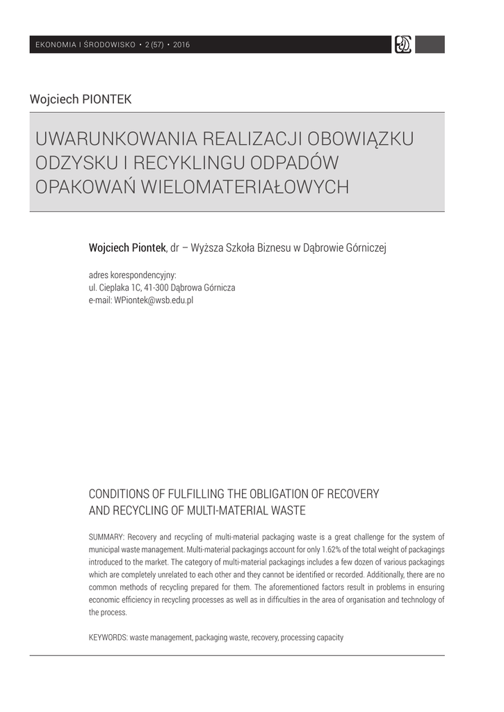 EKONOMIA I ŚRODOWISKO • 2 (57) • 2016 Wojciech PIONTEK UWARUNKOWANIA REALIZACJI OBOWIĄZKU ODZYSKU I RECYKLINGU ODPADÓW OPAKOWAŃ WIELOMATERIAŁOWYCH Wojciech Piontek, dr – Wyższa Szkoła Biznesu w Dąbrowie Górniczej adres korespondencyjny: ul. Cieplaka 1C, 41-300 Dąbrowa Górnicza e-mail: [email protected] CONDITIONS OF FULFILLING THE OBLIGATION OF RECOVERY AND RECYCLING OF MULTI-MATERIAL WASTE SUMMARY: Recovery and recycling of multi-material packaging waste is a great challenge for the system of municipal waste management. Multi-material packagings account for only 1.62% of the total weight of packagings introduced to the market. The category of multi-material packagings includes a few dozen of various packagings which are completely unrelated to each other and they cannot be identified or recorded. Additionally, there are no common methods of recycling prepared for them. The aforementioned factors result in problems in ensuring economic efficiency in recycling processes as well as in difficulties in the area of organisation and technology of the process. KEYWORDS: waste management, packaging waste, recovery, processing capacity EKONOMIA I ŚRODOWISKO 2 (57) • 2016 Polityka ekologiczna i zarządzanie środowiskiem Wstęp Odzysk i recykling odpadów opakowań wielomateriałowych jest szczególnym wyzwaniem dla systemu gospodarowania odpadami komunalnymi. Opakowania wielomateriałowe stanowią jedynie 1,62% całkowitej masy opakowań wprowadzanych na rynek. Kategorię tworzy kilkadziesiąt różnego typu opakowań, których nic nie łączy, identy ikacja i ewidencja są praktycznie niemożliwe, a ponadto nie istnieją wspólne metody recyklingu. Czynniki powyższe skutkują problemami w zapewnieniu ekonomicznej efektywności procesów recyklingu, jak również trudnościami organizacyjno-technologicznymi. W przygotowaniu artykułu wykorzystane zostały wyniki badań przeprowadzonych w ramach projektu Analiza warunków przetwarzania odpadów opakowaniowych po środkach niebezpiecznych oraz odpadów po opakowaniach wielomateriałowych w Polsce.1 Charakterystyka strumienia odpadów opakowań wielomateriałowych W świetle ustawowej de inicji opakowaniem wielomateriałowym „jest opakowanie wykonane co najmniej z dwóch różnych materiałów, których nie można rozdzielić ręcznie lub za pomocą prostych metod mechanicznych”2. Pod pojęciem materiałów rozumie się zaś stałe substancje o ściśle określonych właściwościach. Pomimo precyzyjnej de inicji pojęcia opakowania wielomateriałowego, do analizowanej kategorii opakowań nie zalicza się opakowań będących połączeniem różnych tworzyw sztucznych, które klasy ikowane są jako opakowania monomateriałowe. Źródeł zaistniałej sytuacji należy upatrywać w sposobie interpretacji decyzji Komisji 97/129/WE ustanawiającej system identy ikacji materiałów opakowaniowych3. Wskazana decyzja w załączniku VII odnoszącym się do opakowań wielomateriałowych nie 1 2 3 W. Piontek, S. Jarzębowski, Analiza warunków przetwarzania odpadów opakowaniowych po środkach niebezpiecznych oraz odpadów po opakowaniach wielomateriałowych w Polsce, Warszawa 2015. Praca wykonana na zamówienie Departamentu Gospodarki Odpadami Ministerstwa Środowiska. Ustawa z dnia 13 czerwca 2013 r. o gospodarce opakowaniami i odpadami opakowaniowymi (Dz.U. 2013, poz. 888, art. pkt.10). Decyzja Komisji 97/129/WE z dnia 28 stycznia 1997 r. ustanawiająca system identyikacji materiałów opakowaniowych zgodnie z dyrektywą Parlamentu Europejskiego i Rady 94/62/WE w sprawie opakowań i odpadów opakowaniowych. 55 Polityka ekologiczna i zarządzanie środowiskiem EKONOMIA I ŚRODOWISKO 2 (57) • 2016 przewiduje systemu oznaczania opakowań zbudowanych wyłącznie z różnych rodzajów tworzyw sztucznych (plastik/plastik, plastik/plastik/plastik). Wykorzystywane do produkcji opakowań tworzywa sztuczne charakteryzują się silnym zróżnicowaniem cech izykochemicznych i nie można ich traktować jako jednego materiału. Recykling opakowania będącego połączeniem różnych tworzyw sztucznych wymaga wykorzystania zaawansowanych technologii, o większym stopniu złożoności niż przykładowo recykling opakowań wielomateriałowych o dominującym udziale papieru. Mg 80000 66974 70000 60000 50000 40000 1369 587 160 9 Wielomateriaowe z przewagȤ drewna 0 Wielomateriaowe z przewagȤ szka 10000 Wielomateriaowe z przewagȤ papieru i tektury 20761 Wielomateriaowe z przewagȤ stali 20000 Wielomateriaowe z przewagȤ aluminium 30000 Wielomateriaowe z przewagȤ tworzywa sztucznego 56 Rysunek 1. Masa i struktura opakowań wielomateriałowych wprowadzonych na rynek w 2014 roku zgodnie z raportami izb gospodarczych realizujących porozumienia Źródło: opracowanie własne na podstawie: Zbiorcze zestawienie informacji dotyczących funkcjonowania porozumień pomiędzy izbami gospodarczymi a marszałkami województw, www.mos.gov.pl [20-03-2016]. Dostępne dane dotyczące masy wprowadzanych na rynek opakowań wielomateriałowych charakteryzują znaczące rozbieżności. Przykładowo, w 2014 roku zgodnie z raportami OŚ-OP2 na rynek wprowadzonych zostało EKONOMIA I ŚRODOWISKO 2 (57) • 2016 Polityka ekologiczna i zarządzanie środowiskiem 80,1 tys. Mg opakowań, a zgodnie ze sprawozdaniami izb gospodarczych realizujących porozumienia masa ta wyniosła 90 tys. Mg. Strukturę rodzajową wprowadzanego na rynek strumienia opakowań wielomateriałowych przedstawia rysunek 1. Przeważający udział w strumieniu mają opakowania wielomateriałowe o dominującym udziale papieru i tektury (67 tys. Mg) oraz o dominującym udziale tworzyw sztucznych (21 tys. Mg). Udział pozostałych opakowań w strumieniu jest marginalny. W ramach kategorii opakowań o dominującym udziale papieru i tektury podstawowymi są kartony do żywności płynnej. W minionych 10 latach zaobserwowano stały 2% wzrost masy wprowadzanych na rynek kartonów, która w 2014 roku osiągnę