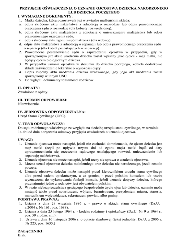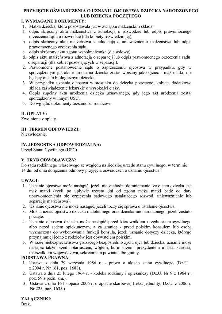 PRZYJĘCIE OŚWIADCZENIA O UZNANIU OJCOSTWA DZIECKA NARODZONEGO LUB DZIECKA POCZĘTEGO I. WYMAGANE DOKUMENTY: 1. Matka dziecka, która pozostawała już w związku małżeńskim składa: a. odpis skrócony aktu małżeństwa z adnotacją o rozwodzie lub odpis prawomocnego orzeczenia sądu o rozwodzie (dla kobiety rozwiedzionej), b. odpis skrócony aktu małżeństwa z adnotacją o unieważnieniu małżeństwa lub odpis prawomocnego orzeczenia sądu, c. odpis skrócony aktu zgonu współmałżonka (dla wdowy). d. odpis aktu małżeństwa z adnotacją o separacji lub odpis prawomocnego orzeczenia sądu o separacji (dla kobiet pozostających w separacji). 2. Prawomocne postanowienie sądu o zaprzeczeniu ojcostwa w przypadku, gdy w sporządzonym już akcie urodzenia dziecka został wpisany jako ojciec - mąż matki, nie będący ojcem biologicznym dziecka. 3. W przypadku uznania ojcostwa w stosunku do dziecka poczętego, kobieta dodatkowo składa zaświadczenie lekarskie o wysokości ciąży. 4. Odpis zupełny aktu urodzenia dziecka uznawanego, gdy jego akt urodzenia został sporządzony w innym USC. 5. Do wglądu: dokumenty tożsamości rodziców. II. OPŁATY: Zwolnione z opłaty. III. TERMIN ODPOWIEDZI: Niezwłocznie. IV. JEDNOSTKA ODPOWIEDZIALNA: Urząd Stanu Cywilnego (USC). V. TRYB ODWOŁAWCZY: Do sądu rodzinnego właściwego ze względu na siedzibę urzędu stanu cywilnego, w terminie 14 dni od dnia doręczenia odmowy przyjęcia oświadczeń o uznaniu ojcostwa. UWAGI: 1. Uznanie ojcostwa może nastąpić, jeżeli nie zachodzi domniemanie, że ojcem dziecka jest mąż matki (czyli po upływie trzystu dni od zgonu męża matki bądź od daty uprawomocnienia się orzeczenia sądowego ustalającego rozwód, unieważnienie lub separację małżeństwa). 2. Uznanie ojcostwa nie może nastąpić, jeżeli toczy się sprawa o ustalenie ojcostwa. 3. Można uznać ojcostwo dziecka małoletniego oraz dziecka nie narodzonego, jeżeli zostało poczęte. 4. Uznanie ojcostwa dziecka może nastąpić przed kierownikiem urzędu stanu cywilnego albo przed sądem opiekuńczym, a za granicą - przed polskim konsulem lub osobą wyznaczoną do wykonywania funkcji konsula, jeżeli uznanie dotyczy dziecka, którego przynajmniej jedno z rodziców jest obywatelem polskim. 5. W razie niebezpieczeństwa grożącego bezpośrednio życiu ojca lub dziecka, uznanie może nastąpić także przed notariuszem, wójtem, burmistrzem, prezydentem miasta, starostą, marszałkiem województwa, sekretarzem powiatu albo gminy. PODSTAWA PRAWNA: 1. Ustawa z dnia 29 września 1986 r. - prawo o aktach stanu cywilnego (Dz.U. z 2004 r. Nr 161, poz. 1688). 2. Ustawa z dnia 25 lutego 1964 r. - kodeks rodzinny i opiekuńczy (Dz.U. Nr 9 z 1964 r., poz. 59 z późn. zm.). 3. Ustawa z dnia 16 listopada 2006 r. o opłacie skarbowej (tekst jednolity: Dz.U. z 2006 r. Nr 225, poz. 1635.) ZAŁĄCZNIKI: Brak.