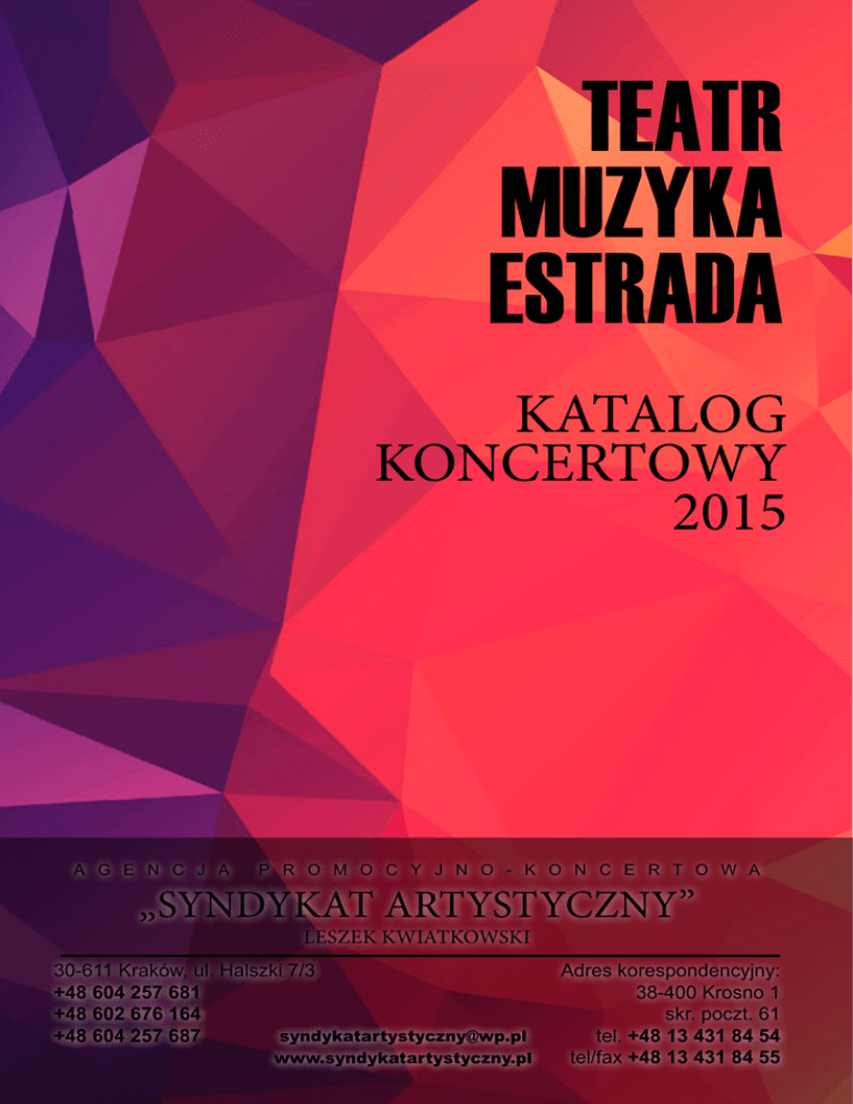 TEATR MUZYKA ESTRADA KATALOG KONCERTOWY 2015 A g e n c j a P r o m o c y j n o - k o n c e r t o w a „Syndykat Artystyczny” Leszek Kwiatkowski 30-611 Kraków, ul. Halszki 7/3 +48 604 257 681 +48 602 676 164 [email protected] +48 604 257 687 www.syndykatartystyczny.pl Adres korespondencyjny: 38-400 Krosno 1 skr. poczt. 61 tel. +48 13 431 84 54 tel/fax +48 13 431 84 55 1 POPROCK............................................ 3 POPFOLK ........................................... 8 BIESIADY ........................................... 9 W wieloletniej działalności Agencji dominuje produkcja koncertów i różnego rodzaju projektów artystycznych. Agencja prowadzi działalność na terenie Polski i Europy przy współpracy czterech przedstawicielstw: w Słowacji, w Niemczech, w Rosji i Kanadzie. Od kilkunastu lat promujemy artystów w corocznych edycjach Katalogu Koncertowego, zawierających szeroki wachlarz sztuki estradowej, który umożliwia realizację większości pomysłów artystycznych. Współpracujemy ze znanymi i wybitnymi artystami sceny i estrady polskiej i zagranicznej, produkujemy programy estradowe, muzyczne i spektakle teatralne. Promujemy nowe twarze rodzimej rozrywki. Syndykat Artystyczny, to: Koncerty: • realizacja projektów artystycznych w pełnym zakresie (scenariusz, program, reżyseria, technika estradowa) • organizacja koncertów, eventów, imprez firmowych i okolicznościowych, festynów, pikników, widowisk plenerowych, imprez klubowych i hotelowych • pełen zakres techniki estradowej (nagłośnienie, oświetlenie, estrady, wizualizacja, efekty pirotechniczne i laserowe) • reżyseria koncertów estradowych, festiwali, przeglądów Produkcja: • produkcja zespołów artystycznych • produkcja płyt i teledysków • scenariuszy programów artystycznych • tekstów autorskich (konferansjerka, piosenki, teksty kabaretowe) • współpraca z polskimi i zagranicznymi kompozytorami, aranżerami, autorami tekstów Promocja: • promocja artystów (media, PR, marketing, reklama, internet, katalog koncertowy) W opinii naszych klientów Agencję cechuje doświadczenie, solidność i wiarygodność, profesjonalizm i perfekcja w realizacji zleconych projektów. Leszek Kwiatkowski Kraków, 2015-01-01 22 Małgorzata Filipiak-Kwiatkowska COVERY ............................................. 12 DISCOPOLO ........................................ 15 ROCK&ROLL / BLUES .......................... 17 ZESPOŁY ZAGRANICZNE...................... 21 HIP-HOP ............................................ 22 GRUPY FOLKOWE ............................... 23 KABARETY ........................................ 25 PROGRAMY DLA DZIECI / ILUZJA......... 28 PIOSENKA ROSYJSKA ......................... 29 PIOSENKA CZESKA I SŁOWACKA......... 29 PIOSENKA WŁOSKA............................ 30 piosenka francuska....................... 31 PIOSENKA LITERACKA I AUTORSKA.... 31 PIOSENKA PATRIOTYCZNA.................. 32 COUNTRY............................................. 33 RECITALE AKTORSKIE......................... 33 ORKIESTRY ROZRYWKOWE................. 34 KAMERALIŚCI ...................................... 35 KOLĘDY............................................................................... 36 FORMACJE TANECZNE......................... 36 KONFERANSJERZY ............................. 37 WIDOWISKA ULICZNE .............................. 39 pOKAZY ŚWIETLNE I PIROTECHNICZNE... 40 TEATR NA ŻARTY ..................................... 41 POPROCK DODA FEEL od 40 000 netto Doda to obecnie najpopularniejsza osoba w Polsce. CNN umieściło ją na liście najbardziej znanych na świecie Polaków w całej historii kraju. Od kilku lat jest najczęściej wyszukiwaną osobą w polskim internecie. KAMIL BEDNAREK od 35 000 netto NATALIA SIKORA EWELINA LISOWSKA od 23 000 netto od 30 000 netto Oczarowała polską publiczność utworem „Nowe szanse„, który stworzyła razem z raperem Liberem. Single „Co z nami będzie” i „Mijamy się” stały się megaprzebojami. Wszystkie piosenki artystki stały się hitami, a liczne prestiżowe nagrody potwierdzają jej talent. Niesamowita energia i dużo dobrej polskiej muzyki to gwarancja świetnej zabawy. MARGARET od 14 000 netto Zwyciężczyni II edycji programu The Voice of Poland. Laureatka konkursu Super Debiuty na Krajowym Festiwalu Piosenki Polskiej w Opolu. Za wykonanie utworu „Konie” zdobyła główną nagrodę przyznawaną przez widzów. Dawka mega atmosfery w pop-rockowym klimacie. Różnorodność muzyczna koncertu gwarantuje świetną zabawę. Ola Szwed wykonuje własne utwory oraz znane i lubiane piosenki polskie i zagranicze. Ich Troje to najbardziej znany i utytułowany polski zespół, bijący rekordy w ilości sprzedanych płyt i zagranych koncertów. Doskonali muzycy i wokaliści pod wodzą charyzmatycznego Michała Wiśniewskiego tworząnajbardziej spekta SYLWIA GRZESZCZAK W 2010 roku Bednarek wziął udział w trzeciej edycji programu Mam talent! emitowanego przez stację telewizyjną TVN. Po finałowym wykonaniu „Is This Love” Boba Marleya, zdobył 2. miejsce na podium show. od 13 500 netto od 47 000 netto Zdobywcy głównych nagród w konkursie o Bursztynowego Słowika i Słowika Publiczności 44 Międzynarodowego Sopot Festival 2007. od 23 500 netto ALEKSANDRA SZWED ICH TROJE JULA od 21 000 netto od 18 000 netto Polska piosenkarka i blogerka modowa. Popularność zyskała dzięki piosence „Thank You Very Much”. W 2013 została nominowana do nagrody Eska Music Awards w kategoriach Najlepsza artystka, Najlepszy hit oraz Najlepszy debiut. ALEKSANDRA JABŁONKA RAFAŁ BRZOZOWSKI od 13 000 netto Znana z programu „Jaka to melodia?” Aleksandra Jabłonka zadebiutowała pod pseudonimem Alexandra. Jej piosenka „Popłyniemy daleko” długo cieszyła się ogromną popularnością. Znana z przebojów „Za każdym razem”, „Nie zatrzymasz mnie” i „Kiedyś odnajdziemy siebie”. Popularność zyskała dzięki swoim amatorskim