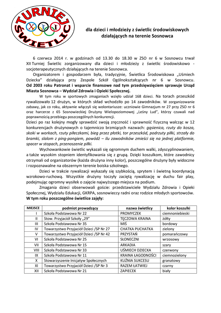 dla dzieci i młodzieży z świetlic środowiskowych działających na terenie Sosnowca 6 czerwca 2014 r. w godzinach od 13.30 do 18.30 w ZSO nr 6 w Sosnowcu trwał XII Turniej Świetlic zorganizowany dla dzieci i młodzieży z świetlic środowiskowo socjoterapeutycznych działających na terenie Sosnowca. Organizatorem i gospodarzem była, tradycyjnie, Świetlica Środowiskowa „Uśmiech Dziecka” działająca przy Zespole Szkół Ogólnokształcących nr 6 w Sosnowcu. Od 2003 roku Patronat i wsparcie finansowe nad tym przedsięwzięciem sprawuje Urząd Miasta Sosnowca – Wydział Zdrowia i Opieki Społecznej. W tym roku w sportowych zmaganiach wzięło udział 168 dzieci. Na torach przeszkód rywalizowało 12 drużyn, w których skład wchodziło po 14 zawodników. W zorganizowanie zabawy, jak co roku, aktywnie włączyli się wolontariusze: uczniowie Gimnazjum nr 27 przy ZSO nr 6 oraz harcerze z 65 Sosnowieckiej Drużyny Wielopoziomowej „Leśny Lud”, którzy czuwali nad poprawnością przebiegu poszczególnych konkurencji. Dzieci po raz kolejny mogły sprawdzić swoją zręczność i sprawność fizyczną walcząc w 12 konkurencjach drużynowych o tajemniczo brzmiących nazwach: gąsienica, rzuty do kosza, skoki w workach, rzuty piłeczkami, bieg przez płotki, tor przeszkód, podrzuty piłki, strzały do bramki, slalom z ping-pongiem, powódź – ilu zawodników zmieści się na jednej platformie, spacer w stopach, przenoszenie piłki. Wychowankowie świetlic wykazali się ogromnym duchem walki, zdyscyplinowaniem, a także wysokim stopniem identyfikowania się z grupą. Dzięki koszulkom, które zawodnicy otrzymali od organizatorów (każda drużyna inny kolor), poszczególne drużyny były widoczne i rozpoznawalne na obszernym terenie boiska szkolnego. Dzieci w trakcie rywalizacji wykazały się szybkością, sprytem i świetną koordynacją wzrokowo-ruchową. Wszystkie drużyny toczyły zaciętą rywalizację w duchu fair play, podejmując ogromny wysiłek o zajęcie najwyższego miejsca na podium. Zmagania dzieci obserwowali goście: przedstawiciele Wydziału Zdrowia i Opieki Społecznej, Wydziału Edukacji, GKRPA, sosnowieccy radni oraz rodzice młodych sportowców. W tym roku poszczególne świetlice zajęły: MIEJSCE I II III IV V VI VII VIII IX X XI XII podmiot prowadzący Szkoła Podstawowa Nr 22 Stow. Przyjaciół Szkoły „29” Szkoła Podstawowa Nr 35 Towarzystwo Przyjaciół Dzieci /SP Nr 27 Towarzystwo Przyjaciół Dzieci /SP Nr 42 Szkoła Podstawowa Nr 25 Szkoła Podstawowa Nr 15 Szkoła Podstawowa Nr 33 Szkoła Podstawowa Nr 11 Stowarzyszenie Inicjatyw Społecznych Towarzystwo Przyjaciół Dzieci /SP Nr 3 Szkoła Podstawowa Nr 21 nazwa świetlicy PROMYCZEK TĘCZOWA KRAINA MIŚ CHATKA PUCHATKA PRZYSTAŃ SŁONECZNI ARKADIA UŚMIECH DZIECKA KRAINA ŁAGODNOŚCI KUŹNIA SUKCESU RAZEM ŁATWIEJ ZAPIECEK kolor koszulki ciemnoniebieski żółty bordowy zielony pomarańczowy wrzosowy szary czerwony ciemnozielony granatowy czarny biały Zaproszeni goście uroczyście wręczyli wszystkim uczestnikom puchary, medale i nagrody indywidualne. Nikogo nie ominął również poczęstunek. Udział w Turnieju dostarczył okazji do świetnej zabawy i honorowej rywalizacji, dał możliwość aktywnej rekreacji, rozwinął umiejętności sportowe i zwiększył kondycję fizyczną dzieci. Dodatkowym atutem była możliwość poznania rówieśników, nawiązywania nowych kontaktów i znajomości. Na zakończenie uczestnicy spartakiady wzięli udział w pokazie przygotowanym przez Bractwo Rycerskie z Będzina. Rycerze przybliżyli dzieciom średniowieczne zwyczaje i obyczaje oraz kodeks rycerski. Ćwiczyli również wychowanków świetlic w trudnym fachu rycerskim. Zadowolone dzieci, wychowawcy i zaproszeni goście już zapowiedzieli uczestnictwo w kolejnych turniejach.