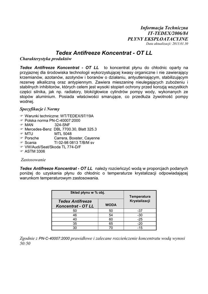 Informacja Techniczna IT-TEDEX/2006/84 PŁYNY EKSPLOATACYJNE Data aktualizacji: 2013.01.30 Tedex Antifreeze Koncentrat - OT LL Charakterystyka produktów Tedex Antifreeze Koncentrat - OT LL to koncentrat płynu do chłodnic oparty na przyjaznej dla środowiska technologii wykorzystującej kwasy organiczne i nie zawierający krzemianów, azotanów, azotynów i boranów o działaniu, antyutleniającym, stabilizującym rezerwę alkaliczną oraz antypiennym. Zawiera mieszaninę nieulegających zubożeniu i stabilnych inhibitorów, których celem jest wysoki stopień ochrony przed korozją wszystkich części silnika, jak np. radiatory, bloki/głowice cylindrów pompy wody, wykonanych ze stopów aluminium. Posiada właściwości smarujące, co przedłuża żywotność pompy wodnej. Specyfikacje i Normy Warunki techniczne: WT/TEDEX/97/19A Polska norma PN-C-40007:2000 MAN 324-SNF Mercedes-Benz DBL 7700.30, Blatt 325.3 MTU MTL 5048 Porsche Carrera, Boxster, Cayenne Scania TI 02-98 0813 T/B/M sv VW/Audi/Seat/Skoda TL 774-D/F ASTM 3306 Zastosowanie Tedex Antifreeze Koncentrat - OT LL należy rozcieńczyć wodą w proporcjach podanych poniżej do uzyskania płynu do chłodnic o temperaturze krystalizacji odpowiadającej warunkom temperaturowym zastosowania. Skład płynu w % obj. Temperatura Krystalizacji Tedex Antifreeze Koncentrat - OT LL WODA 50 46 40 35 30 50 54 60 65 70 -37 -30 -25 -20 -15 Zgodnie z PN-C-40007:2000 prawidłowe i zalecane rozcieńczenie koncentratu wodą wynosi 50:50 Właściwości fizyko-chemiczne - wartości typowe Tedex Antifreeze Koncentrat - OT LL 1,123 Gęstość w 20°C, [kg/m3] pH 8,1 Rezerwa alkaliczna, [ml] 20,5 167 Temperatura wrzenia, n.n.n., [°C] -37 Temperatura krystalizacji, n.n.n., [°C] Korozja w naczyniu szklanym, zmiana masy płytek, [mg] - miedź -0,8 - lutowie -1,2 - mosiądz -0,9 - stal +0,1 - żeliwo + 1,3 - stop aluminium -4,0 Ocena powierzchni płytek, wg opisu bez wżerów korozyjnych Podane parametry są danymi standardowymi, zastrzegamy sobie prawo zmian wynikających z postępu technicznego. Właściwości użytkowe Tedex Antifreeze Koncentrat - OT LL posiada bardzo dobre właściwości użytkowe, takie jak: efektywna wymiana ciepła i szybkie chłodzenie silnika właściwości przeciwkorozyjne - skutecznie zabezpieczające elementy chłodnicy przed korozją wysoką odporność na utlenianie pozwalającą na długi okres używania płynu właściwości antypienne - zapobiegające tworzeniu się piany Tedex Antifreeze Koncentrat - OT LL jest zamienny i mieszalny z płynami produkcji zachodniej z krajowej klasy ASTM 3306 znanych marek. Własności BHP i przeciwpożarowe Tedex Antifreeze Koncentrat - OT LL jest silnie toksyczny - spożycie go grozi śmiercią; klasa niebezpieczeństwa pożarowego – IV; płyn ulega biodegradacji; Przechowywanie i transport Płyn Tedex Antifreeze Koncentrat - OT LL należy przechowywać w opakowaniach zamkniętych, chroniących go przed dostępem zanieczyszczeń mechanicznych. Można go przewozić zarówno luzem, jak i w opakowaniach jednostkowych środkami transportu samochodowego lub kolejowego, gdyż nie stwarza zagrożeń. Informacje o stosowaniu olejów i smarów TEDEX udziela : T E D EX S . A . 9 7 - 2 0 0 Tomaszów Mazowiecki, Cygan2 tel. (0-44) 724 95 62, (0-44) 725 29 15