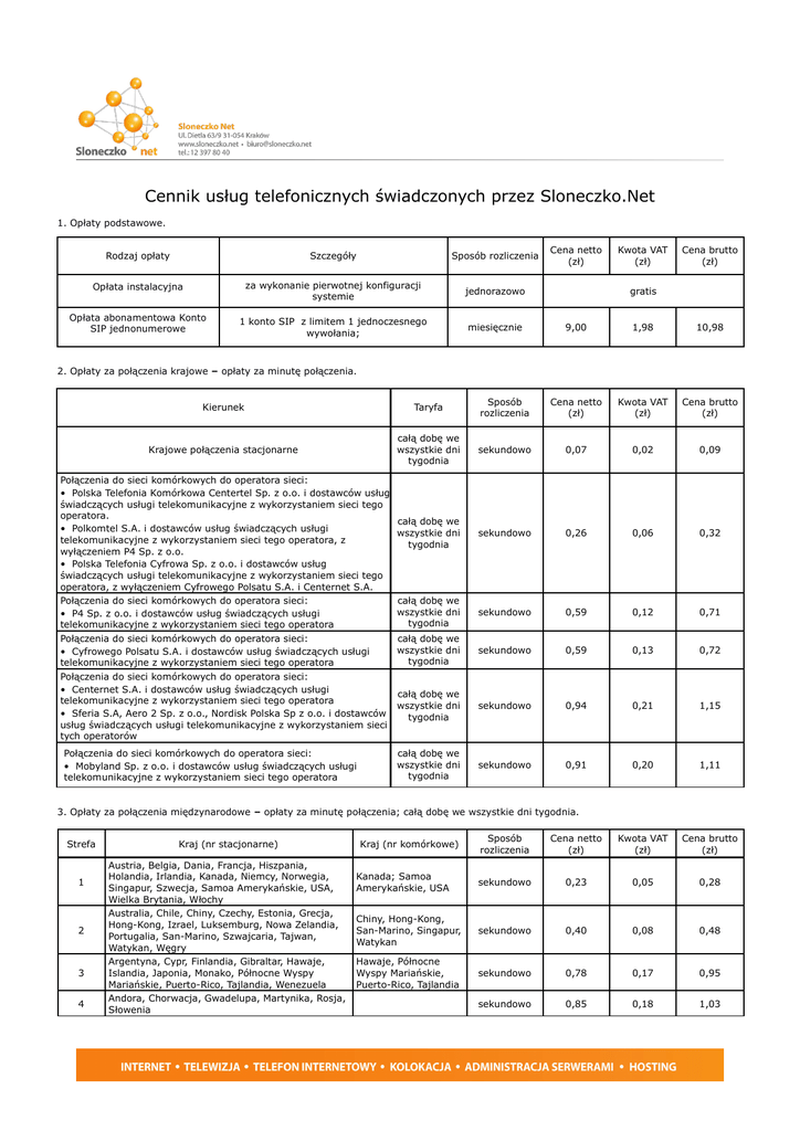 Cennik usług telefonicznych świadczonych przez Sloneczko.Net