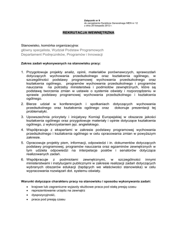 Załącznik nr 9 do zarządzenia Dyrektora Generalnego MEN nr 12 z dnia 29 listopada 2012 r. REKRUTACJA WEWNĘTRZNA Stanowisko, komórka organizacyjna: główny specjalista, Wydział Podstaw Programowych Departament Podręczników, Programów i Innowacji Zakres zadań wykonywanych na stanowisku pracy: 1. Przygotowuje projekty analiz, opinii, materiałów porównawczych, sprawozdań dotyczących wychowania przedszkolnego oraz kształcenia ogólnego, w szczególności podstawy programowej wychowania przedszkolnego oraz kształcenia ogólnego, programów wychowania przedszkolnego i programów nauczania na potrzeby ministerstwa i podmiotów zewnętrznych, które są podstawą tworzenia zmian w ustawie o systemie oświaty i rozporządzeniu w sprawie podstawy programowej wychowania przedszkolnego i kształcenia ogólnego. 2. Bierze udział w konferencjach i spotkaniach przedszkolnego oraz kształcenia ogólnego oraz problematyki. dotyczących wychowania dokonuje prezentacji tej 3. Upowszechnia priorytety i inicjatywy Komisji Europejskiej w obszarze jakości kształcenia ogólnego oraz przygotowuje materiały i opinie dotyczące kształcenia ogólnego, z wykorzystaniem jęz. angielskiego. 4. Współpracuje z ekspertami w zakresie podstawy programowej wychowania przedszkolnego i kształcenia ogólnego w celu opracowania zmian w powyższym zakresie. 5. Opracowuje projekty pism, informacji, odpowiedzi i in. dokumentów dotyczących podstawy programowej, programów nauczania oraz egzaminów zewnętrznych w tym udziela odpowiedzi na interpelacje posłów i senatorów dotyczące realizowanych zadań. 6. Współpracuje z podmiotami zewnętrznymi, w szczególności innymi ministerstwami i instytucjami publicznymi w zakresie realizacji zadań dotyczących wybranych obszarów edukacji (będących we właściwości stanowiska) w celu wypracowania rozwiązań dot. systemu oświaty. Warunki dotyczące charakteru pracy na stanowisku i sposobu wykonywania zadań: krajowe lub zagraniczne wyjazdy służbowe praca pod stałą presją czasu reprezentowanie urzędu na zewnątrz dyspozycyjność, praca pod presją czasu Wymagania z w i ą z a n e z e s t a n o w i s k i e m p r a c y: wymagania niezbędne: wykształcenie: wyższe staż pracy: 3 lata stażu pracy w obszarze oświaty pozostałe wymagania niezbędne: znajomość języka angielskiego na poziomie bardzo dobrym (B2) znajomość przepisów ustawy o systemie oświaty znajomość podstawy programowej wychowania przedszkolnego oraz kształcenia ogólnego znajomość organizacji nauczania i licznych aktów prawnych z tego zakresu (rozporządzenia w sprawie: ramowych planów nauczania, statutów szkół, organizacji nauczania wychowania fizycznego, religii, etyki, wychowania do życia w rodzinie, przysposobienia obronnego, oceniania i klasyfikowania, sprawdzianu egzaminów) znajomość współczesnych trendów w edukacji, wiedza na temat systemów edukacji i treści nauczania w innych krajach UE znajomość zasad funkcjonowania administracji publicznej (w zakresie podziału, zasad organizacji i działania), w tym służby cywilnej (w zakresie organizacji s.c., uprawnień i obowiązków członków korpusu służby cywilnej) znajomość Kodeksu postępowania administracyjnego znajomość procesu legislacyjnego samodzielność umiejętność wystąpień publicznych umiejętność argumentowania odporność na stres umiejętność współpracy dyspozycyjność wymagania dodatkowe: wykształcenie wyższe magisterskie wykształcenie o kierunku pedagogika, psychologia, prawo przygotowanie pedagogiczne ponad 1 rok doświadczenia zawodowego w nadzorze pedagogicznym kreatywność Wymagane dokumenty i oświadczenia: kopia dokumentów potwierdzających spełnienie powyższych wymogów niezbędnych, życiorys i list motywacyjny. Pożądane są również kopie dodatkowych. dokumentów potwierdzających spełnienie wymagań Członkowie korpusu służby cywilnej zainteresowani pracą na ww. stanowisku proszeni są o złożenie dokumentów (liczy się data dostarczenia dokumentów do urzędu) - do dnia: 18 lipca 2016 r. do Biura Kadr i Szkolenia pok. 55 z dopiskiem „Oferta pracy DPPI, WPP, główny specjalista, DPPI/WPP/9 - rekrutacja wewnętrzna” ……………………………. Podpis dyrektora departamentu