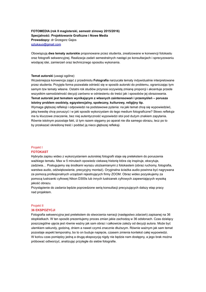 ! FOTOMEDIA (rok II magisterski, semestr zimowy 2015/2016) Specjalność: Projektowanie Graficzne i Nowe Media Prowadzący: dr Grzegorz Gajos [email protected] ! Obowiązują dwa tematy autorskie proponowane przez studenta, zrealizowane w konwencji fotokastu oraz fotografii sekwencyjnej. Realizacja zadań semestralnych nastąpi po konsultacjach i sprecyzowaniu wiodącej idei, zamierzeń oraz technicznego sposobu wykonania. ! ! Temat autorski (uwagi ogólne) Wcześniejsza konwencja zajęć z przedmiotu Fotografia narzucała tematy indywidualnie interpretowane przez studenta. Przyjęta forma pozwalała odnieść się w sposób autorski do problemu, ograniczając tym samym tzw tematy własne. Ostatni rok studiów przynosi oczywistą zmianę proporcji i akcentuje przede wszystkim samodzielność decyzji zarówno w odniesieniu do treści jak i sposobów jej obrazowania. Temat autorski jest tematem wynikającym z własnych zainteresowań i przemyśleń – porusza istotny problem osobisty, egzystencjalny, społeczny, kulturowy, religijny itp. Wymaga głębszej refleksji i odpowiedzi na podstawowe pytania: na jaki temat chcę się wypowiedzieć, jaką kwestię chcę poruszyć i w jaki sposób wykorzystam do tego medium fotograficzne? Słowo refleksja ma tu kluczowe znaczenie, bez niej autentyczność wypowiedzi stoi pod dużym znakiem zapytania. Równie istotnym pozostaje fakt, iż tym razem sięgamy po aparat nie dla samego obrazu, lecz po to by przekazać określoną treść i poddać ją nieco głębszej refleksji. ! ! ! Projekt I FOTOKAST Hybryda zapisu wideo z wykorzystaniem autorskiej fotografii staje się pretekstem do poruszenia ważkiego tematu. Max w 5 minutach opowiedz ciekawą historię która cię inspiruje, ekscytuje, zadziwia… Posługujemy się środkami wyrazu utożsamianymi z fotokastem (obraz ruchomy, fotografia, warstwa audio, odźwiękowienie, precyzyjny montaż). Oryginalna ścieżka audio powinna być nagrywana za pomocą profesjonalnych urządzeń rejestrujących firmy ZOOM. Obraz wideo pozyskujemy za pomocą lustrzanki cyfrowej Nikon D300s lub innych lustrzanek cyfrowych zapewniających wysoką jakość obrazu. Przystąpienie do zadania będzie poprzedzone serią konsultacji precyzujących dalszy etap pracy nad projektem. ! Projekt II 36 EKSPOZYCJI Fotografia sekwencyjna jest pretekstem do stworzenia narracji (następstwo zdarzeń) zapisanej na 36 stopklatkach. W ten sposób prezentujemy proces zmian jakie zachodzą w 36 odsłonach. Czas dzielący poszczególne ujęcia jest równie ważny jak sam obraz i całkowicie zależy od decyzji autora. Może być ułamkiem sekundy, godziną, dniem a nawet czymś znacznie dłuższym. Równie ważnym jak sam temat pozostaje aspekt temporalny, bo to on buduje napięcie, czasem zmienia kontekst całej wypowiedzi. W końcu czas pomiędzy jedną a drugą ekspozycją nigdy nie będzie nam dostępny, a jego brak można próbować odtworzyć, analizując przyległe do siebie fotografie. Realizacja zadań semestralnych będzie poprzedzona konsultacjami i wnikliwą analizą proponowanej koncepcji. Podejmowany temat powinien mieć silne podparcie ideologiczne i klarowny przekaz. Zatem punktem wyjścia do autorskiego projektu musi być gruntownie przemyślana idea, a efektem finalnym – porawny pod względem technologicznym i estetycznym produkt. Realizacji będzie towarzyszył opis (max strona A4) jako merytoryczne uzupełnienie pracy. ! ! Warunki zaliczenia Realizacja tematów semestralnych, rozsądna frekwencja, obecność na wykładach i indywidualnych korektach, aktywność na zajęciach i otwartej krytyce. Projekt I: Kompletny pod względem treści i montażu fotokast zapisany jako: MPEG-4 movie Projekt II: Wersja cyfrowa sekwencji fotograficznej + druk (forma będzie ustalana indywidualnie) ! ! ! ! Literatura: W. Dederko, Światło i cień w fotografii M. Busselle, Fotografia czarno-biala M. Freeman, Fotografia studyjna J. Beardsworth, Czarno-biała fotografia cyfrowa M. Freeman, Światło i oświetlenie w fotografii cyfrowej A. Rouille, Fotografia. Między dokumentem a sztuką współczesną G. Dziamski, Sztuka u progu XXI wieku A. M. Potocka, To tylko sztuka A. Żmijewski, Drżące ciała. Rozmowy z artystami A. Sobota, Konceptualność fotografii S. Sikora, Fotografia. Między dokumentem a symbolem F. Soulages, Estetyka fotografii. Strata i zysk A. Mazur, Kocham fotogrfię A. Mazur, Decydujący moment. Nowe zjawiska w fotografii polskiej po 2000 roku. J. Berger, Sposoby widzenia N. Rosenblum, Historia Fotografii Światowej V. Fluser, Ku filozofii fotografii C. Cotton, Fotografia jako sztuka współczesna Czasopisma specjalistyczne i branżowe, strony internetowe poświęcone fotografii.
