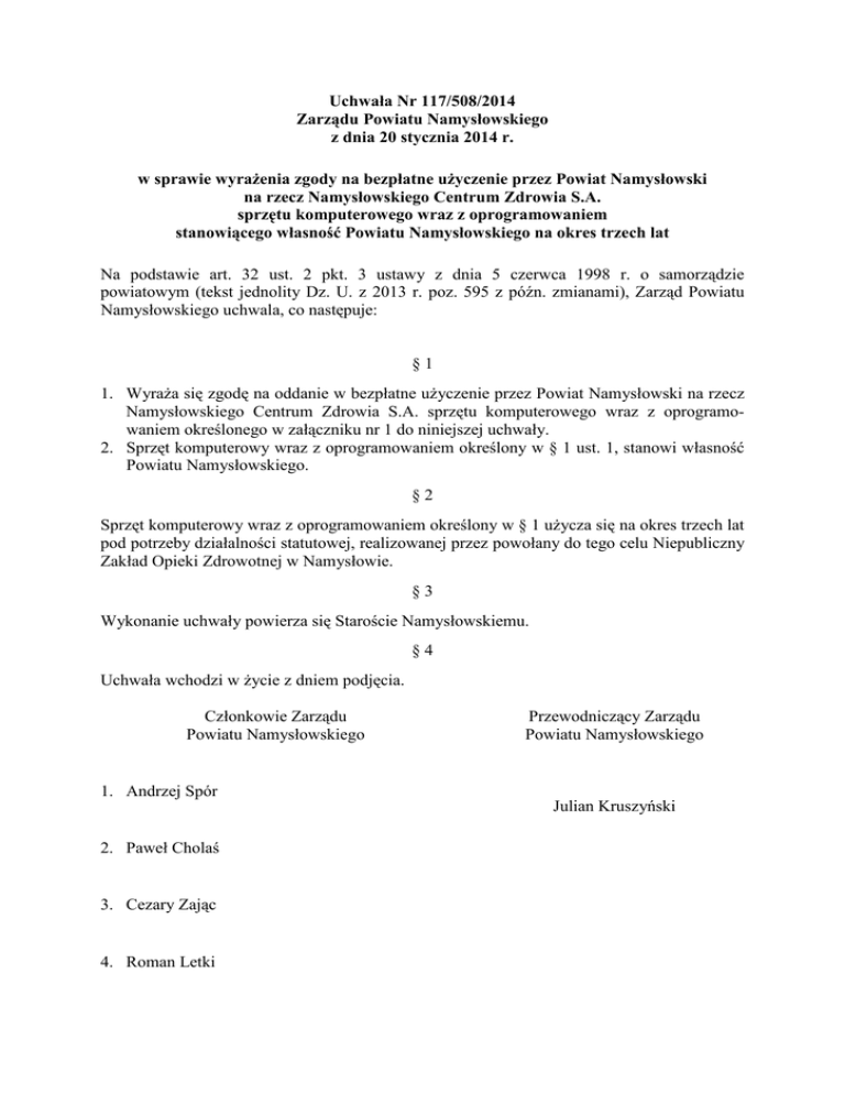 uchwała Nr 117-508-2014 w spr wyrażenia zgody na użyczenie