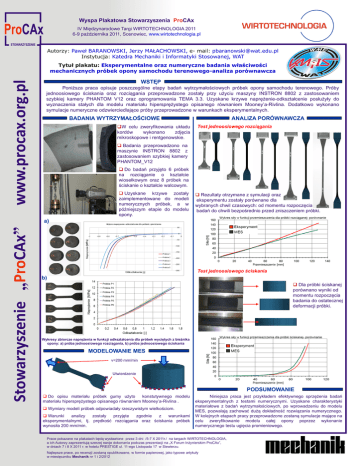 Wyspa Plakatowa Stowarzyszenia ProCAx IV Międzynarodowe Targi WIRTOTECHNOLOGIA 2011 6-9 października 2011, Sosnowiec, www.wirtotechnologia.pl Autorzy: Paweł BARANOWSKI, Jerzy MAŁACHOWSKI, e- mail: [email protected] Instytucja: Katedra Mechaniki i Informatyki Stosowanej, WAT www.procax.org.pl Tytuł plakatu: Eksperymentalne oraz numeryczne badania właściwości mechanicznych próbek opony samochodu terenowego-analiza porównawcza WSTĘP Poniższa praca opisuje poszczególne etapy badań wytrzymałościowych próbek opony samochodu terenowego. Próby jednoosiowego ściskania oraz rozciągania przeprowadzone zostały przy użyciu maszyny INSTRON 8802 z zastosowaniem szybkiej kamery PHANTOM V12 oraz oprogramowania TEMA 3.3. Uzyskane krzywe naprężenie-odkształcenie posłużyły do wyznaczenia stałych dla modelu materiału hipersprężystego opisanego równaniem Mooney’a-Rivlina. Dodatkowo wykonano symulacje numeryczne odzwierciedlające próby przeprowadzone w warunkach eksperymentalnych. BADANIA WYTRZYMAŁOŚCIOWE W celu zweryfikowania układu kordów wykonano zdjęcia mikroskopowe i rentgenowskie. ANALIZA PORÓWNAWCZA Test jednoosiowego rozciągania Badania przeprowadzono na maszynie INSTRON 8802 z zastosowaniem szybkiej kamery PHANTOM_V12 Do badań przyjęto 6 próbek na rozciąganie o kształcie wiosełkowym oraz 8 próbek na ściskanie o kształcie walcowym. Uzyskane krzywe zostały zaimplementowane do modeli numerycznych próbek, a w późniejszym etapie do modelu opony. Rezultaty otrzymane z symulacji oraz eksperymentu zostały porównane dla wybranych chwil czasowych: od momentu rozpoczęcia badań do chwili bezpośrednio przed zniszczeniem próbki. Stowarzyszenie „ProCAx” a) Test jednoosiowego ściskania b) a) Dla próbki ściskanej porównano wyniki od momentu rozpoczęcia badania do ostatecznej deformacji próbki. Wykresy zbiorcze naprężenia w funkcji odkształcenia dla próbek wyciętych z bieżnika opony: a) próba jednoosiowego rozciągania, b) próba jednoosiowego ściskania b) MODELOWANIE MES v=200 mm/min Utwierdzenie PODSUMOWANIE Do opisu materiału próbek gumy użyto konstutywnego modelu materiału hipersprężystego opisanego równaniem Mooney’a-Rivlina . Wymiary modeli próbek odpowiadały rzeczywistym wielkościom. Warunki analizy zostały przyjęte zgodnie z warunkami eksperymentalnymi, tj. prędkość rozciągania oraz ściskania próbek wynosiła 200 mm/min. Niniejsza praca jest przykładem efektywnego sprzężenia badań eksperymentalnych z testami numerycznymi. Uzyskane charakterystyki materiałowe z badań wytrzymałościowych, po wprowadzeniu do modelu MES, pozwalają zachować dużą dokładność rozwiązania numerycznego. W kolejnych etapach pracy przeprowadzone zostaną symulacje mające na celu zweryfikowanie modelu całej opony poprzez wykonanie numerycznego testu ugięcia promieniowego. Prace pokazane na plakatach będą wystawione przez 3 dni /5-7 X 2011r./ na targach WIRTOTECHNOLOGIA, a ich Autorzy zaprezentują szerzej swoje dokonania podczas prezentacji na „X Forum Inżynierskim ProCAx”, w dniach 7 i 8 X 2011 r. w hotelu PRESTIGE ul. 11-ego Listopada 17 w Siewierzu. Najlepsze prace, po recenzji zostaną opublikowane, w formie papierowej, jako typowe artykuły w miesięczniku Mechanik nr 1 i 2/2012