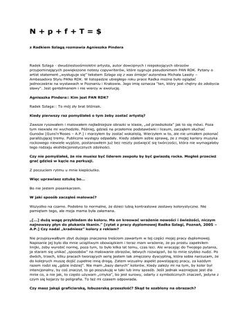 N+p+f+T=$ z Radkiem Szlagą rozmawia Agnieszka Pindera Radek Szlaga - dwudziestoośmioletni artysta, autor dowcipnych i niepokojących obrazów przypominających powiększone notesy copywriterów, które sygnuje pseudonimem PAN RDK. Pytany o artist statement „wysługuje się” tekstem Szlaga się z was śmieje! autorstwa Michała Lasoty – Ambasadora Stylu PANa RDK. W listopadzie ubiegłego roku prace Radka można było oglądać jednocześnie na wystawach w Poznaniu i Krakowie. Jego imię oznacza "ten, który jest chętny do zdobycia sławy". Jest gentelmanem i nie wierzy w ewolucję. Agnieszka Pindera:: Kim jest PAN RDK? Radek Szlaga:: To mój zły brat bliźniak. Kiedy pierwszy raz pomyślałeś o tym żeby zostać artystą? Zawsze rysowałem i malowałem najładniejsze obrazki w klasie, „od przedszkola” jak to się mówi. Poza tym niewiele mi wychodziło. Później, gdzieś na przełomie podstawówki i liceum, zacząłem słuchać Gunsów [Guns’n’Roses – A.P.] i marzyłem by zostać wokalistą. Wierzyłem w to, ale nie umiałem pokonać paraliżującej tremy. Publiczne występy odpadały. Kiedy zdałem sobie sprawę, że z mojej kariery muzyka rockowego niewiele wyjdzie, postanowiłem już bez reszty poświęcić się twórczości, która nie wymagałaby tego rodzaju ekshibicjonistycznych zdolności. Czy nie pomyślałeś, że nie musisz być liderem zespołu by być gwiazdą rocka. Mogłeś przecież grać gdzieś w kącie na perkusji. Z poczuciem rytmu u mnie kiepściutko. Więc uprawiasz sztukę bo… Bo nie jestem piosenkarzem. W jaki sposób zacząłeś malować? Wszystko na czarno. Podobno to normalne, że dzieci lubią kontrastowe zestawy kolorystyczne. Nie pamiętam tego, ale moja mama była załamana. „[...] dużą wagę przykładam do koloru. Ma on kreować wrażenie nowości i świeżości, niczym najnowszy płyn do płukania tkanin.” [cytat z pracy dyplomowej Radka Szlagi, Poznań, 2005 – A.P.] Czy nadal „kradniesz” kolory z reklam? Nie przypisywałbym zbyt dużego znaczenia treściom zawartym w tej części mojej pracy dyplomowej. Napisanie jej było dla mnie uciążliwym obowiązkiem i teraz mam wrażenie, że po prostu zapełniłem linijki, żeby wyrobić normę, poza tym, to było kilka lat temu, czas leci. Ale wracając do Twojego pytania, ja staram się unikać „sposobów" na malowanie obrazów, łatwych rozwiązań, bo to mnie szybko nudzi. Po dwóch, trzech, kilku pracach tworzących serię jestem tak zmęczony dyscypliną, która sobie narzucam, że do kolejnych muszę dojść zupełnie inną drogą. Zatem wizualny aspekt powstającej pracy, za każdym razem rodzi się „gdzie indziej". Nie mam „bazy danych” kolorów. Kiedy zależy mi na tym, by kolor był intencjonalny, by coś znaczył, to go poszukuję w taki lub inny sposób. Jeśli jednak ważniejsze jest dla mnie co, a nie jak, to często używam „cmyka”, bo jest surowy, odarty z symbolicznych znaczeń, jedyne z czym się kojarzy to poligrafia. To też mi czasem odpowiada. Czy masz jakąś graficiarską, łobuzerską przeszłość? Skąd te szablony na obrazach? Dżentelmeni nie rozmawiają na te tematy! Biorąc udział w wystawie WE CAME FROM BEYOND [„Większość współtwórców WCFB ma za sobą duże doświadczenie w działaniach w obrębie przestrzeni publicznej” cyt. za Honzą Zamojskim, kuratorem WCFB, wystawy, która gościła w przestrzeniach poznańskiego stowarzyszenia STARTER jesienią ubiegłego roku – A.P.] pozwalasz przypuszczać, że ta przeszłość jest. Dlaczego więc nie chcesz się przyznać? Jestem dziadkiem borowym, dawno się tym nie zajmuję. Dlaczego więc posługujesz się estetyką street art’ową ? Nie wiem, czy estetyka street art’u w ogóle istnieje, tak samo jak nie istnieje estetyka współczesnego malarstwa. Nie spędza mi snu z powiek refleksja nad stylistyką, w jakiej tworzę kolejny obraz. To się dzieje „na żywo”. Podczas malowania ginie około 80 procent pierwotnej koncepcji obrazu, a powstaje nowa i tyle. Przeważnie jestem bardzo rozbity. Neuroza czy coś… Te obrazy są w gruncie rzeczy o mnie, są zapisem „stanu ducha” i świadomości. Kiedy maluje Murzynów (bo chyba o tych mówimy), to nie głoszę rasistowskich tez, choć tak to może ktoś odebrać. Chodzi mi o bezzasadność politycznej poprawności i szeregu innych skodyfikowanych reguł, które dla mnie nie mają większego sensu i które w tych obrazach piętnuję w mniej lub bardziej wyrafinowany sposób. Ta stylistyka, zbliżona momentami do prymitywnego grafitti wydaje mi się najbardziej adekwatna do poruszanego tematu. Nie ma ona dużo wspólnego ze street art’em. Jeżeli tak, to bardzo niewiele. Opowiedz o swojej przygodzie z performance. Płytki Group. To był początek moich studiów na ASP w Poznaniu. Z Tomkiem Mrozem, "Leonem" Partyką i Cebolem [Tomaszem Cebo – A.P.] trafiliśmy do pracowni prof. Izy Gustowskiej. I tam się działy jakieś dziwne rzeczy: multimedia, instalacje, itd. Dla mnie to były ciosy, nie wiedziałem o co chodzi. Zaczęliśmy robić performence’y wykorzystując najczęściej stosowane, w naszym mniemaniu, figury tego medium, czyli na golasa, ból i płomienie. Na Festiwalu Kont Performance w Lublinie, nie pamiętam już w którym roku, prezentowaliśmy Houston Project. Próbowaliśmy odlecieć rakietą własnej konstrukcji z dachu Chatki Żaka – to taka świetlica czy akademik. Rakieta spłonęła, część poszycia dachu też. Było dużo dymu, hałasu, gaśnice. Uciekliśmy na golasa. Nikomu, poza małymi oparzeniami, nic się nie stało. To były performance’y wynikające z przekonania o anachronizmie tej formy wypowiedzi artystycznej. Przynajmniej w moim wypadku. Takie szyderstwo z etosu artysty w kapeluszu i z apaszką, ze znawców sztuki, ale głównie z samych siebie. Poza tym świetnie się bawiliśmy tym całym bezsensem. Dlaczego romans z performance się skończył? To było przedsięwzięcie bardz
