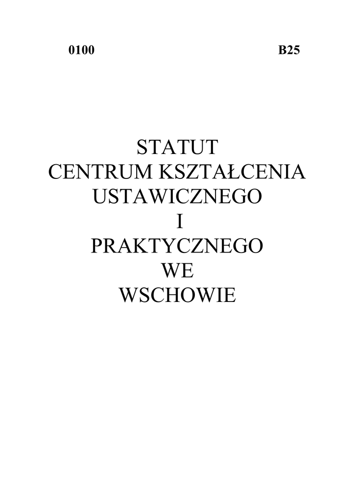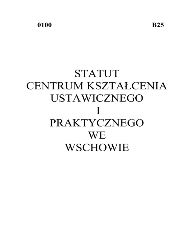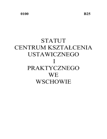 0100 B25 STATUT CENTRUM KSZTAŁCENIA USTAWICZNEGO I PRAKTYCZNEGO WE WSCHOWIE I. POSTANOWIENIA OGÓLNE 1. Centrum Kształcenia Ustawicznego i Praktycznego we Wschowie zwane dalej „ Centrum” jest placówką, której celem jest kształcenie, dokształcanie i doskonalenie zawodowe osób dorosłych, młodzieży oraz upowszechnianie kształcenia ustawicznego. 2. System kształcenia ustawicznego obejmuje kształcenie, dokształcanie i doskonalenie w formach szkolnych i pozaszkolnych. 3. Kształcenie, dokształcanie i doskonalenie może odbywać się w systemie dziennym, wieczorowym, zaocznym, kształcenia na odległość, eksternistycznym lub systemie łączącym te formy. 4. Centrum działa na podstawie przepisów w sprawie centrów kształcenia ustawicznego oraz niniejszego statutu. 5. Centrum jest jednostką budżetową finansowaną z budżetu powiatu. 6. Centrum powołane zostało na mocy uchwały – aktu założycielskiego Rady Powiatu. 7. Siedziba Centrum mieści się we Wschowie Plac Kosynierów 1. 8. Organem prowadzącym powiat wschowski. 9. Organem nadzorującym Centrum jest Lubuski Kurator Oświaty. II. ZADANIA CENTRUM Do zadań Centrum należy w szczególności: 1. Kształcenie, dokształcanie i doskonalenie zawodowe dorosłych i młodzieży w formach szkolnych i pozaszkolnych. 2. Realizowanie zadań związanych z przyznawaniem tytułów kwalifikacyjnych zgodnie z odrębnymi przepisami. 3. Organizowanie egzaminów eksternistycznych z zakresu programów nauczania szkół i kursów. 4. Opracowanie i wydawanie skryptów, poradników oraz materiałów metodycznych na potrzeby słuchaczy. 5. Doskonalenie metod pracy dydaktyczno-wychowawczej w zakresie kształcenia dorosłych. 6. Udzielanie organizatorom oświaty dorosłych pomocy organizacyjnej, metodycznej i dydaktycznej. 7. Współpraca z organizatorami oświaty dorosłych w kraju i za granicą. 8. Współpraca z urzędami pracy i zakładami pracy w zakresie rekwalifikacji kadr. 9. Realizowanie innych zadań zleconych przez MENiS, KO, Powiat i podjętych przez Radę Pedagogiczną. 10.Organizowanie zajęć praktycznych i praktyk zawodowych dla uczniów i słuchaczy szkół zawodowych, średnich i policealnych. 11.Prowadzenie dokształcania zawodowego uczniów szkół zawodowych III ORGANIZACJA CENTRUM 1. Struktura organizacyjna CKUiP 2. Centrum kształci młodzież i dorosłych w szkołach dziennych, wieczorowych i zaocznych. 3. W skład Centrum wchodzą: a. Wydział Kształcenia Ustawicznego, który składa się z: Szkoły dla dorosłych: Trzyletnie liceum ogólnokształcące. Trzyletnie liceum profilowane. Czteroletnie technikum. Zasadnicza szkoła zawodowa o okresie nauczania nie krótszym niż 2 lata i nie dłuższym niż 3 lata. dwuletnie uzupełniające liceum ogólnokształcące. trzyletnie technikum uzupełniające. szkoły policealne Kursów dokształcających doskonalących kwalifikacyjnych Państwowej Komisji Egzaminacyjnej do przeprowadzania egzaminów eksternistycznych b. Wydział Kształcenia Praktycznego który składa się z: Działu praktycznego zajęcia praktyczne praktyki zawodowe modułowe kształcenie zawodowe Państwowej komisji egzaminacyjnej na tytuły kwalifikacyjne c. Ośrodek Dokształcania i Doskonalenia Zawodowego, który zajmuje się kształceniem młodocianych pracowników z teoretycznych przedmiotów zawodowych d. Internat który zapewnia opiekę dla : Młodzieży ODiDZ Słuchaczy szkół dla dorosłych 4. W Centrum mogą być organizowane inne typy szkól za zgodą organu prowadzącego. 5. Czas trwania nauki zależy od typu szkoły i podbudowy, na której jest zorganizowana. 6. Centrum może prowadzić szkoły w formie stacjonarnej i zaocznej. 7. W szkole stacjonarnej mogą być prowadzone klasy zaoczne, a w szkołach zaocznych klasy stacjonarne. 8. Centrum może być tworzyć filie lub samodzielne wydzielone jednostki (szkoły). 9. Filia Centrum może być utworzona przez organ prowadzący na wniosek dyrektora. 10.Pracą filii kieruje kierownik filii, którego powołuje dyrektor Centrum. 11.Kierownik filii podlega bezpośrednio dyrektorowi Centrum, który ustala zakres jego obowiązków. 12.Centrum prowadzi internat dla uczniów i słuchaczy. Zasady jego działania określa Regulamin internatu stanowiący załącznik nr. 1 III. ORGANIZACJA KSZTAŁCENIA W CENTRUM 1. Rok szkolny dzieli się na dwa semestry: jesienny i wiosenny. 2. Terminy rozpoczynania i kończenia zajęć dydaktycznych, przerw świątecznych oraz ferii zimowych i letnich określają przepisy w sprawie organizacji roku szkolnego. 3. Szczegółową organizację nauczania w danym roku szkolnym określa arkusz organizacyjny Centrum opracowany przez dyrektora i zatwierdzony przez organ prowadzący szkołę, który zawiera: a. Liczbę zatrudnionych pracowników b. Liczbę godzin z poszczególnych przedmiotów i zajęć obowiązkowych c. Liczbę zajęć pozalekcyjnych finansowanych ze środków budżetowych d. Przeliczenie ilości godzin na kursach na pełne etaty 4. Podstawową jednostką organizacyjną w Centrum jest oddział semestralny składający się z wszystkich słuchaczy uczących się w danym semestrze. 5. W nauczaniu niektórych przedmiotów oddziały semestralne mogą być dzielone na grupy. Zasady podziału na grupy regulują odrębne przepisy. 6. Centrum kieruje samodzielną nauką słuchaczy, ułatwiając im osiąganie jak najlepszych wyników poprzez: a. zapoznanie słuchaczy z programem nauczania b. udzielanie pomocy w zaopatrzeniu słuchaczy w podręczniki, poradniki, komentarze metodyczne i inne materiały dostosowane do różnych form kształcenia dorosłych c. udzielanie porad w sprawie nauki bezpośrednio oraz w wyjątkowych, uzasadnionych przypadkach w drodze korespondencji d. organizowanie konferencji instruktażowych, konsultacji zbiorowych i indywidualnych e. ocenianie i recenzowanie prac kontrolnych. f. wydawanie informatora dla eksternów g. przygotowywanie materiałów i podręczników dla uczniów kształconyc