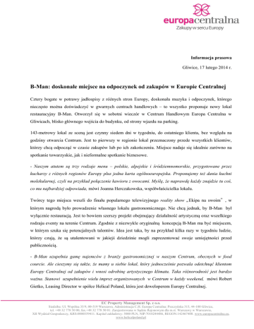 Informacja prasowa Gliwice, 17 lutego 2014 r. B-Man: doskonałe miejsce na odpoczynek od zakupów w Europie Centralnej Cztery bogate w potrawy jadłospisy z różnych stron Europy, doskonała muzyka i odpoczynek, którego nieczęsto można doświadczyć w gwarnych centrach handlowych – to wszystko proponuje nowy lokal restauracyjny B-Man. Otworzył się w sobotni wieczór w Centrum Handlowym Europa Centralna w Gliwicach, blisko głównego wejścia do budynku, od strony wjazdu na parking. 143-metrowy lokal ze sceną jest czynny siedem dni w tygodniu, do ostatniego klienta, bez względu na godziny otwarcia Centrum. Jest to pierwszy w regionie lokal przeznaczony przede wszystkich klientów, którzy chcą odpocząć w czasie zakupów lub po ich zakończeniu. Miejsce nadaje się idealnie zarówno na spotkanie towarzyskie, jak i nieformalne spotkanie biznesowe. - Naszym atutem są trzy rodzaje menu – polskie, alpejskie i śródziemnomorskie, przygotowane przez kucharzy z różnych regionów Europy plus jedna karta ogólnoeuropejska. Proponujemy też dania kuchni molekularnej, czyli na przykład połączenie kawioru z owocami. Myślę, że naprawdę każdy znajdzie tu coś, co mu najbardziej odpowiada, mówi Joanna Herczakowska, współwłaścicielka lokalu. Twórcy tego miejsca weszli do finału popularnego telewizyjnego reality show „Ekipa na swoim”, w którym nagrodą było prowadzenie własnego lokalu gastronomicznego. Nie chcą jednak, by B-Man był wyłącznie restauracją. Jest to bowiem szerszy projekt obejmujący działalność artystyczną oraz wszelkiego rodzaju eventy na terenie Centrum. Zgodnie z niezwykle oryginalną koncepcją B-Man ma być miejscem, w którym szuka się potencjalnych talentów. Idea jest taka, by na przykład kilka razy w tygodniu ludzie, którzy czują, że są utalentowani w jakiejś dziedzinie mogli zaprezentować swoje umiejętności przed publicznością. - B-Man uzupełnia gamę najemców z branży gastronomicznej w naszym Centrum, obecnych w food courcie. Ale cieszymy się także, że mamy u siebie lokal, który jednocześnie pozwala odetchnąć klientom Europy Centralnej od zakupów i wnosi odrobinę artystycznego klimatu. Taka różnorodność jest bardzo ważna. Stanowi uzupełnienie wielu imprez organizowanych w Centrum w każdy weekend, mówi Robert Gietko, Leasing Director w spółce Helical Poland, która jest deweloperem Europy Centralnej. EC Property Management Sp. z o.o. Siedziba: Ul. Wspólna 35/9, 00-519 Warszawa. Administracja C.H. Europa Centralna: Pszczyńska 315, 44-100 Gliwice, tel. +48 32 778 50 00, fax.+48 32 778 50 01. Zarejestrowana w Sądzie Rejonowym dla m.st. Warszawy w Warszawie, XII Wydział Gospodarczy, KRS:0000359411. Kapitał zakładowy: 5000 PLN, NIP:7010244486, REGON:142467400. www.europacentralna.eu, www.helicalpoland.pl Centrum Handlowe Europa Centralna o powierzchni 67 tys. metrów kwadratowych jest jednym z największych tego typu obiektów komercyjnych w Polsce. Unikalny koncept galerii, oferuje klientom możliwość zrobienia wszystkich niezbędnych zakupów od artykułów spożywczych, przez materiały do budowy domu, po ubrania z najnowszych kolekcji. Położenie obiektu, przy jednym z największych węzłów autostradowych w Polsce (Gliwice-Sośnica), gdzie łączą się autostrady A1 i A4 i droga krajowa nr 44 oraz na obszarze gęsto zaludnionego Górnośląskiego Okręgu Przemysłowego, sprawia, że niemal 5 mln osób może w ciągu godziny dojechać tu na zakupy. Na miejscu skorzystać można z wypożyczalni parasoli, pomieszczeń dla rodziców z dziećmi, 600 miejsc siedzących dla klientów piętra restauracyjnego, paczkomatu, bezpłatnego wi-fi dostępnego na terenie całego Centrum oraz wielu bankomatów i punktów usługowych. Klienci mogą zostawić swój samochód na dużym, liczącym 2,3 tys. miejsc parkingu, a niezmotoryzowani dojadą na zakupy bezpłatnymi liniami autobusowymi. Wśród najemców są takie firmy jak: Saturn, Castorama, Tesco Extra, Jula, Ski Team, Sports Direct, Jysk, SMYK Megastore, RTV Euro AGD, New Yorker, Reserved, H&M, Cubus, Lindex, CCC, Bershka, Solar, Monnari, Clooud, Apart, TUI, Home and You, Super Pharm, Neckermann, Deichmann, City Sport, Mohito, Promod, Cortland Apple Premium Reseller, Stradivarius, Rossmann, TAKKO Fashion, Douglas, Alpenpark, ING Bank Śląski, Lilo, Henry Moore, Motherline, Bialcon, Dobrodzień i Kalwaria, AMT Studio, New York Hot Dogs, Esotiq, Nuna Lie, Restauracja Chińska, Miviena, Bel-Pol, Kakadu, CARRY, a dla najmłodszych Kinderplaneta. Aktualnie trwają prace aranżacyjne w dziesięciu sklepach, które otworzą się w pierwszej połowie 2014 r. Kontakt dla dziennikarzy: www.europacentralna.eu Helical Poland Sp. z o.o. ul. Wspólna 35/9 00-519 Warszawa Więcej informacji: Marta Chodkowska Tel. 601 244 127 [email protected] Marketing Director C. H .Europa Centralna Katarzyna Skalska Tel. 501 699 261 [email protected] Leasing:: Robert Gietko Tel. 605 451 060 [email protected] Marta Gołębiowska Tel. 663 918 160 [email protected] Cook Communications Tomasz Rożek Tel. 663 171 033 [email protected] Mind Progress Group Adam Piwek Tel. 515 108 476 [email protected] EC Property Management Sp. z o.o. Siedziba: Ul. Wspólna 35/9, 00-519 Warszawa. Administracja C.H. Europa Centralna: Pszczyńska 315, 44-100 Gliwice, tel. +48 32 778 50 00, fax.+48 32 778 50 01. Zarejestrowana w Sądzie Rejonowym dla m.st. Warszawy w Warszawie, XII Wydział Gospodarczy, KRS:0000359411. Kapitał zakładowy: 5000 PLN, NIP:7010244486, REGON:142467400. www.europacentralna.eu, www.helicalpoland.pl