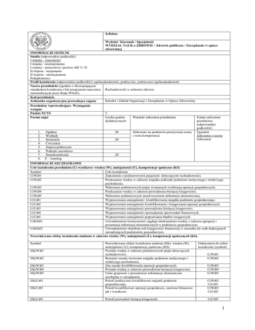 Syllabus Wydział / Kierunek / Specjalność WYDZIAŁ NAUK o ZDROWIU / Zdrowie publiczne / Zarządzanie w opiece zdrowotnej INFORMACJE OGÓLNE Studia (odpowiednie podkreślić) I stopnia - stacjonarne I stopnia - niestacjonarne I stopnia - pomostowe: poziom AB/ C/ D II stopnia - stacjonarne II stopnia - niestacjonarne Podyplomowe Profil kształcenia (odpowiednie podkreślić): ogólnoakademicki, praktyczny, praktyczno-ogólnoakademicki Nazwa przedmiotu (zgodnie z obowiązującym standardem kształcenia i/lub programem nauczania Rachunkowość w ochronie zdrowia zatwierdzonym przez Radę WNoZ). Kod przedmiotu Katedra i Zakład Organizacji i Zarządzania w Opiece Zdrowotnej Jednostka organizacyjna prowadząca zajęcia Przedmioty wprowadzające. Wymagania wstępne Punkty ECTS Forma zajęć 1. 2. 3. 4. 5. 6. 7. 8. Ogółem Wykłady Seminaria Ćwiczenia Zajęcia praktyczne Praktyki zawodowe Samokształcenie E – learning 2 Liczba godzin dydaktycznych 50 Warunki zaliczenia przedmiotu Zaliczenie na podstawie pozytywnej oceny z testu kompetencji. 30 Forma zaliczenia przedmiotu (odpowiednie podkreślić) Egzamin Zaliczenie z oceną Zaliczenie 20 INFORMACJE SZCZEGÓŁOWE Cele kształcenia przedmiotu (C) wynikowe: wiedza (W), umiejętności (U), kompetencje społeczne (KS) Symbol Cele kształcenia C(W)01 Zapoznanie z podstawowymi pojęciami dotyczącymi rachunkowości. C(W)02 Przekazanie wiedzy w zakresie majątku jednostki podmiotu medycznego i źródeł jego pochodzenia. C(W)03 Wdrożenie podstawowych pojęć związanych ewidencją operacji gospodarczych. C(W)04 Przekazanie wiedzy w zakresie prowadzenia bieżącej księgowości. C(W)05 Wdrożenie podstawowych zasad tworzenia informacji ekonomicznej. C(U)01 Wypracowanie umiejętności kwalifikowania majątku podmiotu gospodarczego. C(U)02 Wypracowanie umiejętności kwalifikowania i księgowania operacji gospodarczych. C(U)03 Wypracowanie umiejętności prowadzenia bieżącej księgowości. C(U)04 Wypracowanie umiejętności sporządzania sprawozdań finansowych. C(U)05 Wypracowanie umiejętności poprawiania błędów księgowych. C(KS)01 Uświadomienie konieczności ciągłego doskonalenia wiedzy z zakresu agregacji i prezentacji informacji ekonomicznych w podmiocie gospodarczym. C(KS)02 Uświadomienie służebnej roli księgowości finansowej w stosunku do osób funkcyjnych zarządzających podmiotem gospodarczym. Przewidywane efekty kształcenia studenta w zakresie wiedzy (W), umiejętności (U), kompetencji społecznych (KS). Symbol EK(W)01 EK(W)02 EK(W)03 EK(W)04 EK(W)05 EK(U)01 EK(U)02 EK(U)03 Przewidywane efekty kształcenia studenta (EK): wiedza (W), umiejętności (U), kompetencje społeczne (KS). Posiada wiedzę w zakresie podstawowych pojęć dotyczących rachunkowości. Rozumie zasady tworzenia majątku podmiotu medycznego i źródeł jego pochodzenia. Zna zasady kwalifikowania operacji gospodarczych. Posiada wiedzę w zakresie prowadzenia bieżącej księgowości. Umie grupować i prezentować informacje ekonomiczne niezbędne w zarządzaniu. Potrafi praktycznie kwalifikować majątek podmiotu gospodarczego. Potrafi kwalifikować operacje gospodarcze, zarówno bilansowe jak i wynikowe. Potrafi prowadzić bieżącą księgowość. Odniesienie do celów kształcenia (symbol) C(W)01 C(W)02 C(W)03 C(W)04 C(W)05 C(W)02 C(U)01 C(W)03 C(U)02 C(U)03 1 Potrafi sporządzać i interpretować sprawozdania finansowe. C(U)04 Potrafi poprawiać błędy księgowe. C(U)05 Rozumie potrzebę ciągłego zgłębiania wiedzy w zakresie C(KS)01 tworzenia informacji ekonomicznej w podmiocie gospodarczym. EK(KS)02 Potrafi efektywnie współpracować w zespole zadaniowym w C(KS)02 zakresie przygotowywania informacji ekonomicznej. Treści programowe (TP): opis przedmiotu wynikający z obowiązującego standardu kształcenia i/lub programu nauczania zatwierdzonego przez Radę WNoZ Symbol Forma realizacji treści kształcenia: np. wykład, seminaria, Odniesienie do ćwiczenia, zajęcia praktyczne, praktyki zawodowe, efektów kształcenia samokształcenie, E- learning (symbol) TP1- Przedmiot i zakres rachunkowości Seminarium (2 godz.) EK(W)01 TP2 – Zasady prowadzenia rachunkowości Seminarium (4 godz.) EK(W)01 EK(U)03 TP3 – Majątek jednostki gospodarczej i źródła Seminarium (2 godz.) EK(W)02 jego pochodzenia EK(U)01 TP4 - Ewidencja środków pieniężnych Seminarium (2 godz.) EK(W)03 EK(W)04 TP5 – Ewidencja rozrachunków Seminarium (2 godz.) EK(W)04 EK(U)03 TP6 – Ewidencja aktywów trwałych Seminarium (2 godz.) EK(W)02 EK(U)01 EK(U)02 EK(U)03 TP7 – Ewidencja aktywów obrotowych Seminarium (2 godz.) EK(W)02 EK(U)01 EK(U)02 EK(U)03 TP8 – Rachunek wyników Seminarium (2 godz.) EK(W)03 EK(U)04 TP9 – Kwalifikowanie zdarzeń i operacji Seminarium (2 godz.) EK(W)03 gospodarczych EK(U)02 TP10 – Ewidencjonowanie operacji Seminarium (2 godz.) EK(W)03 gospodarczych EK(U)02 TP11 – Kwalifikowanie operacji do księgowania Seminarium (2 godz.) EK(U)02 TP12 – Korespondencja kont Seminarium (2 godz.) EK(W)04 EK(U)03 TP13 – Otwieranie, księgowanie i zamykanie kont Seminarium (2 godz.) EK(W)04 EK(U)03 TP14 – Sporządzanie zestawienia obrotów i sald Seminarium 2 godz.) EK(W)05 EK(U)04 TP15 – Ewidencja majątku, kapitałów i wyniku Samokształcenie (20 godz.) EK(W)03 finansowego EK(W)04 EK(U)05 EK(KS)01 EK(KS)02 Metody dydaktyczne (sposób pracy nauczyciela, Seminaria należy prowadzić z zastosowaniem technik konwersatoryjnych. Praca umożliwiający osiągnięcie celów kształcenia) indywidualna i w małych zespołach. Rzutnik multimedialny, materiały źródłowe, tablica, pisaki. Środki dydaktyczne wykorzystywane w procesie kształcenia Wykaz piśmiennictwa dla studenta T.Kiziukiewicz – Rachunkowość – zasady prowadzenia po przystąpieniu do Unii Piśmiennictwo podstawowe do 4 pozycji Europejskiej. Część 1i 2,Wydawnictwo Ekspert, Wrocław 2008 r. T.Kiziukiewicz – Rachunkowość – zasady prowadzenia według znowelizowanej ustawy o r
