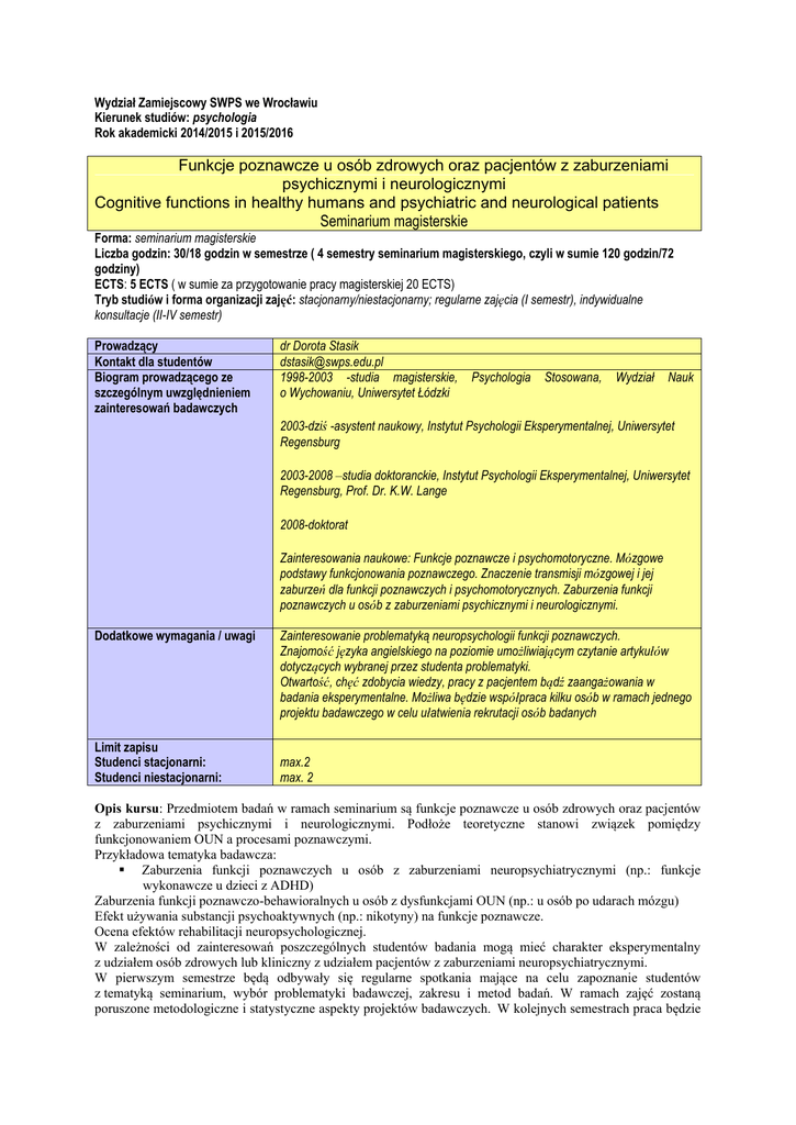 Wydział Zamiejscowy SWPS we Wrocławiu Kierunek studiów: psychologia Rok akademicki 2014/2015 i 2015/2016 Funkcje poznawcze u osób zdrowych oraz pacjentów z zaburzeniami psychicznymi i neurologicznymi Cognitive functions in healthy humans and psychiatric and neurological patients Seminarium magisterskie Forma: seminarium magisterskie Liczba godzin: 30/18 godzin w semestrze ( 4 semestry seminarium magisterskiego, czyli w sumie 120 godzin/72 godziny) ECTS: 5 ECTS ( w sumie za przygotowanie pracy magisterskiej 20 ECTS) Tryb studiów i forma organizacji zajęć: stacjonarny/niestacjonarny; regularne zajęcia (I semestr), indywidualne konsultacje (II-IV semestr) Prowadzący Kontakt dla studentów Biogram prowadzącego ze szczególnym uwzględnieniem zainteresowań badawczych dr Dorota Stasik [email protected] 1998-2003 -studia magisterskie, o Wychowaniu, Uniwersytet Łódzki Psychologia Stosowana, Wydział Nauk 2003-dziś -asystent naukowy, Instytut Psychologii Eksperymentalnej, Uniwersytet Regensburg 2003-2008 –studia doktoranckie, Instytut Psychologii Eksperymentalnej, Uniwersytet Regensburg, Prof. Dr. K.W. Lange 2008-doktorat Zainteresowania naukowe: Funkcje poznawcze i psychomotoryczne. Mózgowe podstawy funkcjonowania poznawczego. Znaczenie transmisji mózgowej i jej zaburzeń dla funkcji poznawczych i psychomotorycznych. Zaburzenia funkcji poznawczych u osób z zaburzeniami psychicznymi i neurologicznymi. Dodatkowe wymagania / uwagi Limit zapisu Studenci stacjonarni: Studenci niestacjonarni: Zainteresowanie problematyką neuropsychologii funkcji poznawczych. Znajomość języka angielskiego na poziomie umożliwiającym czytanie artykułów dotyczących wybranej przez studenta problematyki. Otwartość, chęć zdobycia wiedzy, pracy z pacjentem bądź zaangażowania w badania eksperymentalne. Możliwa będzie współpraca kilku osób w ramach jednego projektu badawczego w celu ułatwienia rekrutacji osób badanych max.2 max. 2 Opis kursu: Przedmiotem badań w ramach seminarium są funkcje poznawcze u osób zdrowych oraz pacjentów z zaburzeniami psychicznymi i neurologicznymi. Podłoże teoretyczne stanowi związek pomiędzy funkcjonowaniem OUN a procesami poznawczymi. Przykładowa tematyka badawcza: Zaburzenia funkcji poznawczych u osób z zaburzeniami neuropsychiatrycznymi (np.: funkcje wykonawcze u dzieci z ADHD) Zaburzenia funkcji poznawczo-behawioralnych u osób z dysfunkcjami OUN (np.: u osób po udarach mózgu) Efekt używania substancji psychoaktywnych (np.: nikotyny) na funkcje poznawcze. Ocena efektów rehabilitacji neuropsychologicznej. W zależności od zainteresowań poszczególnych studentów badania mogą mieć charakter eksperymentalny z udziałem osób zdrowych lub kliniczny z udziałem pacjentów z zaburzeniami neuropsychiatrycznymi. W pierwszym semestrze będą odbywały się regularne spotkania mające na celu zapoznanie studentów z tematyką seminarium, wybór problematyki badawczej, zakresu i metod badań. W ramach zajęć zostaną poruszone metodologiczne i statystyczne aspekty projektów badawczych. W kolejnych semestrach praca będzie odbywała się w formie zajęć zblokowanych bądź w ramach indywidualnych konsultacji w zależności od potrzeb studentów. Semestr drugi i trzeci poświęcony będzie prowadzeniu badań, opracowaniu ich wyników oraz pisaniu części teoretycznej i empirycznej pracy. W semestrze czwartym odbywać się będzie systematyczna redakcja i korekta pracy. Cel zajęć: Praca nad projektem badawczym, redakcja pracy magisterskiej w oparciu o literaturę oraz badania własne. Forma i warunki zaliczenia: I semestr kończy się zaliczeniem BEZ OCENY (jasno określona tematyka, pytania badawcze oraz cele pracy postawione w oparciu o literaturę, a także zarys projektu badawczego przedstawiony w formie prezentacji). II semestr kończy się zaliczeniem na ocenę (przygotowanie badań, napisanie teoretycznej części pracy) III semestr kończy się zaliczeniem na ocenę (przeprowadzenie badań i opracowanie ich wyników oraz złożenie części empirycznej pracy) IV semestr kończy się zaliczeniem na ocenę (warunkiem uzyskania zaliczenia ostatniego semestru seminarium jest zakończenie pracy) Literatura proponowana: 1. Borkowska, A. (2005). Zaburzenia funkcji poznawczych w chorobach psychicznych. Kraków: Polskie Towarzystwo Psychiatryczne. Jodzio, K. (2008). Neuropsychologia intencjonalnego działania. Warszawa: Scholar Gazzaniga, M., Ivry, R., Mangun, G. (2002). Cognitive neuroscience. New York: W.W. Norton Lezak, M. (2004). Neuropsychological assessment. Oxford: Oxford Univ. Press. Pąchalska, M. (2007). Neuropsychologia kliniczna. Urazy mózgu (tom 1 i 2). Warszawa: PWN. 2. Strauss, E., Sherman, E., Spreen, O. (2006). A compedium of neuropsychological tests. Oxford: Oxford Univ. Press.