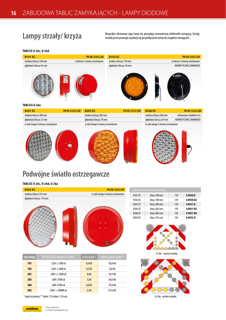 16 ZABUDOWA TABLIC ZAMYKAJĄCYCH - LAMPY DIODOWE Lampy strzały/ krzyża Wszystkie oferowane typy lamp nie posiadają wewnętrznej elektroniki sterującej. Emisję światła przerywanego uzyskuje się po podłączeniu lamp do urządzeń sterujących. TABLICE U-26c, U-26d B101 EC średnica klosza 120 mm głębokość klosza 42 mm PN-EN 12352 L2H w kloszu 3 otwory montażowe B102 EC średnica klosza 139 mm głębokość klosza 18 mm PN-EN 12352 L2H w kloszu 3 otwory montażowe HERMETYCZNIE ZAMKNIĘTA TABLICA U-26a B201 EC średnica klosza 200 mm głębokość klosza 25 mm w tyle lampy 4 otwory montażowe PN-EN 12352 L8H B205 EC średnica klosza 205 mm głębokość klosza 78 mm w tyle lampy 4 otwory montażowe PN-EN 12352 L8H B206 EC PN-EN 12352 L8H średnica klosza 206 mm oferowana z kablem 6 m głębokość klosza 29 mm HERMETYCZNIE ZAMKNIĘTA w tyle lampy 4 otwory montażowe Podwójne światło ostrzegawcze TABLICE U-26c, U-26d, U-26a B303 EC średnica klosza 335 mm głębokość klosza 110 mm PN-EN 12352 L9H w tyle lampy 4 otwory montażowe typ lampy PN-EN 12352/natężenie światła* pobór prądu* dobowy pobór prądu** 101 L2H/ ≥ 500 cd 0,45A 10,8 Ah 102 L2H/ ≥ 600 cd 0,25A 6,0 Ah 201 L8H/ ≥ 2300 cd 0,6A 14,4 Ah 205 L8H/ 2700 cd 1,0A 24,0 Ah 206 L8H/ 2700 cd 0,83A 19,9 Ah 303 L9H/ > 20000 cd 2,4A 57,6 Ah * prąd szczytowy; ** doba: 12 h dzień, 12 h noc www.adro.pl e-mail: [email protected] LAMPA DIODOWA DO ZABUDOWY B101 EC klosz 100 mm 12V A 0930-D B102 EC B201 EC B205 EC B206 EC B303 EC klosz 100 mm klosz 200 mm klosz 205 mm klosz 206 mm klosz 335 mm 12V 12V 12V 12V 12V A 0930-D2 A 0931-D A 0931-D5 A 0931-D6 A 0933-D U-26c - system światła. U-26a - system światła.