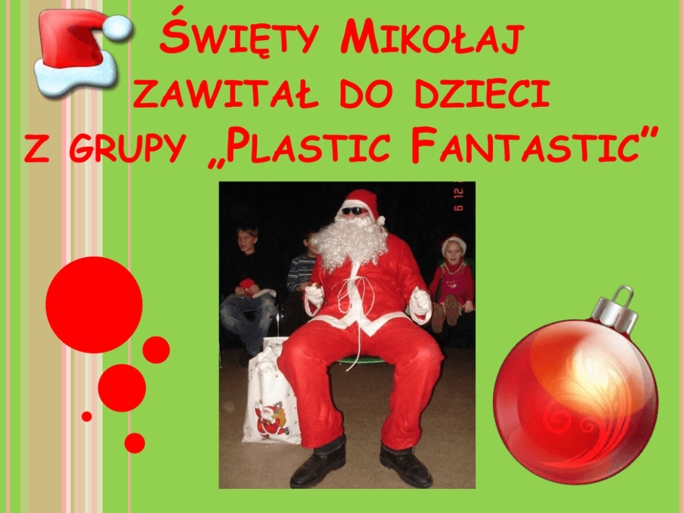 ŚWIĘTY MIKOŁAJ ZAWITAŁ DO DZIECI Z GRUPY „PLASTIC FANTASTIC” WE WTOREK 6 GRUDNIA NA ZAJĘCIACH PLASTYCZNYCH GRUPY „PLASTIC FANTASTIC” POJAWIŁ SIĘ ŚWIĘTY MIKOŁAJ Z WORKIEM PREZENTÓW. PRZYWITAŁ DZIECI ŚWIĄTECZNYMI PIOSENKAMI I ROZDAŁ IM UPOMINKI. BYŁY TO MIKOŁAJKOWE SKARPETY ZE SŁODKOŚCIAMI. NA ZAJĘCIACH DZIECI OZDABIAŁY SWOJE SKARPETY I CZAPKI KOLOROWYMI MATERIAŁAMI, WSTĄŻECZKAMI ORAZ ŚWIECĄCYMI KORALIKAMI I ŁAŃCUCHAMI. WSZYSCY ŚPIEWALI PIOSENKI I CZĘSTOWALI SIĘ SŁODKOŚCIAMI PRZYGOTOWANYMI PRZEZ MAMY Z RADY RODZICÓW: CIASTECZKAMI, PIERNICZKAMI, CUKIERKAMI I SOCZKAMI. TYDZIEŃ PÓŹNIEJ DZIECI ROBIŁY OZDOBY ŚWIĄTECZNE. Z SZYSZEK. TWORZYŁY BOMBKI NAJPIERW MOCZYŁY SZYSZKI W KLEJU, OBTACZAŁY JE W SOLI MORSKIEJ ZMIESZANEJ Z BROKATEM, A NASTĘPNIE ZDOBIŁY WSTĄŻECZKAMI, KOKARDKAMI I KORALIKAMI. PONADTO DZIECI BARDZO CHĘTNIE ROBIŁY TEŻ ŁAŃCUCHY CHOINKOWE Z KOLOROWYCH MAKARONÓW.