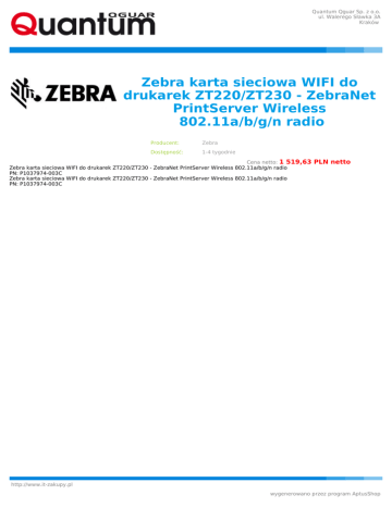 Quantum Qguar Sp. z o.o. ul. Walerego Sławka 3A Kraków Zebra karta sieciowa WIFI do drukarek ZT220/ZT230 - ZebraNet PrintServer Wireless 802.11a/b/g/n radio Producent: Zebra Dostępność: 1-4 tygodnie Cena netto: 1 519,63 Zebra karta sieciowa WIFI do drukarek ZT220/ZT230 - ZebraNet PrintServer Wireless 802.11a/b/g/n radio PN: P1037974-003C Zebra karta sieciowa WIFI do drukarek ZT220/ZT230 - ZebraNet PrintServer Wireless 802.11a/b/g/n radio PN: P1037974-003C PLN netto http://www.it-zakupy.pl wygenerowano przez program AptusShop