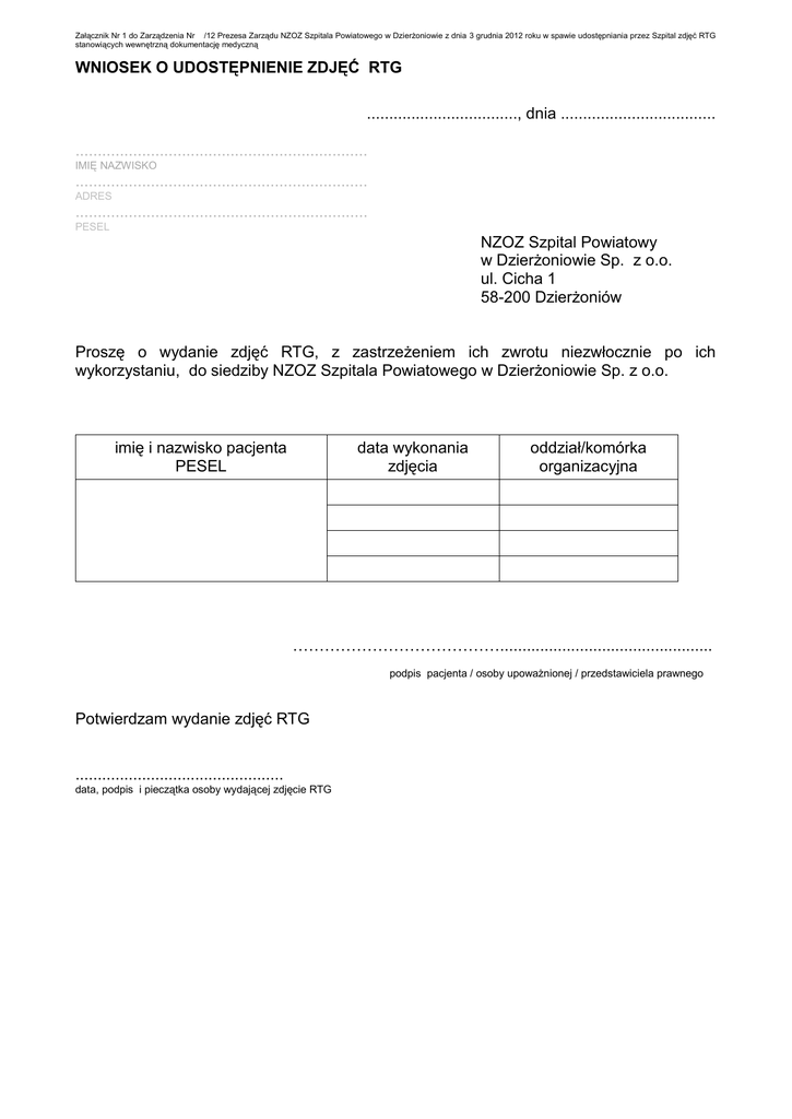 Załącznik Nr 1 do Zarządzenia Nr /12 Prezesa Zarządu NZOZ Szpitala Powiatowego w Dzierżoniowie z dnia 3 grudnia 2012 roku w spawie udostępniania przez Szpital zdjęć RTG stanowiących wewnętrzną dokumentację medyczną WNIOSEK O UDOSTĘPNIENIE ZDJĘĆ RTG .................................., dnia ................................... .................................................................. IMIĘ NAZWISKO .................................................................. ADRES .................................................................. PESEL NZOZ Szpital Powiatowy w Dzierżoniowie Sp. z o.o. ul. Cicha 1 58-200 Dzierżoniów Proszę o wydanie zdjęć RTG, z zastrzeżeniem ich zwrotu niezwłocznie po ich wykorzystaniu, do siedziby NZOZ Szpitala Powiatowego w Dzierżoniowie Sp. z o.o. imię i nazwisko pacjenta PESEL data wykonania zdjęcia oddział/komórka organizacyjna …………………………………................................................ podpis pacjenta / osoby upoważnionej / przedstawiciela prawnego Potwierdzam wydanie zdjęć RTG ............................................... data, podpis i pieczątka osoby wydającej zdjęcie RTG