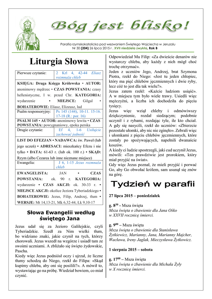 Parafia rzymskokatolicka pod wezwaniem Świętego Wojciecha w Jeruzalu Nr 30 (204) 26 lipca 2015 r . XVII niedziela zwykła, Rok B Liturgia Słowa Pierwsze czytanie: 2 Krl 4, 42-44 rozmnaża chleb Eliasz KSIĘGA: Druga Księga Królewska • AUTOR: anonimowy mędrzec • CZAS POWSTANIA: czasy hellenistyczne, I w. przed Chr. KATEGORIA: wydarzenie • MIEJSCE: Gilgal • BOHATEROWIE: Eliasz, Elizeusz, lud Psalm responsoryjny: Ps 145 (144), 10-11. 15-16. 17-18 (R.: por. 16) PSALM 145 • AUTOR: anonimowy lewita • CZAS POWSTANIA: powygnaniowy, epoka perska Drugie czytanie: Ef 4, 1-6 Usiłujcie zachować jedność LIST DO EFEZJAN • NADAWCA: św. Paweł (lub jego uczeń) • ADRESACI: mieszkańcy Efezu i nie tylko • DATA: 61-63 r. (lub ok. 100 r.) • SKĄD: Rzym (albo Cezarea lub inne nieznane miejsce) Ewangelia: J 6, 1-15 Jezus rozmnaża chleb EWANGELISTA: JAN • CZAS POWSTANIA: ok. 90 r. KATEGORIA: wydarzenie • CZAS AKCJI: ok. 30-33 r. • MIEJSCE AKCJI: okolice Jeziora Tyberiadzkiego • BOHATEROWIE: Jezus, Filip, Andrzej, tłum • WERSJE: Mt 14,13-21, Mk 6,32-44, Łk 9,10-17 Słowa Ewangelii według świętego Jana Jezus udał się za Jezioro Galilejskie, czyli Tyberiadzkie. Szedł za Nim wielki tłum, bo widziano znaki, jakie czynił na tych, którzy chorowali. Jezus wszedł na wzgórze i usiadł tam ze swoimi uczniami. A zbliżało się święto żydowskie, Pascha. Kiedy więc Jezus podniósł oczy i ujrzał, że liczne tłumy schodzą do Niego, rzekł do Filipa: «Skąd kupimy chleba, aby oni się posilili?». A mówił to, wystawiając go na próbę. Wiedział bowiem, co miał czynić. Odpowiedział Mu Filip: «Za dwieście denarów nie wystarczy chleba, aby każdy z nich mógł choć trochę otrzymać». Jeden z uczniów Jego, Andrzej, brat Szymona Piotra, rzekł do Niego: «Jest tu jeden chłopiec, który ma pięć chlebów jęczmiennych i dwie ryby, lecz cóż to jest dla tak wielu?». Jezus zatem rzekł: «Każcie ludziom usiąść». A w miejscu tym było wiele trawy. Usiedli więc mężczyźni, a liczba ich dochodziła do pięciu tysięcy. Jezus więc wziął chleby i odmówiwszy dziękczynienie, rozdał siedzącym; podobnie uczynił i z rybami, rozdając tyle, ile kto chciał. A gdy się nasycili, rzekł do uczniów: «Zbierzcie pozostałe ułomki, aby nic nie zginęło». Zebrali więc i ułomkami z pięciu chlebów jęczmiennych, które zostały po spożywających, napełnili dwanaście koszów. A kiedy ci ludzie spostrzegli, jaki cud uczynił Jezus, mówili: «Ten prawdziwie jest prorokiem, który miał przyjść na świat». Gdy więc Jezus poznał, że mieli przyjść i porwać Go, aby Go obwołać królem, sam usunął się znów na górę. Tydzień w parafii 27 lipca 2015 – poniedziałek g. 830 - Msza święta Msza święta o zbawienie dla Jana Ośko w XXVII rocznicę śmierci. g. 900 – Msza święta Msza święta o zbawienie dla Stanisława Żytkiewicz, Marianny, Jana, Marianny Majcher, Wacława, Ireny Jaglak, Mieczysława Żytkowicz. 1 sierpnia 2015 – sobota g. 1700 – Msza święta Msza święta o zbawienie dla Michała Żyły w X rocznicę śmierci. g. 1730 - Msza święta Msza święta o zbawienie dla Mariana Podstawki, dziadków Podstawków i Zawadów, Teresy Rosy 2 sierpnia 2015 – XVIII niedziela zwykła Bardzo proszę o zrobienie dekoracji z kwiatów ciętych przed ołtarz główny, zaś na pozostałe ołtarze w miarę możliwości proszę o kwiaty doniczkowe. * * * * * g. 900 - Msza święta Msza święta o zbawienie dla Jana Kielak w VIII rocznicę śmierci Zachęcam do nabywania tygodnika Idziemy oraz zabierania do domu naszej gazetki parafialnej. Adoracja Najświętszego Sakramentu Koronka do Miłosierdzia Bożego Czytanie Pisma Świętego Adoracja indywidualna Błogosławieństwo Dziś przed kościołem prowadzona jest zbiórka na wsparcie organizacji Światowych Dni Młodzieży, zaś za tydzień odbędzie się zbiórka na gazetkę parafialną. g. 1115 - Msza święta. Msza święta za parafian Msza święta popogrzebowa - o zbawienie dla Kazimiery Koszel - o zbawienie dla Andrzeja Szczecińskiego - o zbawienie dla ks. Prałata Andrzeja Polaka - o zbawienie dla Piotra Szuby - o zbawienie dla Jana Szatanek - o zbawienie dla Czesława Dziugieł - o zbawienie dla Jana Tkaczyka - o zbawienie dla Jana Kawki - o zbawienie dla Jana Tkaczyka - o zbawienie dla Janiny Murackiej - o zbawienie dla Genowefy Wróblewskiej - o zbawienie dla Artura Podstawki - o zbawienie dla Janusza Malki - o zbawienie dla Waldemara Mikos - o zbawienie dla Stanisława Kluczka g. 1500 - Msza święta w Toporze Msza święta o zbawienie dla Jana Grabarczyka w rocznicę śmierci. Dekoracje kościoła Dziękuję mieszkańcom Lipin za zrobienie dekoracji na dzisiejszą niedzielę. Bardzo proszę o zrobienie dekoracji na następną niedzielę mieszkańców Płomieńca. Zapowiedzi W najbliższym czasie mają zamiar zawrzeć związek małżeński: Zapowiedzi pierwsze: Bartosz Wołkowicz Kawaler z parafii w Mińsku Mazowieckim I Malwina Serafin Panna z parafii tutejszej * * * * * Grzegorz Piotr Niemirowski Kawaler z parafii w Rykach I Magdalena Kamińska Panna z parafii tutejszej Zapowiedź druga: Adam Kulesza Kawaler z parafii tutejszej I Natalia Soszka Panna z parafii w Sulbinach Bardzo proszę, jeśli to możliwe, aby dekoracje były robione w piątek, uzasadnione to jest tym, że zwykle w sobotę jest kilka Mszy świetych. ktokolwiek wiedziałby o jakichkolwiek przeszkodach zachodzących pomiędzy tymi osobami proszony jest o zgłoszenie tego w kancelarii parafialnej