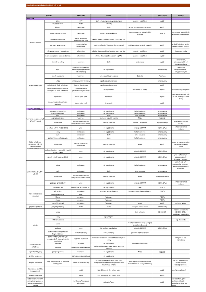 Standard Inwestycji, budynki nr 1,2,3 - zał. nr 3/1 Produkt MATERIAŁ KOLOR TYP PRODUCENT zgodnie z projektem wybór UWAGI ELEWACJA okna PCV biały od wewnątrz, szary na zewnątrz okucia do okien metal strebrny klamka tworzywo biały prosta, na parterze z przyciskiem wybór nawietrzacze w oknach tworzywo w kolorze ramy okiennej higrosterowany, o odpowiedniej akustyce Aereco montowane w sposób nie kolidujący z otwieraniem parapety zewnętrzne blacha powlekana poliestrem gr.0,7mm okleina drewnopodobna lub kolor szary wg. RAL parapety wewnętrzne Postforming lub konglomerat biały (postforming) lub jasny (konglomerat) możliwie małe promienie krawędzi wybór grubość min 3cm, wysięg poza lico ściany ok 6cm rolety zewnętrzne - prowadnice aluminium okleina drewnopodobna lub kolor szary wg. RAL zgodnie z projektem wybór chowane w tynku rolety zewnętrzne - płaszcze do rolet aluminium okleina drewnopodobna/szary wg RAL. zgodnie z projektem wybór skrzynki na rolety tworzywo biały systemowe wybór z ociepleniem, zabudowane GK od strony mieszkania tynk mineralny lub silikatowy malowany farbą silikatową lub silikonową do uzgodnienia renomowany z dodatkami antyporostowymi i antygrzybicznymi panele elwacyjne tworzywo wybór z palety producenta cokoły tynk strukturalny żywiczny zgodnie z dokumentacją renomowany wybór stolarka okienna ściana elewacyjna doświetlenie klatki schodowej ślusarka aluiminiowa zgodnie z dokumentacją okładzina elewacji w parterze, w wejściu do klatki schodowej kamień naturalny, płomieniowany lub poler do uzgodnienia opierzenia blacha tytan cynk rynny, rury spustowe, kosze spustowe Beltecto mocowany na kotwy Plastiwan wybór zabezpieczony antygrafiti tytan cynk wybór mocowana mechanicznie i na klej, zakłady na rąbek leżący blacha tytan cynk tytan cynk wybór ściany do wysokości 2m ściany powyżej 2m sufit osprzęt elektyczny malowane malowane malowany tworzywo do uzgodnienia do uzgodnienia biały kremowy przycisk i ramka farba lateksowa farba lateksowa farba akrylowa Niloe renomowany renomowany renomowany Legrand oświetlenie oprawy natynkowe na kompaktowe źródła światła srebrny lub szary zgodnie z projektem AgaLight - Beryl (sterowane czujkami ruchu) podłoga - płytki 30x30 i 30x60 gres do uzgodnienia kolekcja SIGNUM NOWA GALA cokoły licowane z tynkiem ściany malowane do uzgodnienia farba lateksowa renomowany sufit malowany biały farba akrylowa renomowany policzki biegów schodowych malowane szary farba lateksowa renomowany oświetlenie oprawy natynkowe halogenowe srebrny lub szary wybór wybór podłoga (podesty i spoczniki) - płytki 30x30 i 30x60 gres do uzgodnienia kolekcja SIGNUM NOWA GALA schody - płytki gresowe 30x60 gres do uzgodnienia kolekcja SIGNUM NOWA GALA gres z ryflowanym brzegiem, cokoły licowane z tynkiem pom. Gosp. 1/4 wyposażyć w armaturę i wyposażenie zgodnie z projektem KLATKA SCHODOWA korytarze. np.pom.nr 1/3, 1/5, 1/7 i wyżej klatka schodowa np.pom.nr. 1/2, 1/6 i adekwatnie na wyższych kondygnacjach, pom. nr 1/1`, 1/4, 1/8`, 1/9, 4/6 drzwi wejściowe do mieszkań grzejnik w parterze ściany malowane do uzgodnienia farba lateksowa renomowany sufit malowany biały farba akrylowa renomowany oświetlenie oprawy natynkowe na kompaktowe źródła światła srebrny lub szary wybór np.AgaLight - Beryl podłoga - płytki 30x30 gres do uzgodnienia kolekcja SIGNUM NOWA GALA skrzydło drzwi okleina CPL HQ 0,7 lub PCV do uzgodnienia OPAL PORTA standard wg. producenta kątowa, standard wg.producenta PORTA ościeżnice metalowe opaski zewnętrzne brak klamki metalowe Tytanowy okucia metalowe Tytanowy numerki na drzwi metalowe Tytanowy wybór wybór grzejnik panelowy metal szary podejście dolne ścienne renomowany 3100 schindler SCHINDLER winda ściany PORTA wg. standardu podłoga gres jak podłoga przed windą kolekcja SIGNUM portal windowy na parterze i fragment ściany kamień naturalny kolor piaskowy poler lub płomieniowany kątownik aluminium malowane proszkowo kolorze RAL zbliżonym do ściany NOWA GALA wklejany na klej montażowy do uzgodnienia pochwyt drewniany, drewno klejone pochwyt lakierowany lakierobejcą, kolor do wyboru gongi wejściowe tworzywo do uzgodnienia stal malowana proszkowo do uzgodnienia beton architektoniczny możliwe typy wykończenia: żywica lub zaimpregonowana ryflowana powierzchnia naturalnego betonu drzwiczki do szachtów instalacyjnych metal RAL zbliżony do tła - koloru ścian wybór drzwiczki rewizyjne metal RAL zbliżony do tła - koloru ścian wybór odbojniki drzwiowe lub osłony tworzywowe na ścianach na wysokości klamek nierdzewny/ tworzywo elastyczne osprzęt elektryczny drabiny wyłazowe stopnie schodowe drugi bieg schodów na pierwszą kondygancję możliwa zamiana na KONE lub OTIS w podobnym standardzie na całej wysokości ściany z poręczą ze stali nierdzewnej stalowa balustrada klatki schodowej czcionka wybór np.turin grey lustro portal windowy na wyższych kondygnacjach - zabezpieczenie narożników barierka cokoły licowane z tynkiem PORTA sufit i oświetlenie winda prosta forma np.sześcian, sterowane czujkami ruchu naturalny/jasny malowana proszkowo Niloe Legrand typ mocowania stopni i balustrady do uszczegółowienia. poszczegóne stopnie mocowane wspornikowo do ściany żelbetowej wybór zamykane na kluczyk wszędzie tam, gdzie istnieje możliwość uszkodzenia drzwi lub ściany WIATROŁAP ściany malowane do uzgodnienia farba lateksowa renomowany sufit malowany biały farba akrylowa renomowany podłoga - płytki gresowe 30x30 i 30x60 gres do uzgodnienia kolekcja SIGNUM NOWA GALA układ prosty lub z caro, cokoły licowane z tynkiem oświetlenie oprawy natynkowe halogenowe srebrny lub szary wybór wybór prosta forma np.sześcian, sterowane czujkami ruchu stalowy 1052/100D miwiurmet wersja podtynkowa stalowy wbudowane w płytę G/k pjk z wyciętymi laserowo numerami (standard) domofon skrzynka na listy stal nierdzewna szczotkowana stal nierdzewna szczotkowa