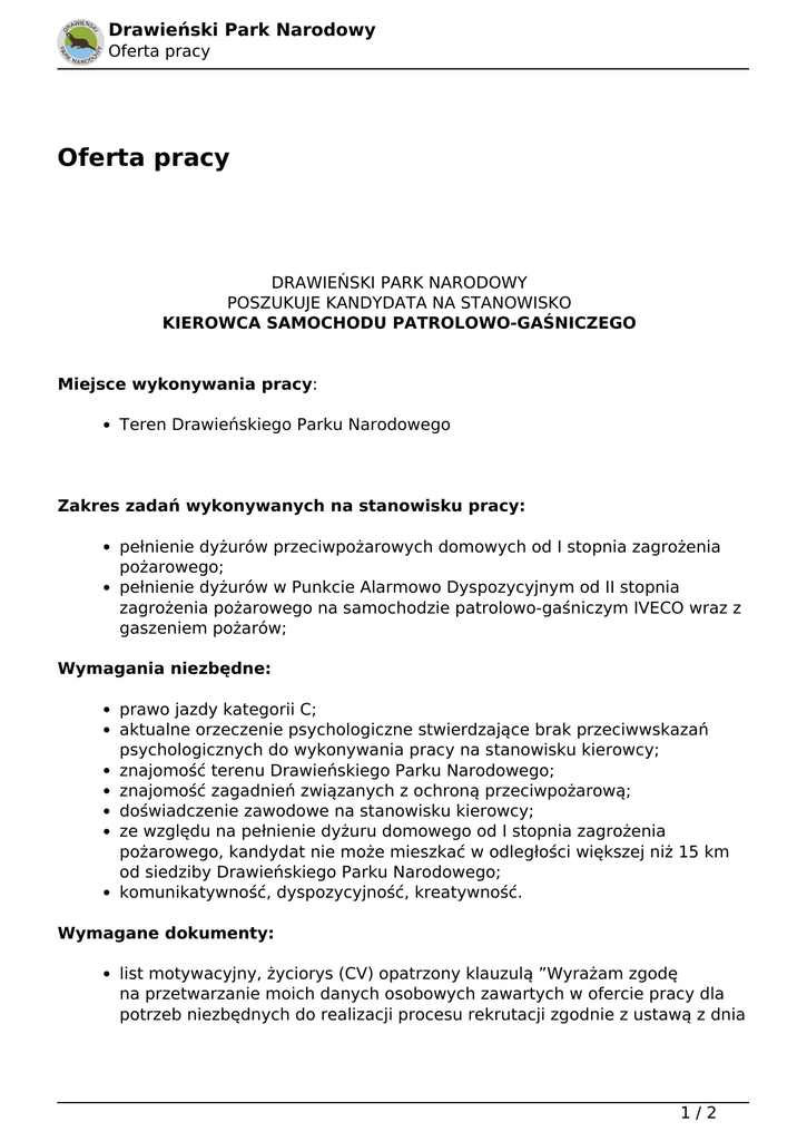 Oferta pracy - Drawieński Park Narodowy