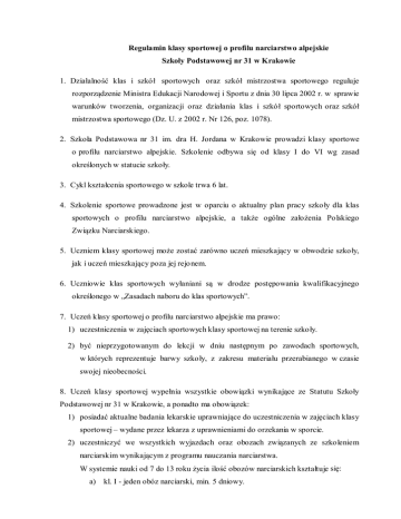 Regulamin klasy sportowej o profilu narciarstwo alpejskie Szkoły Podstawowej nr 31 w Krakowie 1. Działalność klas i szkół sportowych oraz szkół mistrzostwa sportowego reguluje rozporządzenie Ministra Edukacji Narodowej i Sportu z dnia 30 lipca 2002 r. w sprawie warunków tworzenia, organizacji oraz działania klas i szkół sportowych oraz szkół mistrzostwa sportowego (Dz. U. z 2002 r. Nr 126, poz. 1078). 2. Szkoła Podstawowa nr 31 im. dra H. Jordana w Krakowie prowadzi klasy sportowe o profilu narciarstwo alpejskie. Szkolenie odbywa się od klasy I do VI wg zasad określonych w statucie szkoły. 3. Cykl kształcenia sportowego w szkole trwa 6 lat. 4. Szkolenie sportowe prowadzone jest w oparciu o aktualny plan pracy szkoły dla klas sportowych o profilu narciarstwo alpejskie, a także ogólne założenia Polskiego Związku Narciarskiego. 5. Uczniem klasy sportowej może zostać zarówno uczeń mieszkający w obwodzie szkoły, jak i uczeń mieszkający poza jej rejonem. 6. Uczniowie klas sportowych wyłaniani są w drodze postępowania kwalifikacyjnego określonego w „Zasadach naboru do klas sportowych”. 7. Uczeń klasy sportowej o profilu narciarstwo alpejskie ma prawo: 1) uczestniczenia w zajęciach sportowych klasy sportowej na terenie szkoły. 2) być nieprzygotowanym do lekcji w dniu następnym po zawodach sportowych, w których reprezentuje barwy szkoły, z zakresu materiału przerabianego w czasie swojej nieobecności. 8. Uczeń klasy sportowej wypełnia wszystkie obowiązki wynikające ze Statutu Szkoły Podstawowej nr 31 w Krakowie, a ponadto ma obowiązek: 1) posiadać aktualne badania lekarskie uprawniające do uczestniczenia w zajęciach klasy sportowej – wydane przez lekarza z uprawnieniami do orzekania w sporcie. 2) uczestniczyć we wszystkich wyjazdach oraz obozach związanych ze szkoleniem narciarskim wynikającym z programu nauczania narciarstwa. W systemie nauki od 7 do 13 roku życia ilość obozów narciarskich kształtuje się: a) kl. I - jeden obóz narciarski, min. 5 dniowy. b) kl. II, III, IV, V – dwa obozy narciarskie, min. 5 dniowe. c) kl. VI – jeden obóz narciarski, min. 5 dniowy. 3) Systematycznie i aktywnie uczestniczyć w zajęciach sportowych i lekcjach wychowania fizycznego, posiadać strój sportowy odpowiedni do miejsca zajęć. 4) Posiadać odpowiedni sprzęt narciarski tj. kask, odpowiedni ubiór narciarski dostosowany do warunków atmosferycznych, narty sprawdzone w serwisie narciarskim. 5) Reprezentować godnie Szkołę Podstawowa nr 31 w Krakowie we wszystkich imprezach i zawodach sportowych ujętych w programie sportowym szkoły oraz wynikających z programu szkoleniowego i kalendarza imprez sportowych. 6) Znać i przestrzegać Dekalogu Narciarza, przestrzegać poleceń nauczyciela, instruktora w czasie prowadzonych zajęć, nie stwarzać sytuacji zagrażających bezpieczeństwu osób wspólnie ćwiczących. 7) Niezdolność do ćwiczeń udokumentować zwolnieniem, a w przypadku zwolnienia długookresowego (powyżej 14 dni) przedłożyć zwolnienie wydane przez lekarza. O miejscu i terminach obozów decyduje nauczyciel WF prowadzący zajęcia sportowe w danej klasie sportowej. 9. Zasady finansowanie wyjazdów jednodniowych i obozów narciarskich. 1) szczegółowe zasady finansowania jednodniowych wyjazdów narciarskich: a) rodzic/opiekun prawny jest zobowiązany do ponoszenia tzw. kosztów stałych wyjazdu, czyli kosztu wynajmu autokaru oraz kosztu wynajmu instruktorów. b) rodzic/opiekun dziecka biorącego udział w danym wyjeździe dodatkowo zobowiązany jest do uiszczenia kosztu karnetu na stoku. 2) szczegółowe zasady finansowania obozów narciarskich: a) rodzic/opiekun prawny jest zobowiązany do ponoszenia tzw. kosztów stałych obozu, czyli kosztu wynajmu autokaru do miejsca obozu i z powrotem, autokaru dowożącego dzieci na stok w trakcie obozu oraz kosztu wynajmu instruktorów. b) rodzic/opiekun dziecka biorącego udział w danym obozie dodatkowo zobowiązany jest do uiszczenia opłat za karnety, wyżywienie, noclegi i inne koszty przewidziane przez organizatora/kierownika obozu zawarte w preliminarzu obozu. c) w sytuacji wcześniejszego zakończenia obozu (np. choroba dziecka) organizator zwraca koszty pozostałych do końca obozu noclegów oraz karnetów na te dni. 10. Wobec uczenia, który nie stosuje się do powyższego regulaminu podczas zajęć wychowania fizycznego, wyjazdu czy obozu sportowego przewidziane są kary zgodnie ze Statutem Szkoły Podstawowej nr 31 im. dra H. Jordana a ponadto może ponieść karę: 1) pozbawienia prawa reprezentowania szkoły w zawodach sportowych, 2) usunięcia z obozu sportowego lub imprezy sportowej przy jednoczesnym nałożeniu na prawnych opiekunów ucznia obowiązku odebrania dziecka z miejsca jego pobytu na ich koszt i w najkrótszym możliwym terminie, 3) pozbawienia prawa uczestnictwa w obozie narciarskim oraz wyjazdach jednodniowych narciarskich, 4) pozbawienia prawa aktywnego uczestnictwa w zajęciach sportowych, 5) przeniesienia dziecka do klasy równoległej. O nałożeniu wymienionych kar decyduje Dyrektor szkoły w porozumieniu z wychowawcą klasy i nauczycielem WF. 11. Nie spełnia wymogów regulaminu uczeń klasy sportowej który: 1) nie realizuje programu klasy sportowej; 2) nie realizuje obowiązku szkolnego (ucieka z lekcji, wagaruje, często się spóźnia); 3) wulgarnie, agresywnie zachowuje się wobec rówieśników oraz nauczycieli; 4) nie potrafi zmienić i poprawić swojego zachowania; 5) dewastuje mienie szkolne, stosuje przemoc fizyczną wobec kolegów oraz zagraża bezpieczeństwu innych; 6) nie bierze udziału w zawodach sportowych; 7) ma stwierdzoną, przez lekarza specjalistę, niezdolność do uprawiania sportu. Akceptacja w/w regulaminu przez rodziców: Po zapoznaniu się z regulaminem klasy sportowej o profilu narciarstwo alpejskie, w pełni akceptuję jego treść i zobowiązuję się w imieniu mojego dziecka: ……….......................