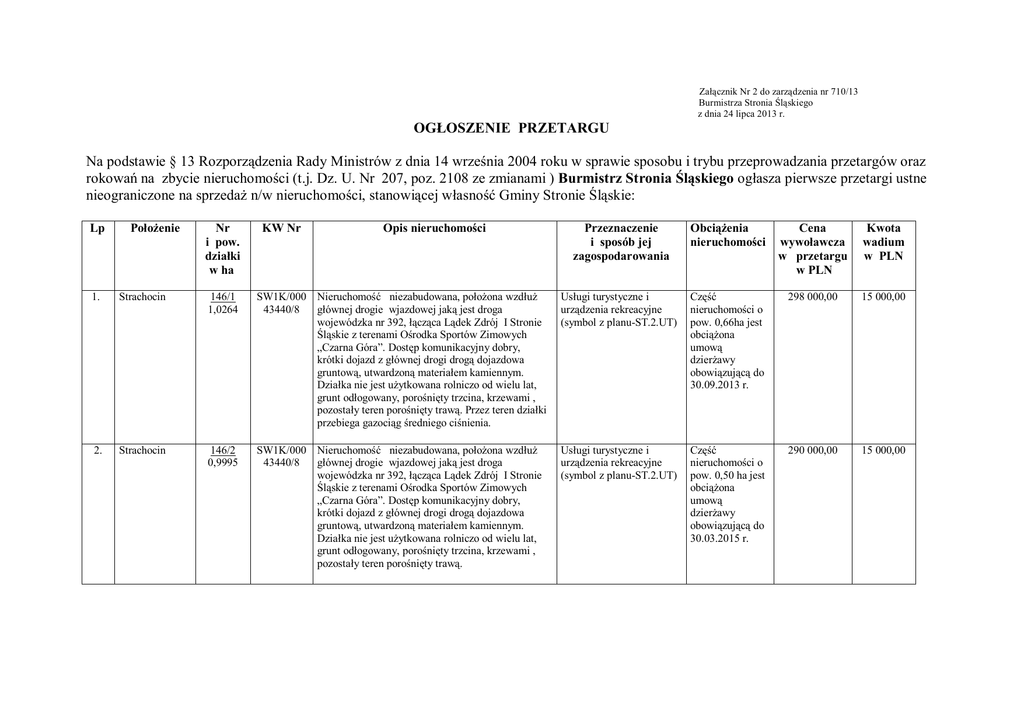 Załącznik Nr 2 do zarządzenia nr 710/13 Burmistrza Stronia Śląskiego z dnia 24 lipca 2013 r. OGŁOSZENIE PRZETARGU Na podstawie § 13 Rozporządzenia Rady Ministrów z dnia 14 września 2004 roku w sprawie sposobu i trybu przeprowadzania przetargów oraz rokowań na zbycie nieruchomości (t.j. Dz. U. Nr 207, poz. 2108 ze zmianami ) Burmistrz Stronia Śląskiego ogłasza pierwsze przetargi ustne nieograniczone na sprzedaŜ n/w nieruchomości, stanowiącej własność Gminy Stronie Śląskie: Lp PołoŜenie Nr i pow. działki w ha KW Nr Opis nieruchomości Przeznaczenie i sposób jej zagospodarowania ObciąŜenia nieruchomości Cena wywoławcza w przetargu w PLN Kwota wadium w PLN 1. Strachocin 146/1 1,0264 SW1K/000 Nieruchomość niezabudowana, połoŜona wzdłuŜ 43440/8 głównej drogie wjazdowej jaką jest droga wojewódzka nr 392, łącząca Lądek Zdrój I Stronie Śląskie z terenami Ośrodka Sportów Zimowych „Czarna Góra”. Dostęp komunikacyjny dobry, krótki dojazd z głównej drogi drogą dojazdowa gruntową, utwardzoną materiałem kamiennym. Działka nie jest uŜytkowana rolniczo od wielu lat, grunt odłogowany, porośnięty trzcina, krzewami , pozostały teren porośnięty trawą. Przez teren działki przebiega gazociąg średniego ciśnienia. Usługi turystyczne i urządzenia rekreacyjne (symbol z planu-ST.2.UT) Część nieruchomości o pow. 0,66ha jest obciąŜona umową dzierŜawy obowiązującą do 30.09.2013 r. 298 000,00 15 000,00 2. Strachocin 146/2 0,9995 SW1K/000 Nieruchomość niezabudowana, połoŜona wzdłuŜ 43440/8 głównej drogie wjazdowej jaką jest droga wojewódzka nr 392, łącząca Lądek Zdrój I Stronie Śląskie z terenami Ośrodka Sportów Zimowych „Czarna Góra”. Dostęp komunikacyjny dobry, krótki dojazd z głównej drogi drogą dojazdowa gruntową, utwardzoną materiałem kamiennym. Działka nie jest uŜytkowana rolniczo od wielu lat, grunt odłogowany, porośnięty trzcina, krzewami , pozostały teren porośnięty trawą. Usługi turystyczne i urządzenia rekreacyjne (symbol z planu-ST.2.UT) Część nieruchomości o pow. 0,50 ha jest obciąŜona umową dzierŜawy obowiązującą do 30.03.2015 r. 290 000,00 15 000,00 3. Strachocin 146/3 1,0704 SW1K/000 Nieruchomość niezabudowana, połoŜona wzdłuŜ 43440/8 głównej drogie wjazdowej jaką jest droga wojewódzka nr 392, łącząca Lądek Zdrój I Stronie Śląskie z terenami Ośrodka Sportów Zimowych „Czarna Góra”. Dostęp komunikacyjny dobry, krótki dojazd z głównej drogi drogą dojazdowa gruntową, utwardzoną materiałem kamiennym. Działka nie jest uŜytkowana rolniczo od wielu lat, grunt odłogowany, porośnięty trzcina, krzewami , pozostały teren porośnięty trawą. Stara Morawa 96 5,2476 Stara Morawa 93/2 2,2476 4. 5. Usługi turystyczne i urządzenia rekreacyjne (symbol z planu-ST.2.UT) Nieruchomość jest wolna od wszelkich długów i zadłuŜeń 308 000,00 16 000,00 SW1K/000 Nieruchomość niezabudowana, połoŜona jest w UŜytki rolne (symbol z 44201/8 granicy miejscowości Stara Morawa i Kletno. Od planu RP) strony północnej i południowej przylega do grunt. Znacznie dłuŜszy dojazd drogami gruntowymi nieutwardzonymi od strony Starej Morawy lub znaczny krótszy dojazd drogą gruntową od strony Kletna. Grunt odłogowany, od dłuŜszego czasu nie uprawniony. Nieruchomość podlega prawu pierwokupu przez Agencję Nieruchomości Rolnych na podstawie art. 3 ust. 4 ustawy z dnia 11 kwietnia 2003 r. o kształtowaniu ustroju rolnego ( Dz. U. Nr 64, poz. 592 ze zmianami). Nieruchomość jest wolna od wszelkich długów i zadłuŜeń 150 000,00 8 000,00 SW1K/000 Nieruchomość niezabudowana, połoŜona jest w 44201/8 centralnej strefie miejscowości. Dostęp komunikacyjny –dojazd do działki z głównej drogi asfaltowej , drogą gruntową. znaczny krótszy dojazd drogą gruntową. Lokalizacja działki jest atrakcyjna z uwagi na walory turystyczno- krajobrazowe oraz zlokalizowane w niewielkiej odległości tereny wypoczynkowo-rekreacyjno-sportowe zgrupowane wokół wyciągu narciarskiego Stacji Narciarskiej Kamienica. Grunt odłogowany, od dłuŜszego czasu nie uprawniony. Nieruchomość jest wolna od wszelkich długów i zadłuŜeń 80 000,00 4 000,00 W części przeznaczona jest pod zabudowę mieszkaniową, jednorodzinną , zabudowę mieszkaniowo-usługową, zabudowę usługową , uŜytki rolne (symbol z planu 20 MNU, RP) 6. Stara Morawa 28 1,4867 SW1K/000 Nieruchomość niezabudowana, połoŜona jest w UŜytki rolne ( symbol z 43444/6 niewielkiej odległości (ok. 250m) od asfaltowej drogi planu RP) łączącej Stronie Śląskie i Bolesławów. Od strony północnej i wschodniej przylega do duŜego kompleksu leśnego, od zachodniej i południowej przylega od innych działek o tym samym przeznaczeniu. Dojazd drogą gruntową utwardzoną materiałem kamiennym, w bardzo dobrym stanie technicznym. Przez teren działki przebiega napowietrzna linia energetyczna średniego napięcia. Przy drodze głównej przebiega kolektor sanitarny i siec wodociągowa. Nieruchomość jest wolna od wszelkich długów i zadłuŜeń 80 000,00 4 000,00 Warunki przetargu : 1. Przetargi odbędą się w dniu 6 września 2013 r. o godz. 13: 30 do 14:15 (co 15 minut wg. kolejności działek) w Urzędzie Miejskim w Stroniu Śląskim przy ul. Kościuszki 55 –pok. nr 17(sala ślubów ). 2. Warunkiem przystąpienia do przetargu jest wpłacenie wadium w pieniądzu z dopiskiem „Przetarg-działka nr …….” gotówką lub przelewem najpóźniej do dnia 2 września 2013 r. na konto Gminy Stronie Śląskie – Gospodarczy Bank Spółdzielczy w Strzelinie O/Stronie Śląskie 10 95880004 0000 1850 2000 0020 - za terminową wpłatę uznaje się datę wpływu na konto Gminy. Wadium wpłacone przez Oferenta, który wygra przetarg zaliczone zostanie na poczet ceny nabycia, a w przypadku uchylenia się przez Oferenta od zawarcia umowy sprzedaŜy, wadium przepada na rzecz Sprzedającego. 3.Oferentow