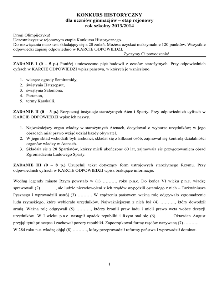 KONKURS HISTORYCZNY dla uczniów gimnazjów – etap rejonowy rok szkolny 2013/2014 Drogi Olimpijczyku! Uczestniczysz w rejonowym etapie Konkursu Historycznego. Do rozwiązania masz test składający się z 20 zadań. Możesz uzyskać maksymalnie 120 punktów. Wszystkie odpowiedzi zapisuj odpowiednio w KARCIE ODPOWIEDZI. Życzymy Ci powodzenia! ZADANIE I (0 – 5 p.) Poniżej umieszczono pięć budowli z czasów starożytnych. Przy odpowiednich cyfrach w KARCIE ODPOWIEDZI wpisz państwa, w których je wzniesiono. 1. 2. 3. 4. 5. wiszące ogrody Semiramidy, świątynia Hatszepsut, świątynia Salomona, Partenon, termy Karakalli. ZADANIE II (0 – 3 p.) Rozpoznaj instytucje starożytnych Aten i Sparty. Przy odpowiednich cyfrach w KARCIE ODPOWIEDZI wpisz ich nazwy. 1. Najważniejszy organ władzy w starożytnych Atenach, decydował o wyborze urzędników; w jego obradach miał prawo wziąć udział każdy obywatel. 2. W jego skład wchodzili byli archonci, składał się z kilkuset osób, zajmował się kontrolą działalności organów władzy w Atenach. 3. Składała się z 28 Spartiatów, którzy mieli ukończone 60 lat, zajmowała się przygotowaniem obrad Zgromadzenia Ludowego Sparty. ZADANIE III (0 – 8 p.) Uzupełnij tekst dotyczący form ustrojowych starożytnego Rzymu. Przy odpowiednich cyfrach w KARCIE ODPOWIEDZI wpisz brakujące informacje. Według legendy miasto Rzym powstało w (1) ………. roku p.n.e. Do końca VI wieku p.n.e. władzę sprawowali (2) ………., ale ludzie niezadowoleni z ich rządów wypędzili ostatniego z nich – Tarkwiniusza Pysznego i wprowadzili ustrój (3) ………. W rządzeniu państwem ważną rolę odgrywało zgromadzenie ludu rzymskiego, które wybierało urzędników. Najważniejszym z nich był (4) ………., który dowodził armią. Ważną rolę odgrywali (5) ………., którzy bronili praw ludu i mieli prawo weta wobec decyzji urzędników. W I wieku p.n.e. nastąpił upadek republiki i Rzym stał się (6) ………. Oktawian August przyjął tytuł princepsa i zachował pozory republiki. Zapoczątkował formę rządów nazywaną (7) ………. W 284 roku n.e. władzę objął (8) ………., który przeprowadził reformy państwa i wprowadził dominat. 1 ZADANIE IV (0 – 10 p.) Przeczytaj poniższe biogramy władców. Przy odpowiednich cyfrach w karcie odpowiedzi wpisz imię i przydomek (nazwisko) osoby, o której mowa. 1. Król Babilonii, żył w XVIII w. p.n.e., wydał słynny zbiór praw, stworzył imperium na terenie Mezopotamii. 2. Król Macedonii, syn Filipa II, żył w IV w. p.n.e., poprowadził wyprawę przeciwko państwu perskiemu i podporządkował sobie jego terytorium. 3. Pierwszy cesarz rzymski, żył na przełomie I w. p.n. e. i I w. n.e., wnuk siostry i adoptowany syn Cezara, pokonał w wojnie domowej Marka Antoniusza. 4. Żył w V wieku, od 527 roku cesarz bizantyński, zlecił sporządzenie zbioru praw zwanego Korpusem Prawa Cywilnego, podbił państwo Wandalów w Afryce i Ostrogotów w Italii. 5. Najznakomitszy władca z dynastii karolińskiej, żył na przełomie VIII i IX wieku, w 800 roku koronowany przez papieża na cesarza, uważany za „ojca Europy”. 6. Cesarz rzymski narodu niemieckiego, żył w II poł. X wieku, zmarł mając 22 lata, pragnął wskrzesić Imperium Rzymskie, był gościem Bolesława Chrobrego na zjeździe gnieźnieńskim. 7. Żył w XI wieku, książę Normandii, od 1066 król Anglii, pokonał wojska Harolda II pod Hastings, po stłumieniu buntu baronów anglosaskich osadzał na ich ziemiach rycerstwo normandzkie. 8. Żył w latach 1672 – 1725, rządy objął w wieku 17 lat, w 1721 roku przyjął tytuł imperatora Wszechrosji, założył Sankt Petersburg, który stał się nową stolicą, za jego panowania nastąpił dynamiczny rozwój Rosji. 9. Król Francji w latach 1774 – 1792, za jego panowania miała wybuchła rewolucja, w wyniku której obalono rządy absolutne i wprowadzono republikę, został stracony na gilotynie w 1793 roku. 10. Żył w latach 1769 – 1821, od 1804 roku cesarz Francuzów; wybitny polityk, generał, w trakcie wojen prowadzonych na początku XIX wieku pokonał mocarstwa europejskie, decyzją Kongresu Wiedeńskiego zesłany na Wyspę św. Heleny, gdzie przebywał aż do śmierci. ZADANIE V (0 – 5 p.) Rozwiąż krzyżówkę dotyczącą stosunków feudalnych znajdującą się w KARCIE ODPOWIEDZI. 1. 2. 3. 4. 5. Człowiek wolny oddający się w opiekę, zobowiązujący się do posłuszeństwa i służby wojskowej. Władca, najwyższy senior w państwie. Obowiązkowe świadczenie w naturze lub pieniądzu na rzecz pana feudalnego. Ceremonia nadania lenna. Możny przyjmujący obowiązek opieki i przekazujący ziemię pod uprawę. ZADANIE VI (0 – 5 p.) Wskaż przedziały czasu (1,2,3,4,5), w których powstały następujące religie i wyznania: kalwinizm, chrześcijaństwo, islam, prawosławie, judaizm. Do KARTY ODPOWIEDZI przy nazwach religii wpisz odpowiednie cyfry. 1 XV 2 X V w. p.n.e. 1 3 V 2 4 X w. n.e. 5 XV XX ZADANIE VII (0 – 5 p.) Poniżej znajduje się pięć zdań dotyczących stylów architektonicznych. Przeczytaj je uważnie i oceń, które z nich są prawdziwe, a które fałszywe. Następnie przy odpowiednich cyfrach w KARCIE ODPOWIEDZI wpisz odpowiednio słowo „prawda” lub „fałsz”. 1. Styl romański charakteryzował się grubymi murami i małymi oknami zakończonymi łukami półpełnymi. 2. Manieryzm był kontynuacją stylu barokowego w architekturze. 3. Styl klasycystyczny jest charakterystyczny dla architektury europejskiej XVII wieku. 4. Strzeliste wieże, wąskie, długie okna zakończone ostrymi łukami były charakterystyczne dla stylu gotyckiego. 5. Styl barokowy w architekturze nawiązywał do budowli starożytnej Grecji. ZADANIE VIII (0 – 6 p.) Przeczytaj uważnie poniższy tekst źródłowy, następnie korzystając z informacji z tekstu i własnej wiedzy w KARCIE ODPOWIEDZI odpowiedz na pytania znajdujące się pod tekstem. Dykta