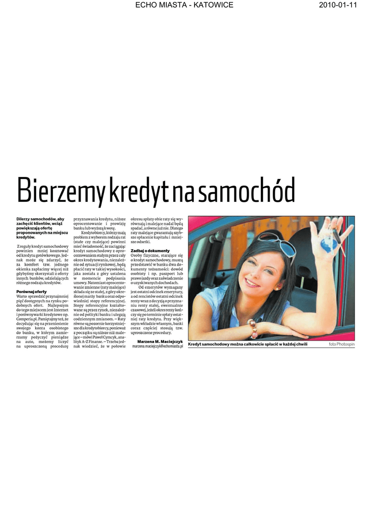ECHO MIASTA - KATOWICE 2010-01-11 Bierzemy kredyt na samochód Dilerzy samochodów, aby zachęcić klientów, wciąż powiększają ofertę proponowanych na miejscu kredytów. Z reguły kredyt samochodowy powinien mniej kosztować od kredytu gotówkowego. Jed nak może się zdarzyć, że za komfort tzw. jednego okienka zapłacimy więcej niż gdybyśmy skorzystali z oferty innych banków, udzielających różnego rodzaju kredytów. Porównaj oferty Warto sprawdzić przynajmniej pięć dostępnych na rynku po dobnych ofert. Najlepszym do tego miejscem jest Internet i porównywarki kredytowe np. Comperia.pl. Pamiętajmy też, że decydując się na przeniesienie swojego konta osobistego do banku, w którym zamie rzamy pożyczyć pieniądze na auto, możemy liczyć na uproszczoną procedurę przyznawania kredytu, niższe oprocentowanie i prowizję banku lub wyższą kwotę. Kredytobiorcy, którzy mają problem z wyborem rodzaju rat (stałe czy malejące) powinni mieć świadomość, że zaciągając kredyt samochodowy z opro centowaniem stałym przez cały okres kredytowania, niezależ nie od sytuacji rynkowej, będą płacić raty w takiej wysokości, jaka została z góry ustalona w momencie podpisania umowy. Natomiast oprocento wanie zmienne (raty malejące) składa się ze stałej, z góry okre ślonej marży banku oraz odpo wiedniej stopy referencyjnej. Stopy referencyjne kształto wane są przez rynek, niezależ nie od polityki banku i ulegają codziennym zmianom. - Raty równe są pozornie korzystniej sze dla kredytobiorcy, ponieważ z początku są niższe niż male jące - mówi Paweł Cymcyk, ana lityk A-Z Finanse. - Trzeba jed nak wiedzieć, że w połowie okresu spłaty obie raty się wy równają i malejące nadal będą spadać, a równe już nie. Dlatego raty malejące gwarantują szyb sze spłacenie kapitału i mniej sze odsetki. VH Zadbaj o dokumenty Osoby fizyczne, starające się o kredyt samochodowy, muszą przedstawić w banku dwa do kumenty tożsamości: dowód osobisty i np. paszport lub prawo jazdy oraz zaświadczenie o uzyskiwanych dochodach. Od emerytów wymagany jest ostatni odcinek emerytury, a od rencistów ostatni odcinek renty wraz z decyzją o przyzna niu renty stałej, ewentualnie czasowej, jeżeli okres renty koń czy się po terminie spłaty ostat niej raty kredytu. Przy więk szym wkładzie własnym, banki coraz częściej stosują tzw. uproszczone procedury. Marzena M. Maciejczyk [email protected] : Kredyt samochodowy można całkowicie spłacić w każdej chwili fotoPhotospin