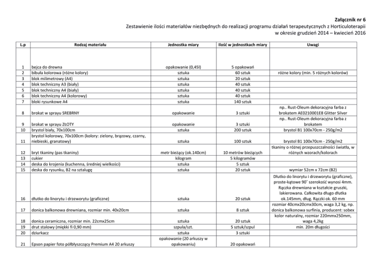 Załącznik nr 6 Zestawienie ilości materiałów niezbędnych do realizacji programu działań terapeutycznych z Horticuloterapii w okresie grudzień 2014 – kwiecień 2016 L.p Rodzaj materiału Jednostka miary Ilość w jednostkach miary opakowanie (0,45l) sztuka sztuka sztuka sztuka sztuka sztuka 5 opakowań 60 sztuk 20 sztuk 40 sztuk 40 sztuk 40 sztuk 140 sztuk 1 2 3 4 5 6 7 bejca do drewna bibuła kolorowa (różne kolory) blok milimetrowy (A4) blok techniczny A3 (biały) blok techniczny A4 (biały) blok techniczny A4 (kolorowy) bloki rysunkowe A4 8 brokat w sprayu SREBRNY opakowanie 3 sztuki 9 10 opakowanie sztuka 3 sztuki 200 sztuk 11 brokat w sprayu ZŁOTY brystol biały, 70x100cm brystol kolorowy, 70x100cm (kolory: zielony, brązowy, czarny, niebieski, granatowy) sztuka 100 sztuk 12 13 14 15 bryt tkaniny (pas tkaniny) cukier deska do krojenia (kuchenna, średniej wielkości) deska do rysunku, B2 na sztalugę metr bieżący (ok.140cm) kilogram sztuka sztuka 10 metrów bieżących 5 kilogramów 5 sztuk 20 sztuk 16 dłutko do linorytu i drzeworytu (graficzne) sztuka 20 sztuk 17 donica balkonowa drewniana, rozmiar min. 40x20cm sztuka 8 sztuk 18 19 20 donica ceramiczna, rozmiar min. 22cmx25cm drut stalowy (miękki fi 0,90 mm) dziurkacz 20 sztuk 5 sztuk/szpul 3 sztuki 21 Epson papier foto półbłyszczący Premium A4 20 arkuszy sztuka szpula/szt. sztuka opakowanie (20 arkuszy w opakowaniu) 20 opakowań Uwagi różne kolory (min. 5 różnych kolorów) np.. Rust-Oleum dekoracyjna farba z brokatem AE0210001E8 Glitter Silver np.. Rust-Oleum dekoracyjna farba z brokatem brystol B1 100x70cm - 250g/m2 brystol B1 100x70cm - 250g/m2 tkaniny o różnej przepuszczalności światła, w różnych wzorach/kolorach wymiar 52cm x 72cm (B2) Dłutko do linorytu i drzeworytu (graficzne), proste-kątowe 90˚ szerokość wynosi 4mm. Rączka drewniana w kształcie gruszki, lakierowana. Całkowita długo dłutka ok.145mm, dług. Rączki ok. 60 mm rozmiar 40cmx20cmx30cm, waga 3,2 kg, np. donica balkonowa surfinia, producent: sobex kolor naturalny, rozmiar 220mmx250mm, waga 4,2kg min. 20m długości 22 23 24 25 26 27 farba akrylowa w tubce - min. 10 kolorów farby akwarelowe (zestaw min.12 kolorów) farby do drewna (różne kolory, min.10) flamastry (w komplecie min. 4 kolory) folia aluminiowa, 20m gąbka do naczyń 100 ml/tubka komplet (min. 12 kolorów) opakowanie (0,25l) sztuka (4 szt. w opakowaniu) opakowanie (20m) sztuka (10 szt. W opakowaniu) 600 sztuk 40 sztuk 10 opakowań 40 opakowań 5 opakowań 10 opakowań 28 29 30 31 32 33 34 35 36 37 gąbka florystyczna gips ceramiczny glina gorczyca gotowe półfabrykaty drewniane (do złożenia) grabie groch grys biały / żwir ogrodowy gumka do mazania gumki chlebowe sztuka kilogram kilogram, (opakowanie 10kg) 0,5kg/opakowanie sztuka sztuka kilogram opakowanie (22kg) sztuka sztuka opakowanie/50 szt. różnej wielkości komplet (550szt.różnego rodzaju) arkusz 20 sztuk 40 kilogramów 3 opakowania po 10kg 5 opakowań (po 0,5kg) 30 sztuk 5 sztuk 10 kilogramów 1 opakowanie 20 sztuk 20 sztuk 38 39 40 guziki różnej wielkości gwoździe (różnej wielkości) kalka techniczna 41 Kamiennie płaskie (otoczaki) duże opakowanie (10kg) 1 opakowanie 42 43 44 Kamiennie płaskie (otoczaki) małe karimata kartki papieru białego (ksero) opakowanie (10kg) sztuka opakowanie - 500szt. 1 opakowanie 20 sztuk 5 opakowań 45 46 47 48 49 50 51 karton klapowy do składania katalog roślin ogrodowych (min. 2 różne wydania) klej do kamienia klej do papieru w sztyfcie klej WIKOL w tubce, 40 ml klipsy do mocowania papieru do sztalugi knot do świec min. gr. 2,5mm (lub sznurek bawełniany) sztuka sztuka opakowanie (15kg) sztuka 40ml/opakowanie sztuka szpula 20 sztuk 2-3 sztuki 1 opakowanie 80 sztuk 40 opakowań 50 sztuk 4 szpule 52 53 54 kombinerki konewka kosz na kwiaty, wiklinowy sztuka sztuka sztuka 5 sztuk 5 sztuk 10 sztuk 5 opakowań 5 kompletów 20 arkuszy szeroka paleta barw (kolory podstawowe + kolory natury), każdy z 10 kolorów po 60 szt. (po 3 tubki na uczestnika) kształt: cegła (piankowa), wymiary pianek 23x11 cm, wysokość 8 cm (rozmiar, min. 30cmx30cm) min. 20kg w opakowaniu komplet FIXA, 550 szt. min. 10kg, kolorowe lub jednobarwne wg uznania min. 10kg, kolorowe lub jednobarwne wg uznania Rozmiar: 395x300x340mm Klapowy najbardziej popularny 2 szt. na sztalugę szczypce uniwersalne 200mm, np. typ SILVERSTAR SV40012 kształt dowolny 55 56 57 58 59 kuweta malarska, poj. 1l lakier do drewna lakier ochronny do drewna lampa ze światłem białym linka ekspozycyjna 60 61 62 63 64 65 66 łańcuch żarówek (Oświetlenie ogrodowe led, żarówki, łańcuch) łopata małe śrubki z oczkiem lub opakowanie spinaczy na zawieszki marker permanentny czarny okrągła końcówka młotek ciesielski naczynie szklane, 4l nakrętki na słoiki (białe lub złote) 67 68 69 70 71 72 73 narzędzia rolnicze, drewniane, małe nasiona (różne rodzaje) nawozy do zasilania nożyczki nóż do tapet, 18mm obudowa gliniana do zniczy ocet 74 75 sztuka litr (w opakowaniu 2,5l) opakowanie (0,8l) sztuka metr 5 sztuk 5 opakowań 4 opakowania sztuka 12 metrów sztuka/1 łańcuch sztuka sztuka sztuka sztuka sztuka opakowanie (100szt.) 5 łańcuchów 5 sztuk 100 sztuk 40 sztuk 5 sztuk 5 sztuk 1 opakowanie sztuka (4 szt. w zestawie) 0,01kg/opakowanie kilogram/opakowanie sztuka sztuka sztuka litr 4 zestawy 100 opakowań 10 opakowań 20 sztuk 5 sztuk 40 sztuk 3 litry pastele olejne- opakowanie min. 24 kolory ołówek opakowanie (24 kolory) sztuka 76 77 78 papier kolorowy do pakowania prezentów papier pakowy szary w arkuszach papier samoprzylepny A4 biały 100szt. nacięty rolka 100 szt. w opakowaniu opakowanie/100szt. 40 opakowań 40 sztuk 10 rolek w różnych kolorach 20 opakowań 1 opakowanie 79 80 81 82 papier ścierny (arkusz) parafina kosmetyczna - BEZZAPACHOWA 400ml klej do butów Pattex pędzel nylonowy płaski szeroki 5 cm sztuka/arkusz opakowanie 400ml 50 ml/opakowanie sztuka 20 arkuszy 40 opakowa