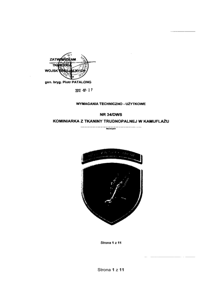 Strona 1 z 11 1. RYSUNEK MODELOWY/ZDJĘCIE. 2. OPIS OGÓLNY WYROBU. 1. Kominiarka wykonana z dzianiny trudnopalnej zapewnia częściową ochronę termiczną i ogniową w temperaturze do 400oC. 2. Kominiarka posiada jeden otwór, jest dopasowana, nie ogranicza ruchów głowy a czynność zakładania nie przysparza trudności, nie ogranicza pola widzenia i nie przeszkadza w prawidłowym wykonywaniu działań. 3. Wytrzymałość termiczna elementów konstrukcyjnych (szwy) jest taka sama jak głównego materiału konstrukcyjnego. 4. Kominiarka wytwarzana jest w jednym uniwersalnym rozmiarze. 5. Konstrukcja splotu materiału konstrukcyjnego nie osłabia odporności termicznej 6. kominiarki po rozciągnięciu oraz nie posiada żadnych szczelin i otworów przy szwach. 7. Kominiarka zachowuje właściwości ochronne i walory estetyczno-funkcjonalne przez okres dwóch lat. 8. Kominiarka wykonana jest z dzianiny trudnopalnej w kamuflażu typu multicam. Strona 2 z 11 3. WYMAGANIA TECHNICZNE. 3.1 Wykaz materiałów zasadniczych i dodatków Lp. Rodzaj materiału i dodatku 1 Dzianina zasadnicza 2 Nici odzieżowe 3 Taśma do lamowania Typ, rodzaj, charakterystyka materiału dzianina trudnopalna w kamuflażu typu multicam nici z włókien meta-aramidowych odcinkowych, o masie liniowej (35 ± 5) tex i minimalnej średniej sile zrywającej 8 N, w kolorze dzianiny zasadniczej trudnopalna taśma elastyczna w kolorze dzianiny zasadniczej o szerokości 2,5 cm 3.2 Charakterystyka dzianiny Lp. 1 Rodzaj parametru Skład surowcowy dzianiny zasadniczej Jednostka miary Wartość parametru Oznaczenie i metoda badania wg Modacryl MAC PN-P-01703:1996 PN-P-04847-01:1993 PN-P-04847-06:1993 PN-P-04847-10:1993 % Wiskoza CV (FR) EL 2 Masa liniowa przędzy wiążącej 3 Masa liniowa przędzy okrywy ( nitki pluszowej ) 4 Liczba rządków 78 dtex f 24 Tt 84 dtex f 48 23,4 1,2 13,4 0,3 252 13 liczba/cm 5 Liczba kolumienek 6 Masa powierzchniowa dzianiny 7 8 9 10 Splot dzianiny zasadniczej Zmiana wymiarów kierunek po praniu w wzdłużny temperaturze 40 C, kierunek nie więcej niż: poprzeczny Wytrzymałość na przebicie kulką, nie mniej niż: Grubość dzianiny 11. Zapalenie powierzchniowe 11.1 próbki bez prania kierunek wzdłużny i próbki pięciokrotnie g/m PN-EN 14971:2007 2 - PN-ISO 1139:1998 PN-P-04653:1997 rządkowy lewoprawy - podstawowy, z nitką pluszową na lewej stronie dzianiny 3 % 3 daN mm 22 2,00 0,1 PN-P-04613:1997 PN-EN ISO 4921:2002 PN-EN ISO 8388:2005 p. 3.1.16 PN-EN ISO 5077:2011 PN-EN ISO 6330:2002+A1:2011 procedura 6A PN-EN ISO 9073-5:2008 PN-EN ISO 5084:1999 Odporność na zapalenie żadna próbka nie powinna palić się do górnej krawędzi ani żadnej z krawędzi bocznych, w żadnej próbce nie powinna powstać dziura, Strona 3 z 11 PN-EN ISO 15025:2005 pranej kierunek poprzeczny kierunek wzdłużny Zapalenie dolnej krawędzi próbki bez prania i 11.2 próbki pięciokrotnie pranej kierunek poprzeczny w żadnej próbce nie powinien powstać płomień ani stopione szczątki, czas następczego spalania płomieniowego powinien wynosić 0s, czas następczego żarzenia powinien wynosić 0 s. żadna próbka nie powinna palić się do górnej krawędzi ani żadnej z krawędzi bocznych, w żadnej próbce nie powinna powstać dziura, w żadnej próbce nie powinien powstać płomień ani stopione szczątki, czas następczego spalania płomieniowego powinien wynosić 0s, czas następczego żarzenia powinien wynosić 0 s. Odporność na ciepło 12. Zmiana wyglądu próbek (bez prania) po ogrzewaniu gorącym powietrzem Zmiana wymiarów kierunek próbek (bez prania) wzdłużny 12.2 po ogrzewaniu . gorącym powietrzem, kierunek poprzeczny nie więcej niż: brak zmiany wyglądu 12.1 13 3 Odporność wybarwień, (dla dzianiny w kolorze khaki i czarny) nie mniej niż: 13.1 światło 13.2 % PN-EN 469:2006 zmiana barwy stopień zmiana barwy pranie w temperaturze 40 C zabrudzenie bieli bawełny stopień PN-EN ISO 105B02:2006 4 4 PN-ISO105-C06:2010 metoda A1S 4 zmiana barwy 4 PN-EN ISO zabrudzenie 105-E04:2011 4 bieli bawełny zabrudzenie 13.4 tarcie suche stopień 4 bieli bawełny PN-EN ISO 105-X12:2005 zabrudzenie 13.5 tarcie mokre stopień 4 bieli bawełny Charakterystyka wykonania dzianiny obejmuje następujące etapy: dzianie, specyfikacji technicznej 14 barwienie, drapanie, strzyżenie i nanoszenie apretury wykończającej. producenta 13.3 pot 15 Odczyn – pH 16 Zawartość formaldehydu, nie więcej niż: stopień mg/kg 4,0 7,5 150 4. OPIS WYKONANIA. Proces produkcji kominiarki składa się z następujących etapów: krojenie dzianiny; lamowanie otworu na oczy; lamowanie dołu kominiarki; Strona 4 z 11 PN-EN ISO 3071:2007 PN-EN ISO 14184-1:2011 zszywanie kominiarki ściegiem krytym; szycie całości ściegiem ozdobnym prawej i lewej strony; mocowanie końcówek ściegu ozdobnego ; usuwanie zbędnych nici; prasowanie; kontrola jakości; dołączanie etykiety wyrobu; pakowanie w woreczki foliowe; pakownie w kartony zbiorcze. Wymagane jest złożenie wraz z ofertą oświadczenia wystawionego przez oferenta o zgodności parametrów oferowanego produktu z zapisami zawartymi w WTU oraz wyników badań laboratoryjnych dzianiny wykonanych w laboratorium posiadającym akredytację PCA. Okres i warunki gwarancji udzielone przez Wykonawcę na wyrób określa umowa. W celu oceny zgodności przedmiotu oferty z wymaganiami Zamawiającego, wraz z ofertą należy przedstawić jako wzór jedną sztukę kominiarki z tkaniny trudnopalnej w kamuflażu typu mulicam. 5. RYSUNKI KONSTRUKCYJNE C Strona 5 z 11 D E A B 6. WYMIARY STAŁE WYROBU GOTOWEGO. Wyszczególnienie wymiarów Wymiar Dopuszczalne odchylenie Oznaczenie wymiarów na zdjęciu Długość kominiarki 32,0 cm 0,5 cm A Szerokość dołu kominiarki 20,0 cm 0,5 cm B Szerokość pod otworem kominiarki 23,0 cm 0,5 cm C Szerokość nad otworem kominiarki 18,0 cm 0,5 cm D Wysokość otworu kominiarki 4,5 cm 0,3 cm E 7. CECHOWANIE I PAKOWANIE. 1. Konserwacja środki do konserwacji i ut
