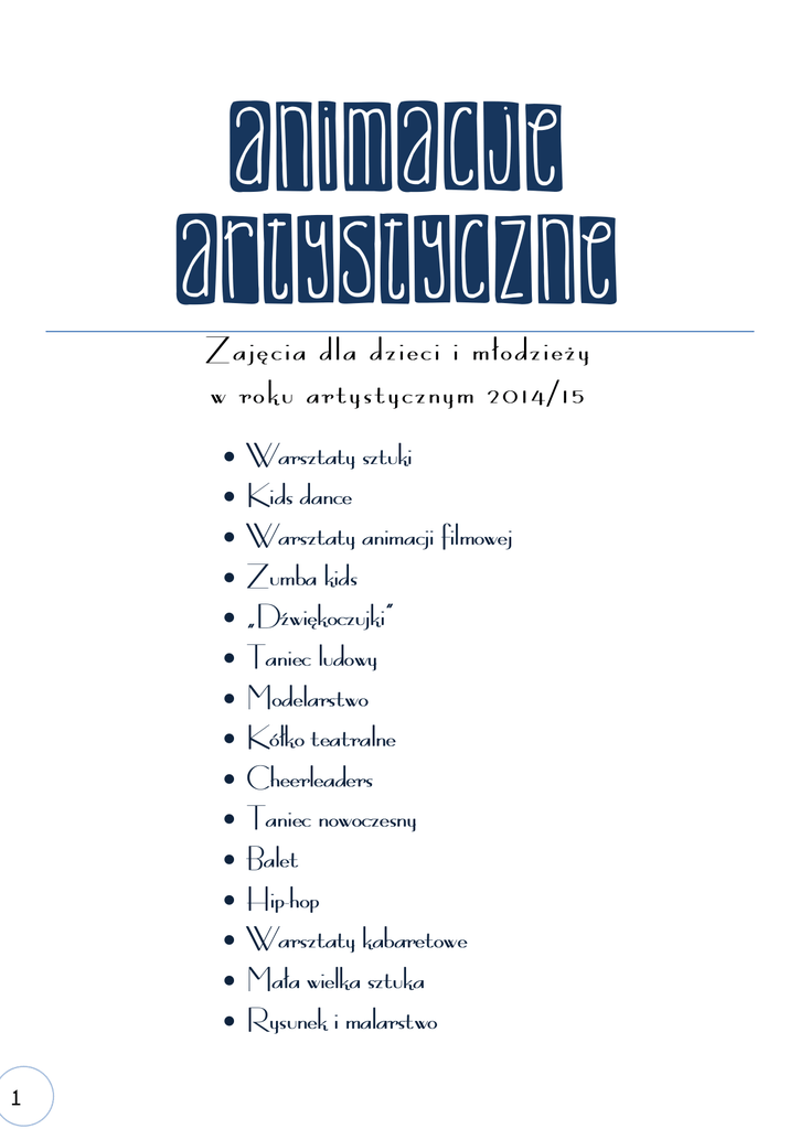 Animacje artystyczne Zajęcia dla dzieci i młodzieży w roku artystycznym 2014/15 Warsztaty sztuki Kids dance Warsztaty animacji filmowej Zumba kids „Dźwiękoczujki” Taniec ludowy Modelarstwo Kółko teatralne Cheerleaders Taniec nowoczesny Balet Hip-hop Warsztaty kabaretowe Mała wielka sztuka Rysunek i malarstwo 1 Warsztaty sztuki prowadząca: Magdalena Pustoła wiek uczestników: 6-12 lat zajęcia bezpłatne, uczestnicy pracują na własnych materiałach Podczas zajęć dzieci poznają nowe techniki plastyczne, mają możliwość szlifowania swojego talentu oraz podstawowej wiedzy z zakresu historii sztuki. Magdalena Pustoła Kids Dance (grupa początkująca) prowadząca: Kaja Łuczak wiek uczestników: 6-11 lat (zajęcia odbywają się w podziale na grupy wiekowe) zajęcia płatne: 20 zł/mc Zapraszamy do zabawy tańcem. Wspólnie będziemy poznawać magiczny świat sceny. Nauczymy się opowiadać historie naszymi ciałami. Poznamy podstawy jazzu, hip-hopu, disco dance. Zagramy wyjątkowe role w show-dance. Nauczymy się pracy w grupie, aby w przyszłości móc osiągać sukcesy na scenie. Z naszych zajęć wyniesiecie odwagę, kreatywność i pasję. Taniec stanie się Waszym najwspanialszym hobby. Kaja Łuczak Warsztaty animacji filmowej prowadzący: Hubert Gadomski Wiek: od 10 lat oraz młodzież zajęcia płatne: 30 zł/mc Pomysły do zrealizowania: podróżniczy blog internetowy poświęcony przygodom głównego bohatera w kilkunastu wybranych miejscach świata – realizujemy wybrane tematy w oparciu o dostępne w internecie źródła wiedzy na dany temat, przygotowujemy charakterystykę miejsca, miasta, kultura, język, zabytki, bio animacja – rosnąca roślina, kwiat – od ziarenka do pięknego kwiatu rosnącego gdzieś w trawie, ciąg dalszy bio animacji – przedstawiamy więdnącą roślinę, z wykorzystaniem prawdziwego kwiatka, historia piaskiem rysowana, a raczej na piasku – tło rysowane na piachu, pozostałe obiekty zbudowane przez uczestników, historia kutra rybackiego który wyławia złotą rybkę, lub dzieci pływających na materacach, opracowanie szczegółowej postaci do pracy nad doskonaleniem płynności ruchu – krótki film przedstawiający np. muzyka lub aktora na scenie, jest kurtyna, mikrofon, zadania domowe – przy użyciu dostępnego aparatu lub telefonu tworzymy krótką animację z wykorzystaniem wiedzy dot. zasad tworzenia filmu. Wstępny podział zadań w oparciu o ustalony wyżej harmonogram. 2 1 zajęcia – poznajemy się, przypominamy sobie zasady dotyczące tworzenia filmu, co to jest stopmotion, kilka filmików inspirujących, - do domu – każdy wymyśla temat filmu, określa fabułę i sposób realizacji 2 zajęcia – wybieramy temat spośród zgłoszonych propozycji, wszystkie omawiamy i poznajemy szczegóły, prezentuję swoje tematy, jeśli będzie potrzeba, spisujemy listę potrzebnych rzeczy do realizacji 3 zajęcia – tworzymy storyboard, jaki podkład dźwiękowy, muzyka 4 zajęcia – omawiamy rozdział zadań w oparciu o storyboard, doprecyzowujemy storyboard. 5 zajęcia – przystępujemy do realizacji zadań, pracujemy w grupach, budujemy poszczególne sceny i postacie. 6 zajęcia – gotowa scenografia, bohaterowie, rozpoczynamy zdjęcia do filmu – podział prac i zadań między uczestników. 7 zajęcia – projektor, ekran, komputer – poznajemy zasady i sposób montażu filmu w oparciu o bezpłatne oprogramowanie Blender. 8 zajęcia – prezentacja skończonego projektu filmowego, świętujemy Tematyka poszczególnych zajęć może zostać przesunięta na kolejne terminy, w zależności od potrzeb i tempa pracy grupy. Hubert Gadomski Zumba Kids prowadzący: Ewelina Kaska-Łobodowska wiek uczestników: od 4 lat zajęcia płatne: 20 zł ZUMBA KIDS – to Zumba Fitness dla dzieci. Zajęcia te zacierają granicę pomiędzy fitness'em a rozrywką. Młodzi tancerze mają możliwość wkroczenia w świat fitness’u dzięki wspaniałej zabawie, muzyce i atmosferze jaka panuje na zajęciach! ZUMBA dla dzieci promuje zdrowy tryb życia u dzieci i uczy szacunku, pracy zespołowej, odpowiedzialności i zaufania. Podczas zajęć dzieci uczą się tańca, koordynacji, równowagi, kształtują i rozwijają kreatywność, dyscyplinę oraz pamięć! ZUMBA dla dzieci to połączenie Zumba Fitness (Salsa, Cumbia, Reggaeton, Hip-Hop i innych tańców) i treningu mającego na celu zapewnienie dzieciom maximum zabawy i fitness'u w tym samym czasie. Są to zajęcia bezpieczne i skuteczne. Ewelina Kaska-Łobodowska Studio wokalne „Dźwiękoczujki” prowadzący: Justyna Kowynia-Rymanowska, Mariusz Szeląg grupa młodsza: dzieci z przedszkoli oraz klas I-III grupa starsza: od IV klasy szkoły podstawowej zajęcia bezpłatne Zajęcia wokalne prowadzone są od momentu powstania Centrum. Dźwiękoczujki, te starsze i młodsze zdobywały wiele nagród na rozmaitych konkursach i przeglądach piosenki. Trudno sobie wyobrazić jakąkolwiek uroczystość czy święto w Mrozach bez udziału śpiewających dzieciaków. Zawsze uśmiechnięte i radosne, bo obcowanie z muzyką, śpiew i taniec dają mnóstwo pozytywnej energii. Hasło „śpiewać każdy może” moglibyśmy przerobić na: „W Dźwiękoczujkach każdy może 3 śpiewać dobrze”, bo nawet jak niezbyt mu wychodzi, to u nas na pewno się nauczy, znakomicie się przy tym bawiąc. Dźwiękoczujki – czułe na dźwięki, U nas tylko najlepsze piosenki! Mariusz Szeląg Taniec ludowy prowadzący: Anna Pieniak grupa młodsza: dzieci ze szkoły podstawowej grupa starsza: młodzież zajęcia bezpłatne Zajęcia w roku kulturalnym 2014/15 odbywać się będą podobnie jak w latach ubiegłych, w dwóch grupach: młodszej dla uczniów szkoły podstawowej i starszej dla uczniów gimnazjum i liceum. W ramach zajęć uczymy się i doskonalimy kroki, figury i układy tańców narodowych: Polonez, Mazur, Krakowiak i Kujawiak. Poznajemy także tańce ludowe z wielu regionów naszego kraju. W